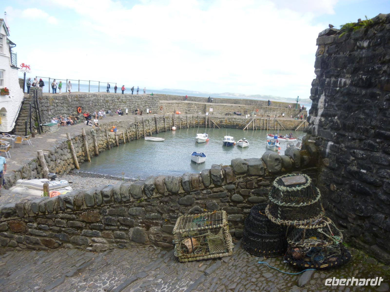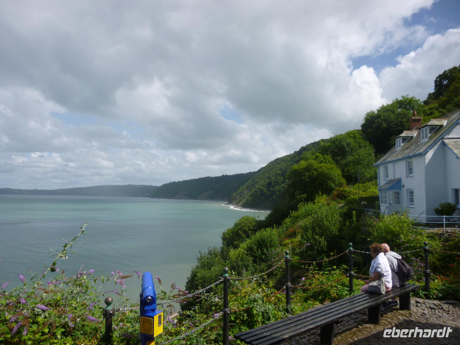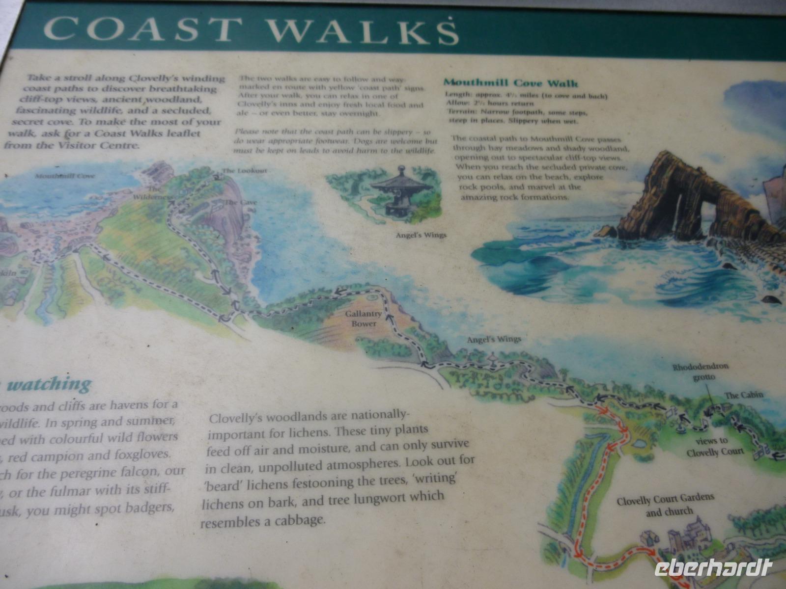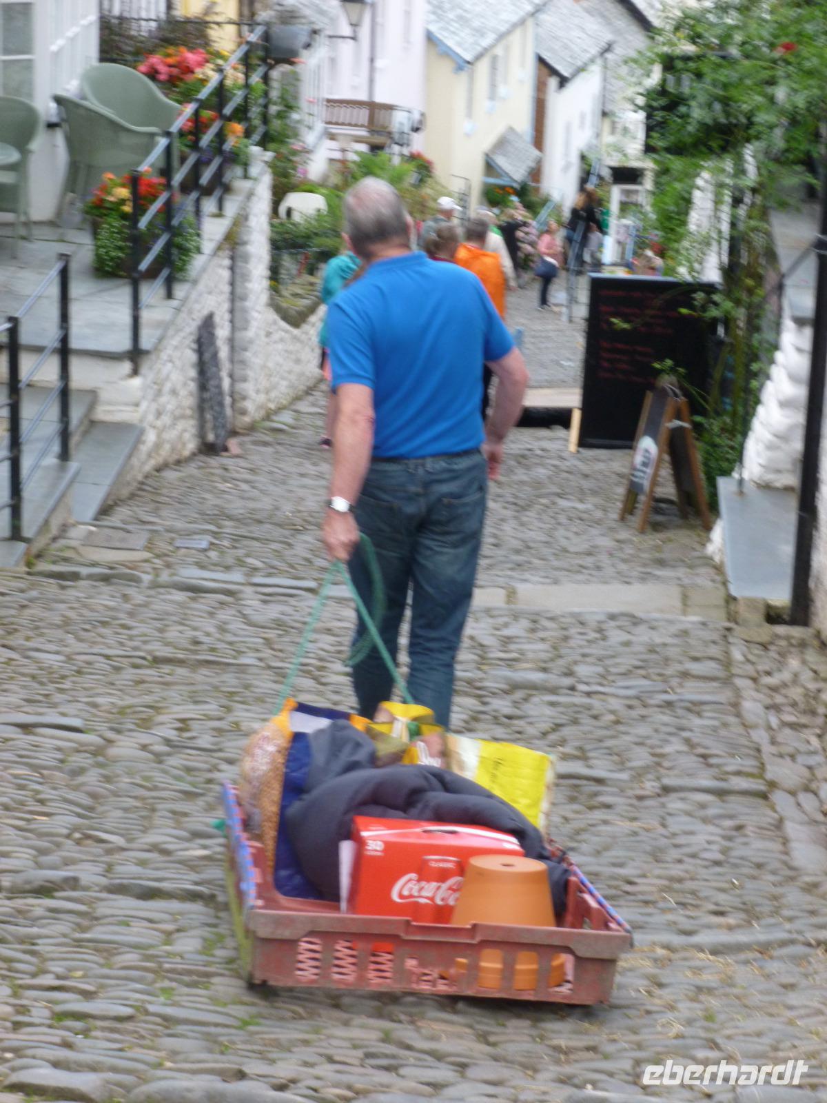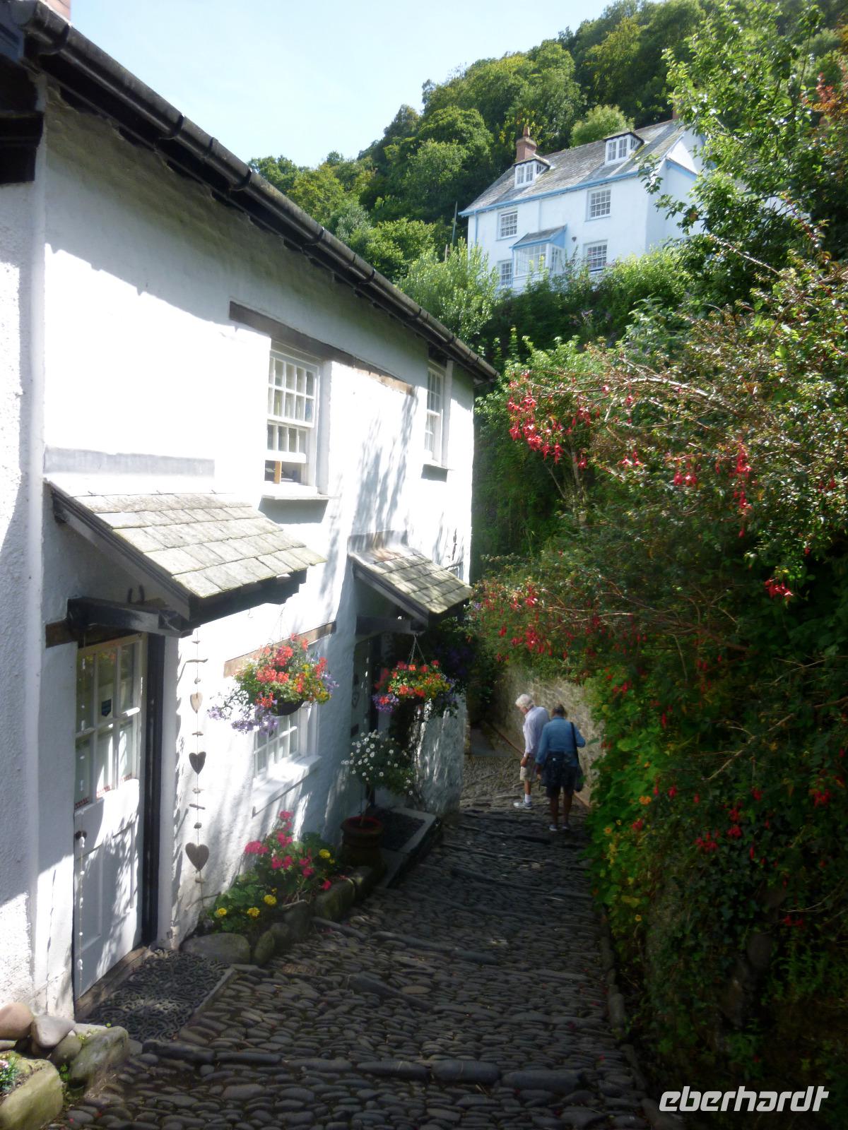 Das Museumsdorf Clovelly liegt an einem Abhang, deshalb werden Lasten von Eseln und Holzschlitten transportiert. Wir spazierten auf dem Kopfsteinpflaster an den dicht gedrängten Häuschen zum Miniaturhafen hinunter und hörten, dass sich das ganze, unter Denkmalschutz stehende Dorf seit über 200 Jahren in Privatbesitz der Familie Rous befindet.