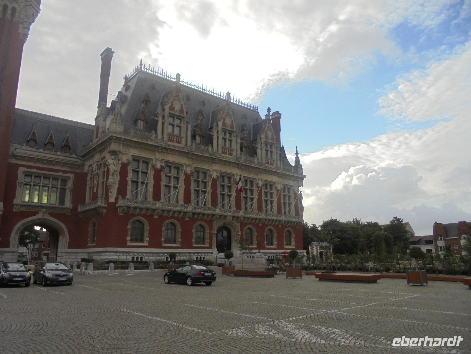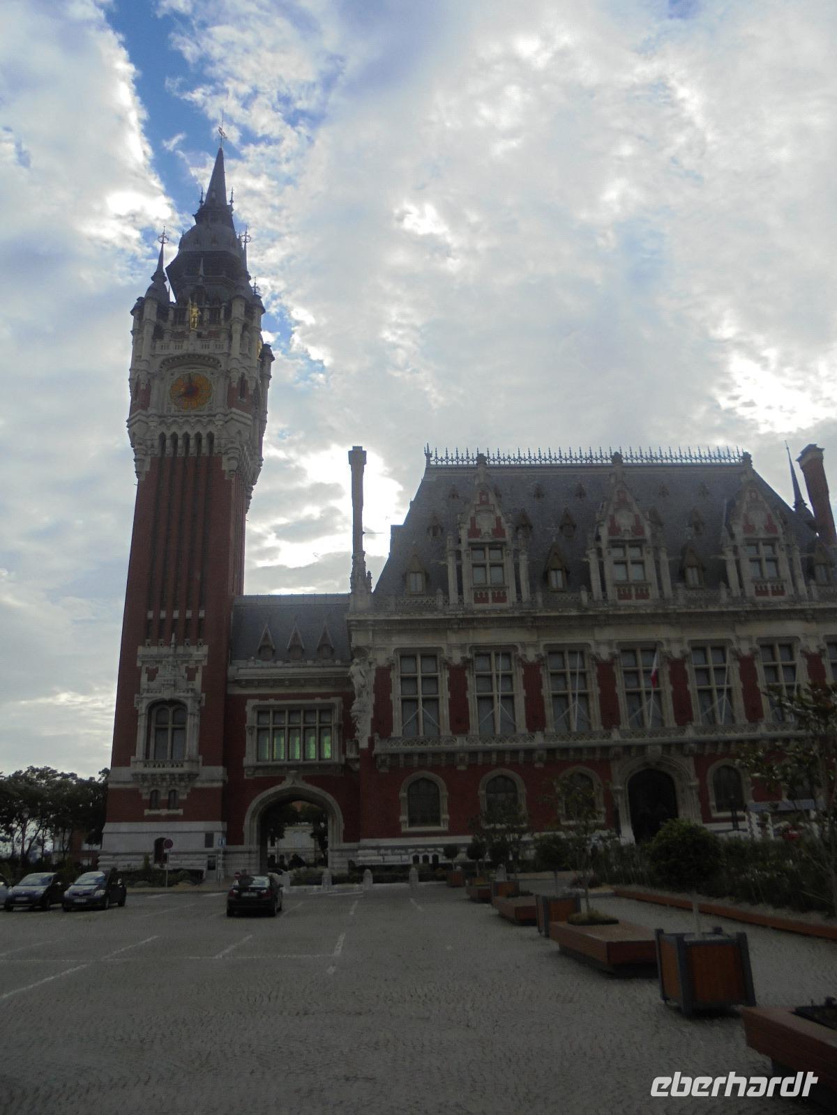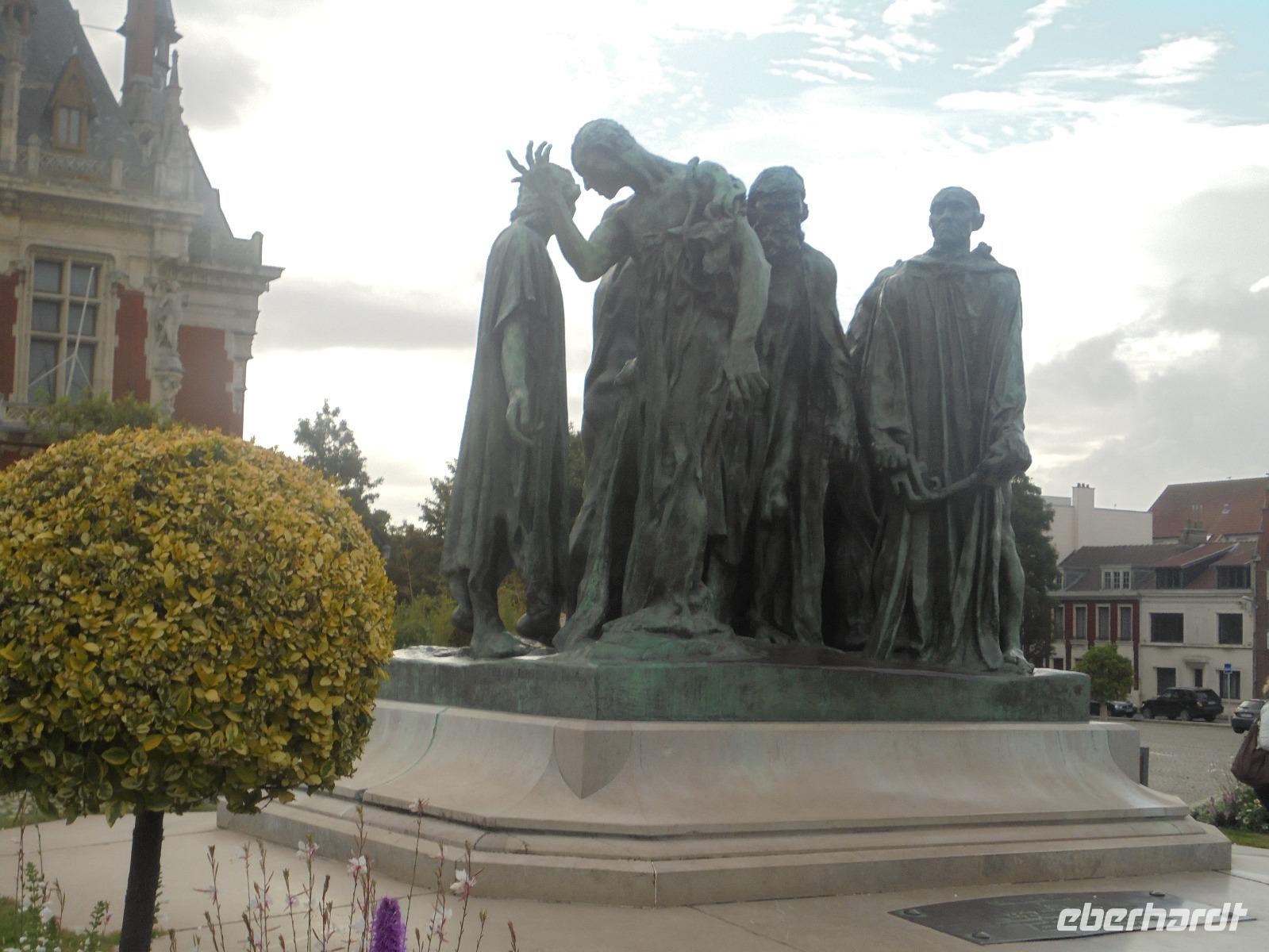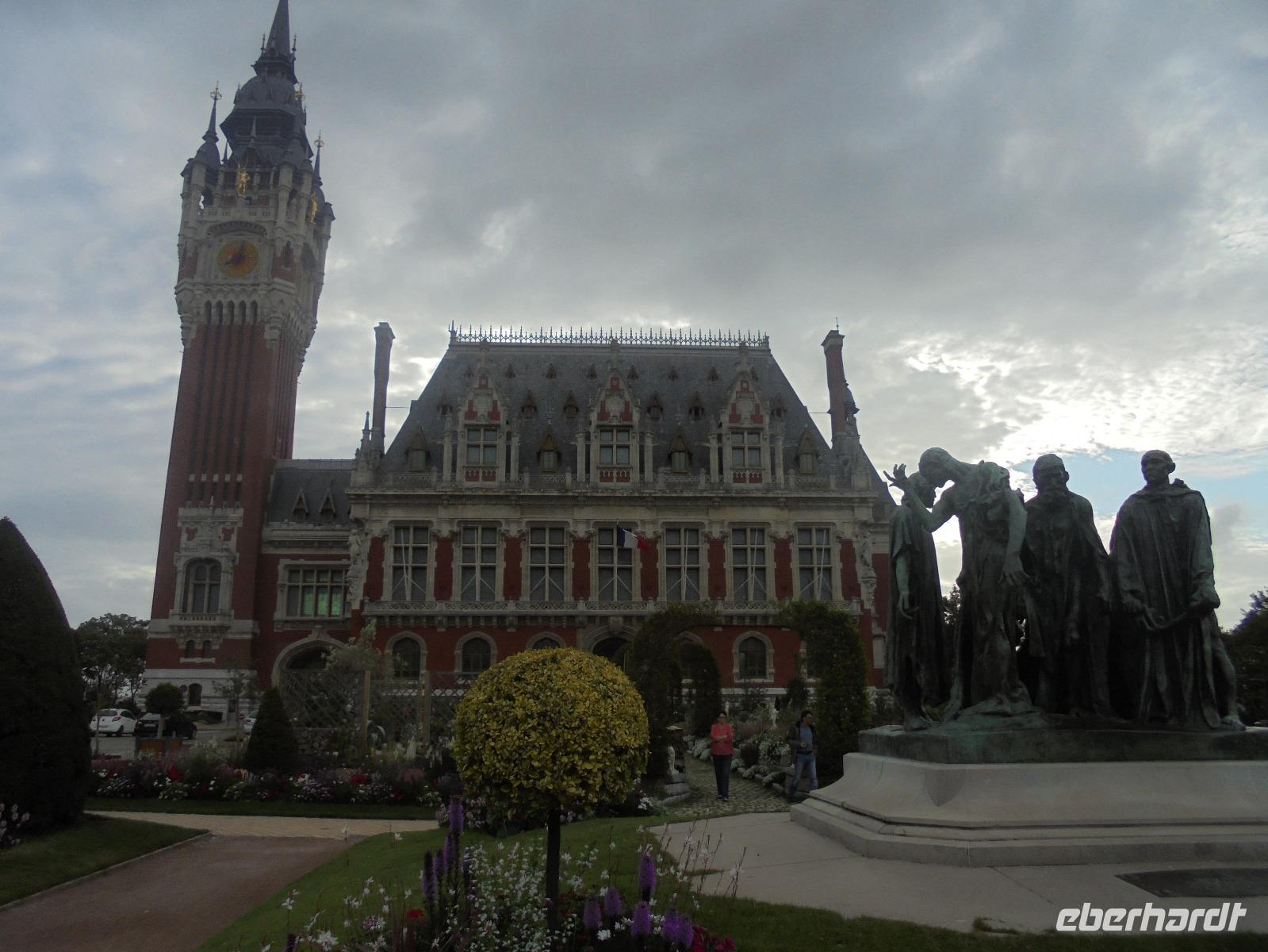 Dem frühen Frühstück heute folgte - noch bevor wir zum Fährhafen aufbrachen - ein kleiner Abstecher im Sinne des Firmenmottos „Richtig Reisen" zu gewiss bedeutendsten Sehenswürdigkeit von Calais. Erst im 20. Jh. wurde das üppig dem Stil der flämischen Renaissance nachempfundene und überaus prächtig gestaltete Rathaus errichtet, überragt vom etwa 75 m hohen Rathausturm, der in seinen oberen Geschossen ebenfalls vor Verzierungen fast überbordet. Fast genauso schmuck ist der riesige Rathausvorplatz - in kunstvoller Manier mit überaus üppiger Blumenpracht geschmückt. In seinem Zentrum steht das wertvollste „Stück Kunstgeschichte" der französischen Hafenstadt: die bronzene Figurengrupp der „Bürger von Calais" schuf der berühmte Bildhauer Auguste Rodin in den 90er Jahren des 19. Jh. und griff dabei eine legendäre historischen Geschichte auf, die in den Annalen des hundertjährigen Krieges, der im 14. Und 15. Jh. zwischen England und Frankreich ausgefochten wurde, Erwähnung findet. Der Chronist dieses Krieges, Jean Froissart, erzählte hier den Ursprung der Legende, in deren Mittelpunkt die mutige Tat einiger angesehener Bürger von Calais steht. Sie wollten ihre Stadt retten und sollen sich den siegreichen Engländern als Geiseln angeboten haben - nur die Bitten der beeindruckten Gemahlin des englischen Königs hätten sie vor der sicheren Hinrichtung durch die wütenden Belagerer bewahrt ...