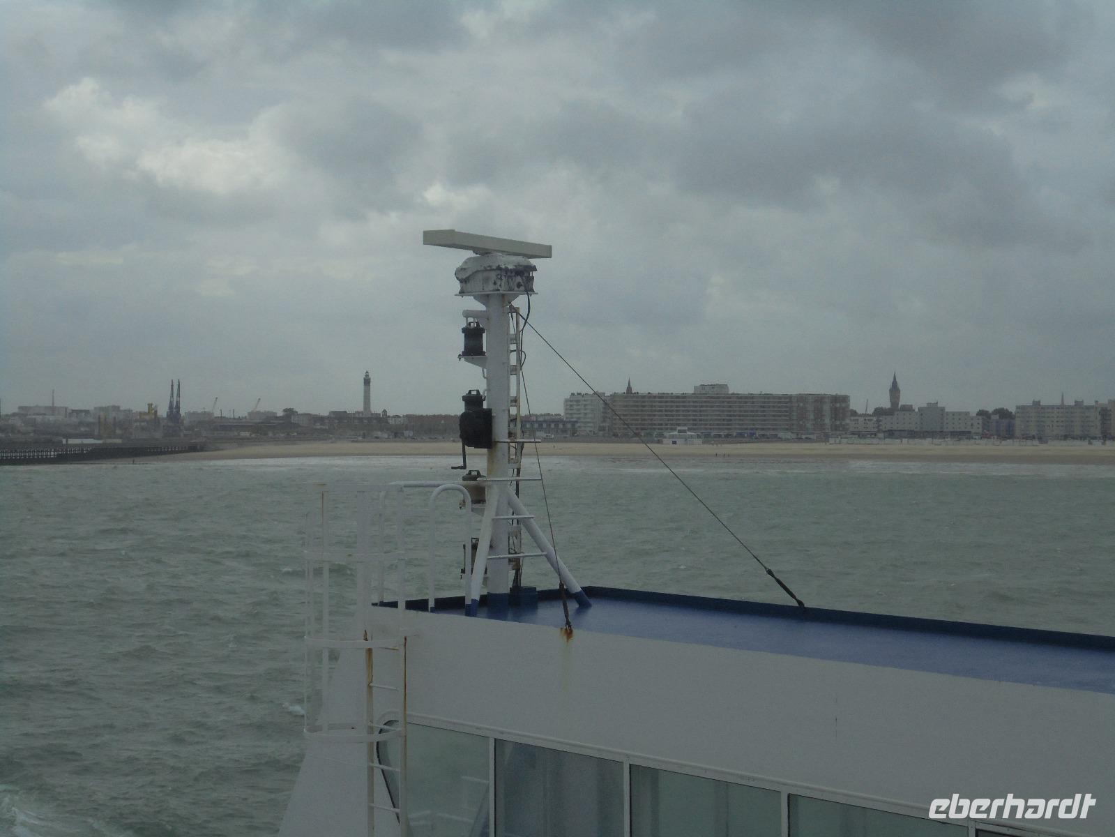Dann ging es per Bus weiter zur Fähre. Pünktlich erreichten wir das DFDS-Fährschiff und obwohl der Tag völlig verregnet war, zeigte sich bei der Ausfahrt aus Dover plötzlich eine strahlende Sonne und ließ die weißen Kreideklippen so erstrahlen, wie man es sich nur wünschen konnte. Eineinhalb Stunden später waren wir „wieder auf dem Kontinent"., wo wir in der Hafenstadt Calais übernachteten.