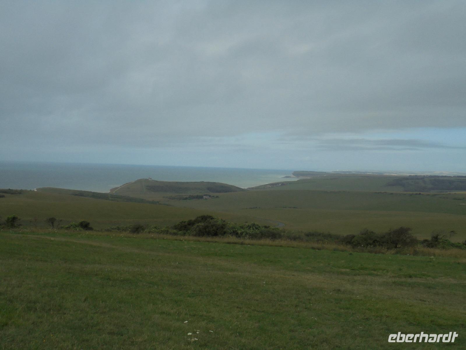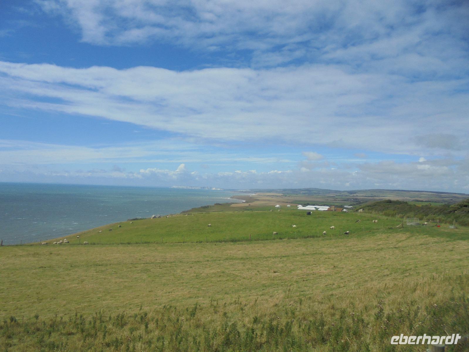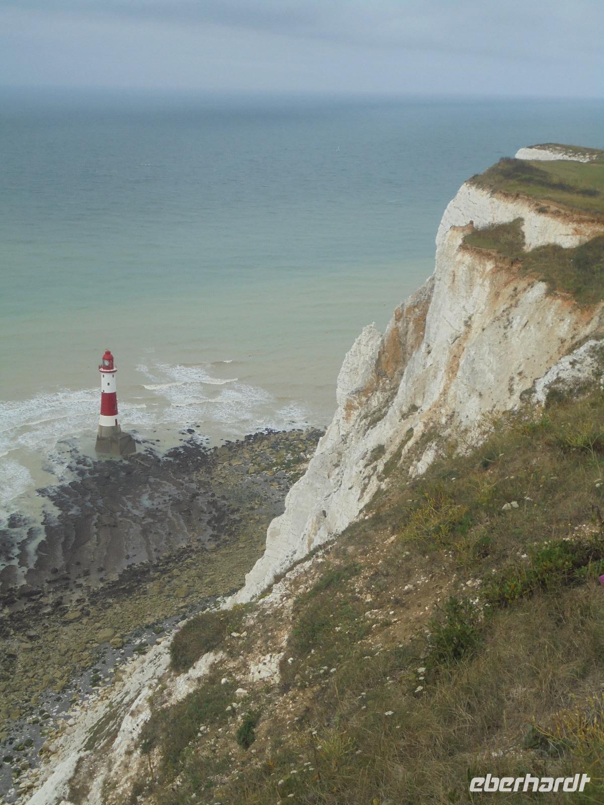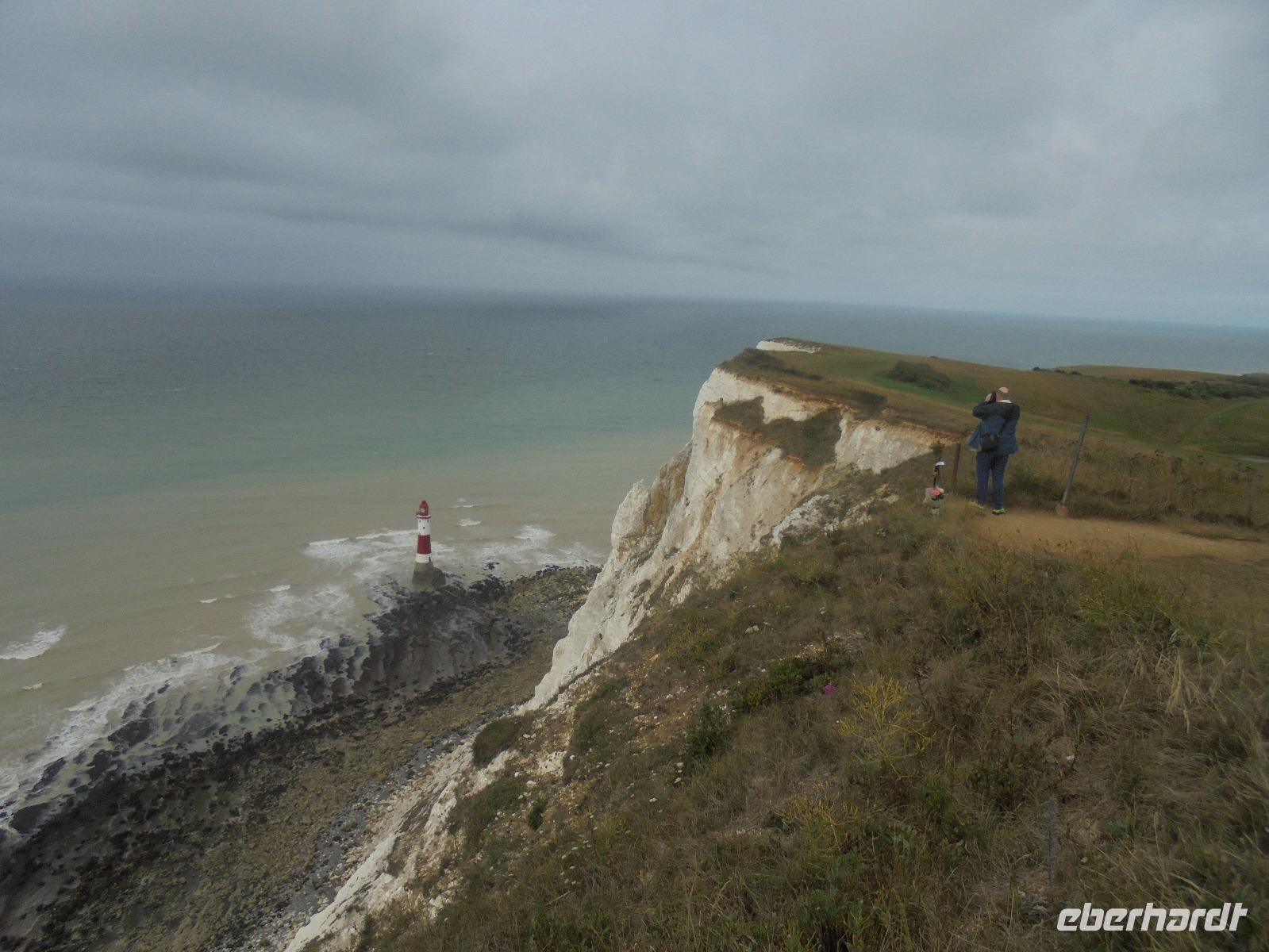 Nach dem Frühstück in Eastbourne begannen wir den Tag wie den vorhergehenden: gleich mit einem „Richtig-Reisen-Extra" Abstecher zur Cliff-Küste. Eine der höchsten bekannten Kreideklippen liegt hier: „Beachy Head". Die Landspitze gehört zum welligen Mittelgebirge der South Downs und ihre Kreidefelsen sind mit ihrer Höhe von 162 m über dem Meeresspiegel die höchsten in Großbritannien. So wurde Beachy Head zu einer Landmarke und zum Richtpunkt für Schiffe auf dem Ärmelkanal. Um ein zu nahes Heranfahren zu unterbinden und auf die Gefahren für die Schifffahrt durch Felsriffe hinzuweisen, errichtete man 1831 einen Leuchtturm auf einer Klippe, ersetzte ihn aber Anfang des 20. Jh. durch einen, der auf einer Plattform mitten im Wasser steht. Bei richtigem Licht wirkt dieses ganze Ensemble äußerst malerisch.
