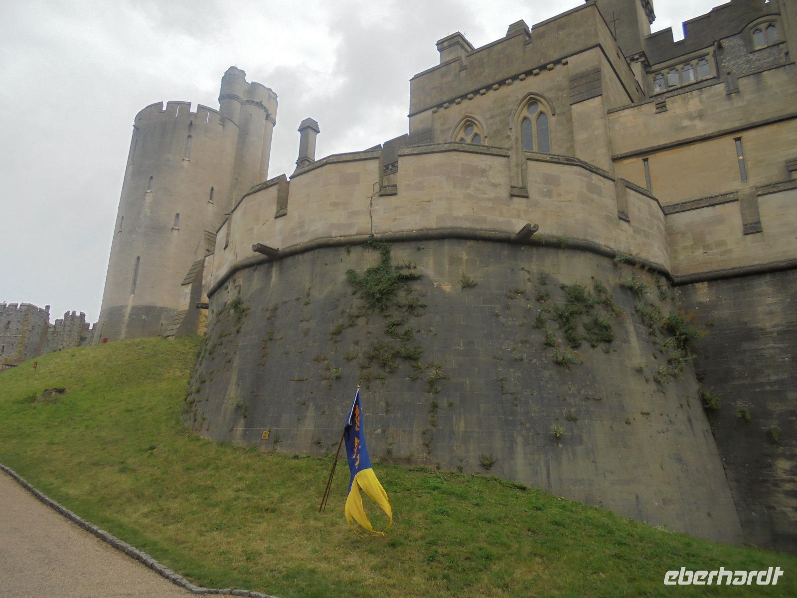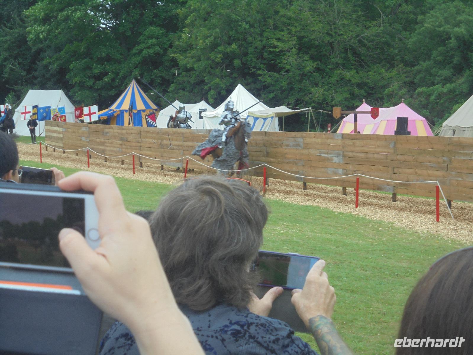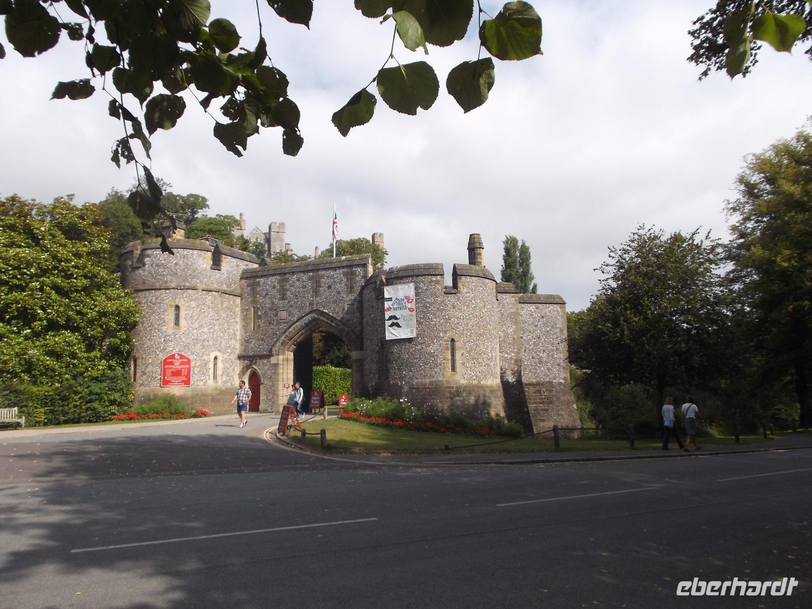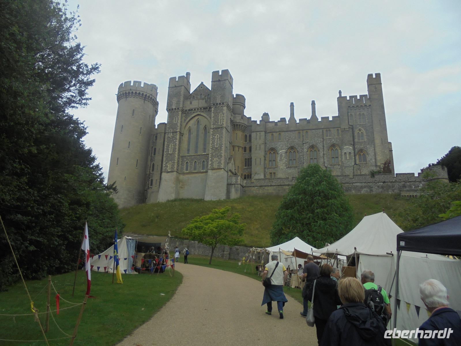 Von unserem Spaziergang zu den Kreidefelsen aus führte dann unsere Fahrt weiter nach Arundel, einem hübschen Städtchen in der Grafschaft West Sussex, dessen Erscheinungsbild von seinem gewaltigen Schloss und einer neogotischen Kathedrale dominiert wird. Unser Ziel war denn auch das weithin bekannte Arundel Castle, heute Wohnsitz des Duke of Norfolk.. Es zählt zu den besterhaltenen Schlössern des Mittelalters und zu den ältesten bewohnten: schon im 11. Jahrhundert errichtete man es in der traditionellen Festungsbauweise, sicherte es mit Zinnen und Zugbrücken und machte es in der Folge zum standesgemäßen Sitz mehrerer bedeutender Adelsgeschlechter. Sowohl das Schloss als auch die prächtigen Gärten kann man besichtigen und gerade heute, als wir hier eintrafen, war der Besuch besonders lohnend: Ein Mittelalterfest auf dem Schlossgelände versprach historisches Markttreiben und als Höhepunkt an diesem Vormittag ein Turnier. Tatsächlich konnten wir uns sofort ins Markttreiben mischen und zusehen, wie einige Ritter hoch zu Ross im wahrsten Sinne des Wortes „eine Lanze brachen". Sehr stilecht und bunt und unter reger Beteiligung des Publikums liefen die Aktionen hier in Arundel ab.