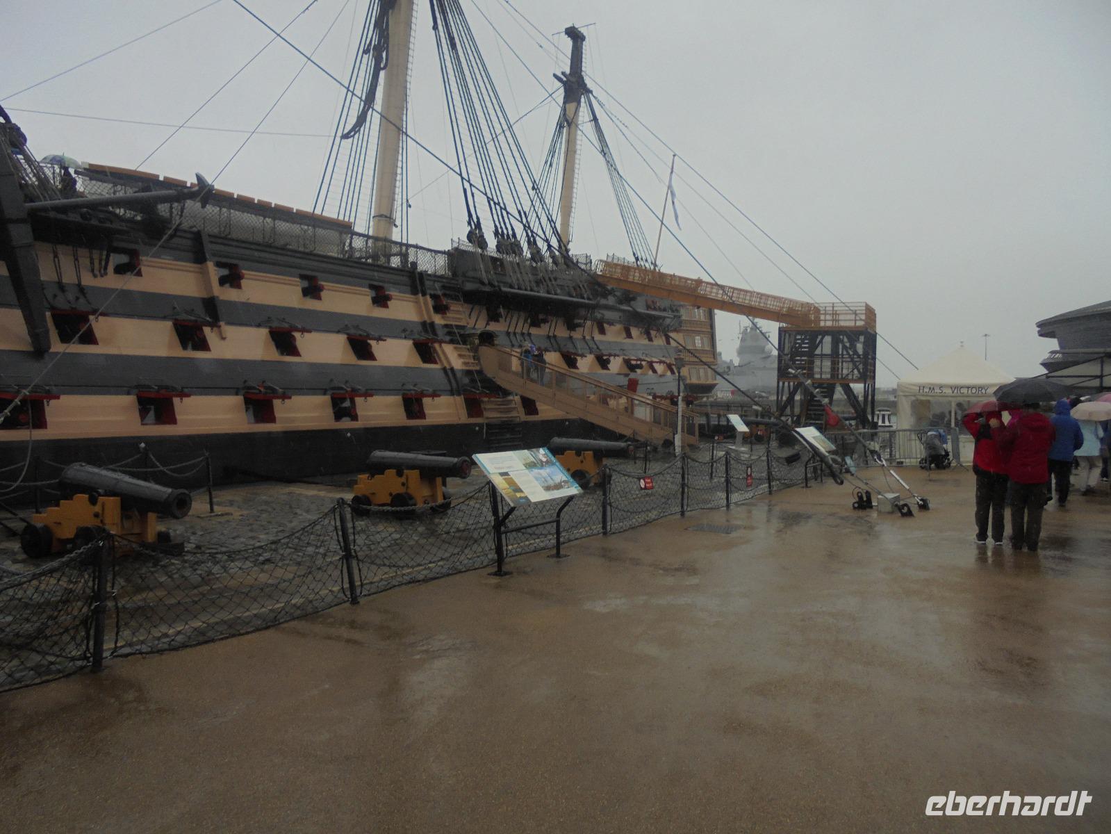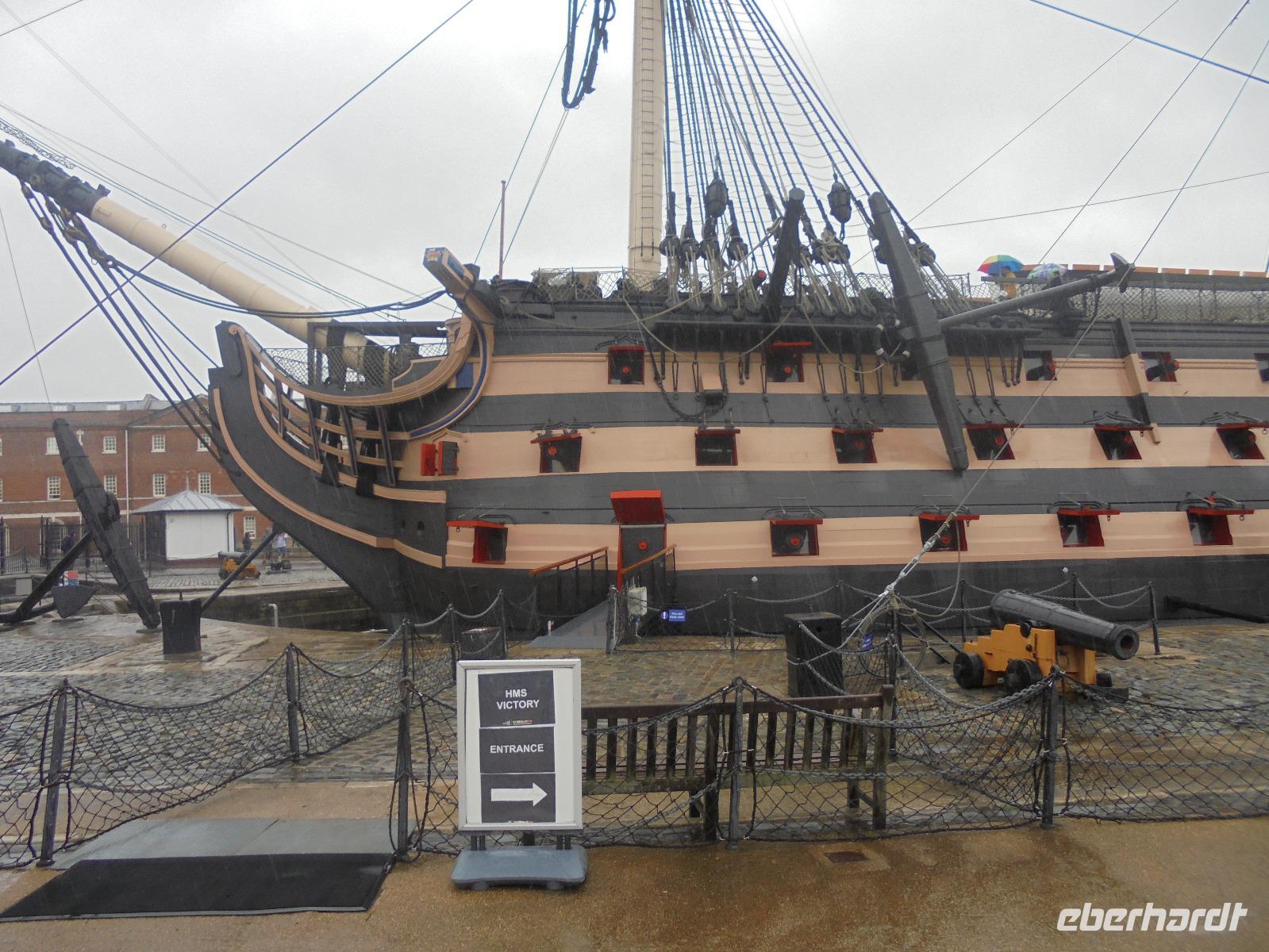 Bekannteste und gewiss auch bemerkenswerteste Sehenswürdigkeit ist die teilweise als Museum genutzte Marinebasis. Auch besondere Kriegsschiffe aus der Vergangenheit des „British Empire" sind hier ausgestellt, wie z.B. die HMS „Warrior", die eins versunkene und später gehobene „Mary Rose", die hier ein eigenes Museum bekam und natürlich HMS „Victory", die als Flaggschiff der Briten in der Seeschlacht von Trafalgar 1805 in die Geschichte einging. Schon 1765 in Dienst gestellt, verfügte das Kriegsschiff - damals eines der größten seiner Zeit - über 104 in mehreren Etagen („Linien") angeordnete Kanonen. Das daher so genannte „Linienschiff" war zwar mit 70 m Länge bei weitem nicht so groß wie beispielsweise heutige Fährschiffe, hatte aber 850 Mann Besatzung. Britischer Navy-Tradition folgend, wurde es nie aus dem aktiven Dienst genommen und ist damit heute noch offiziell Teil im Marinedienst - vielleicht das älteste aktive Kriegsschiff der Welt. Sein Ausbau als Museum allerdings war ziemlich genial, denn man kann eindrucksvoll die Kampf- und Lebensbedingungen englischer Seesoldaten des 19. Jahrhunderts studieren. Auch einen Überblick über Schiffsbau und die Geschichte der englischen Flotte und ihrer Seekriege kann man sich hier verschaffen.