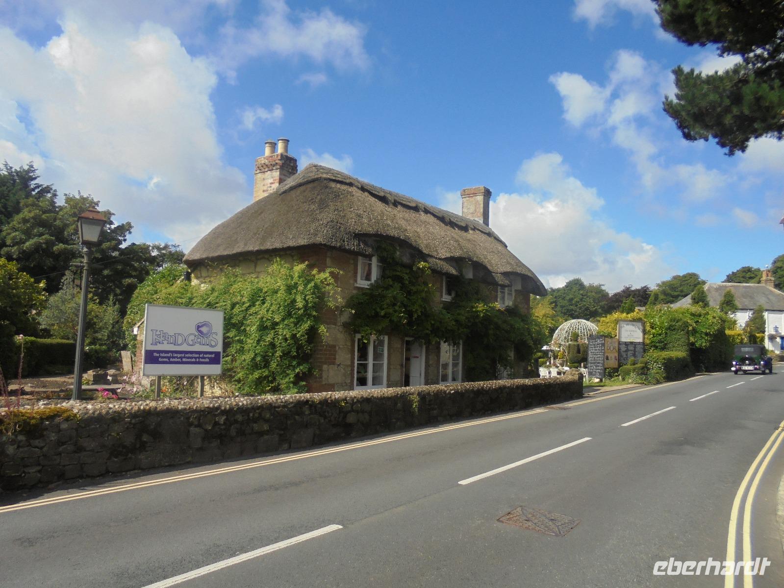 Wight ist die zweitgrößte Insel, die zu England gehört und mit ihren etwa 380 km² etwas kleiner als Usedom. Hier leben allerdings Etwa doppelt so viele Menschen wie auf der deutschen Insel: insgesamt etwa 140.000. Wir landeten in East Cowes, einem Badeort mit exklusivem Yachtclub, der seit über einem Jahrhundert für bedeutende Segelregatten und maritime Feste bekannt ist. Durch die Mitte der Insel fahrend, erreichten wir schon bald das Vorzeigedörfchen Godshill. Seine reetgedeckten alten Häuser, Souvenirläden und Cafés sind ein Touristenmagnet, was nicht zuletzt der tagsüber stets volle Parkplatz beweist.