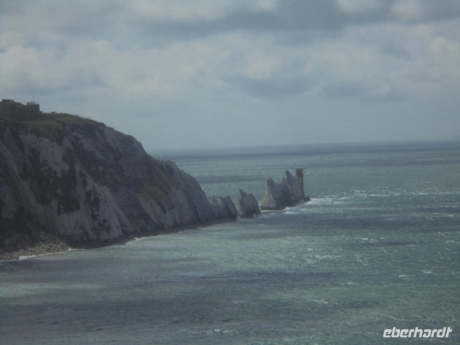 Das Besondere hier aber ist nicht nur ein Wanderweg zu einer alten Küstenfestung oberhalb der Bucht, sondern vor allem der Aussichtspunkt auf eine dramatische Kreidefelsen-Szenerie: am Ende der Bay ragen mehrere drei- und viereckige Kreidefelsen bis zu 30 m hoch aus dem Wasser. „Needles" - „Nadeln" nennt man die Klippen und malerisch und spektakulär ist ihnen ein Leuchtturm vorgelagert. Als besondere und außergewöhnliche Attraktionen in Südengland werden sie geführt und mitunter - nach einem Bonmot des bekannten viktorianischen Dichters Alfred Baron Tennyson - als „Versteinerte Segel" bezeichnet.