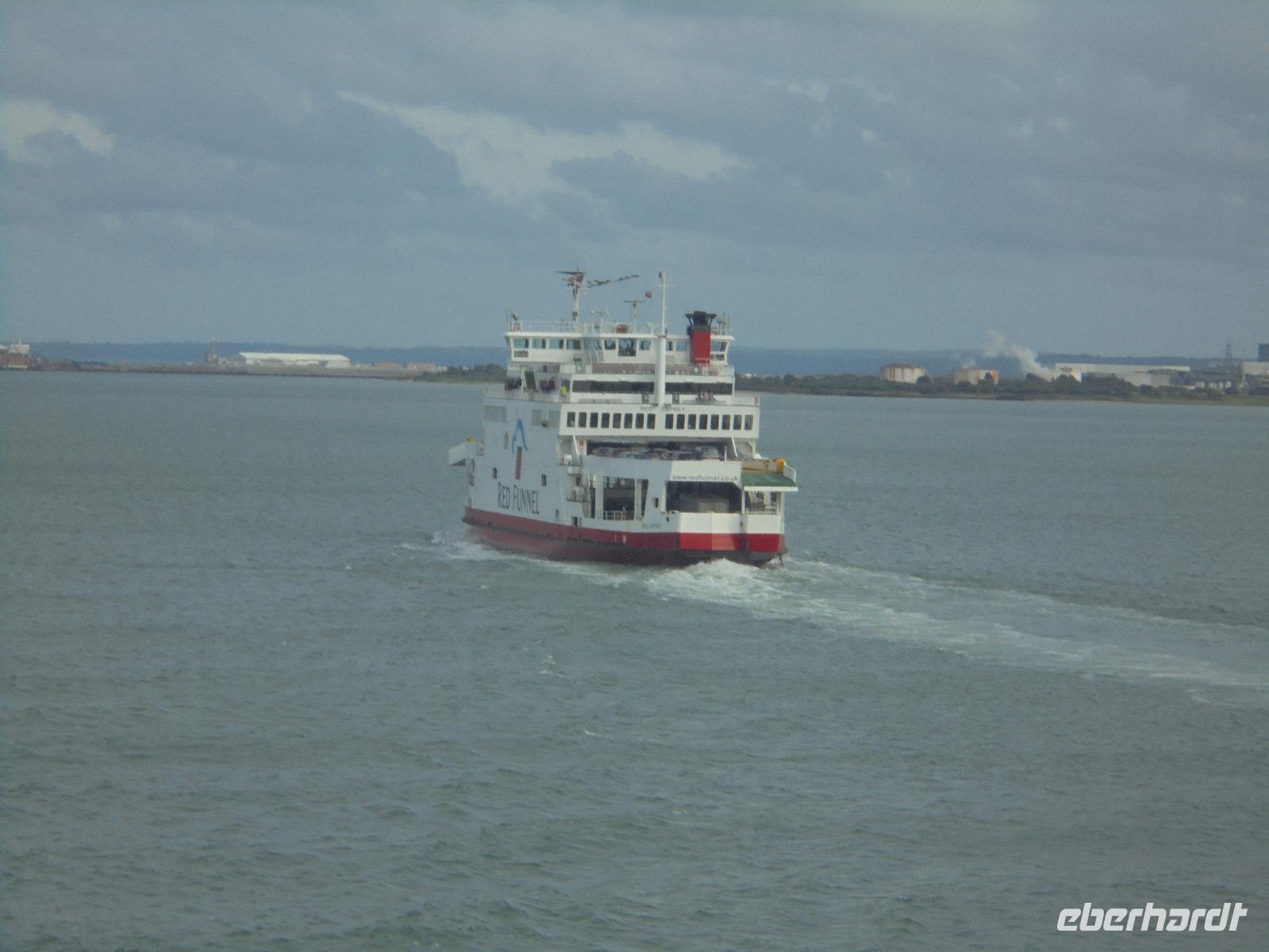 Heute früh erreichten wir schon bald nach dem Frühstück die „Red Funnel" Fähre, die uns dann in einer knappen Stunde Überfahrt zur Ferieninsel „Isle of Wight" brachte. Dabei überquerten wir den „Solent", der das Eiland seit der Eiszeit vom Festland trennt, eine flache Meeresbucht entstanden aus der Überflutung einer Flussmündung.