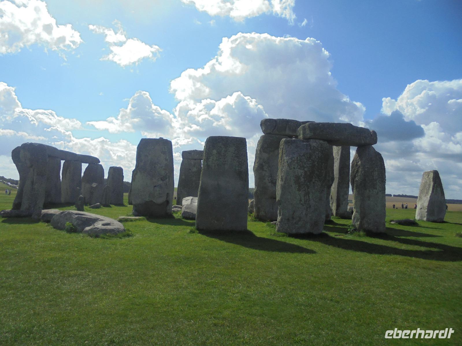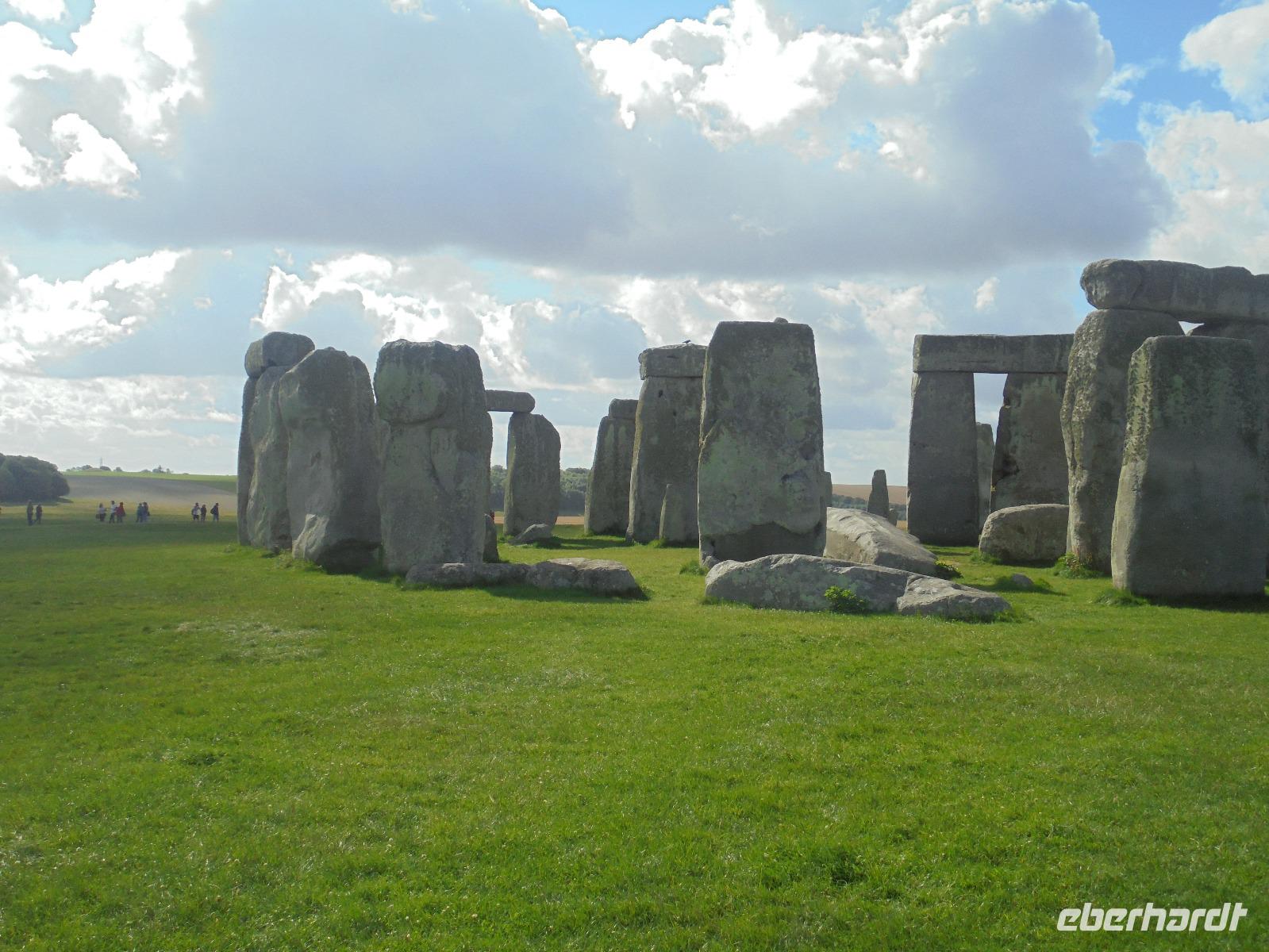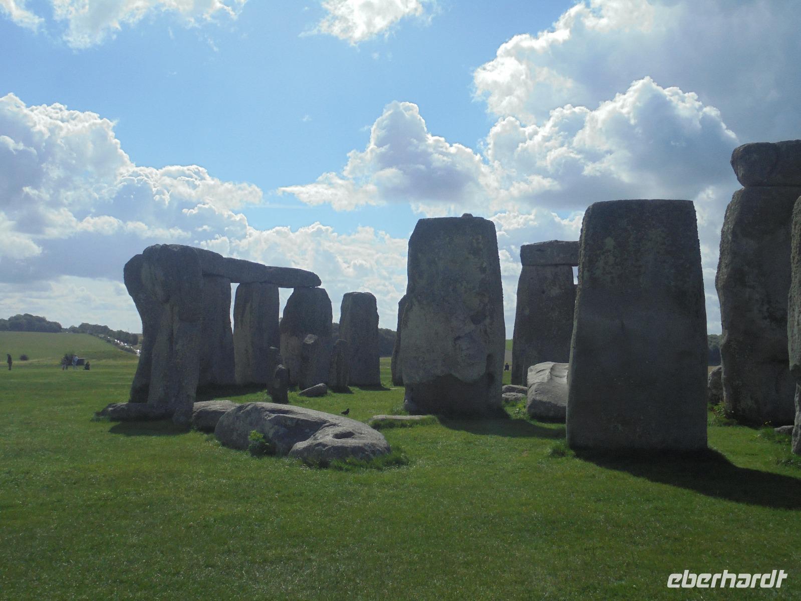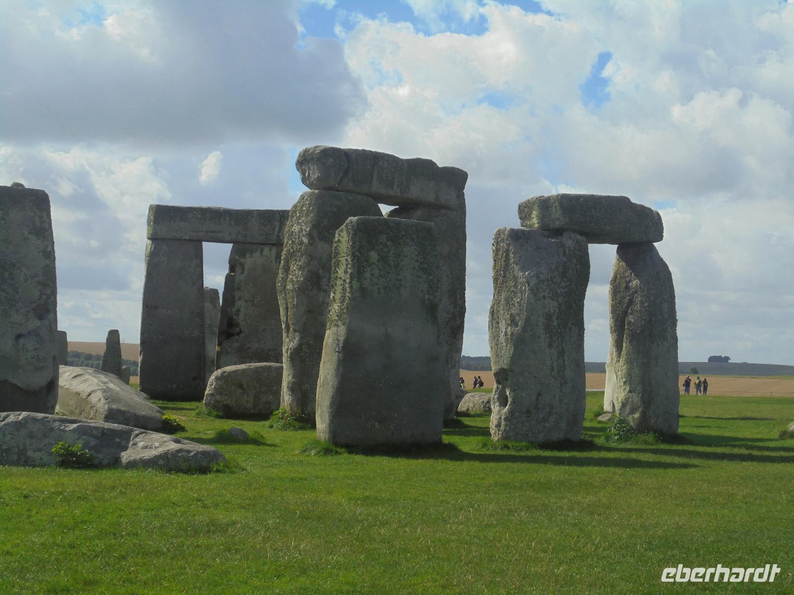Stonehenge aber stellt sie alle in den Schatten! Man kann die Steinriesen ganz aus der Nähe betrachten, allerdings aus Gründen ihres Schutzes nicht mehr direkt an sie herangehen. Geheimnisvoll wirken sie und überwältigend - zumindest wenn man sich der Mühe unterzieht, über ihre Errichtung und möglichen Funktionen nachzudenken. Was bewegte die Erbauer - immerhin Steinzeitmenschen - sich der unglaublich erscheinenden Aufgabe zu stellen, Steine von teilweise über hundert Tonnen Gewicht über große Strecken zu transportieren und hier zu einer geheimnisvollen, dennoch aber durchdacht scheinenden Struktur aufzurichten? Hunderte Helfer, die über viele Jahre daran arbeiteten, waren wohl nötig. Die Großsteinstruktur von Stonehenge besteht aus mehreren konzentrischen Steinkreisen - vor allem den auffälligen äußeren - Pfeilersteine mit Decksteinen überbrückt und darin befindliche innere hufeisenförmige Steinsetzung. Fünf einzeln stehenden Trilithen („Dreisteine") bestehen aus je zwei aufrecht stehenden Tragsteinen mit Deckstein. Gerade sie sind es, die den Wissenschaftlern Rätsel aufgeben.