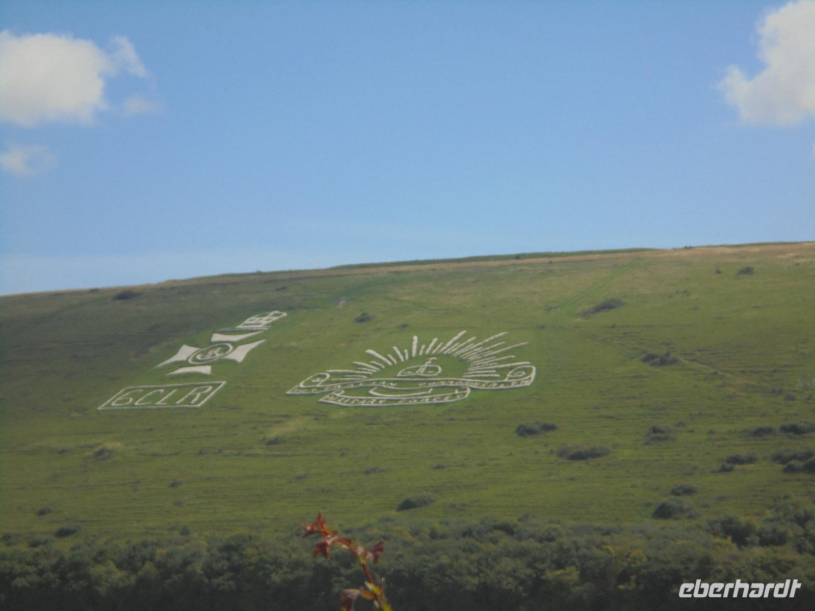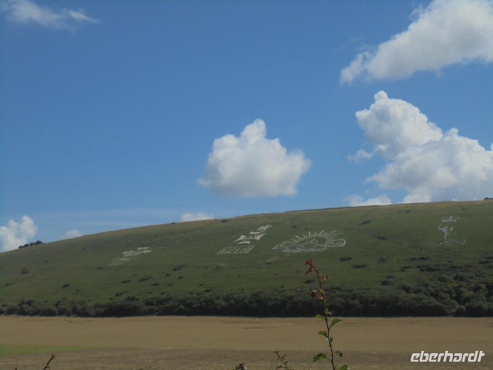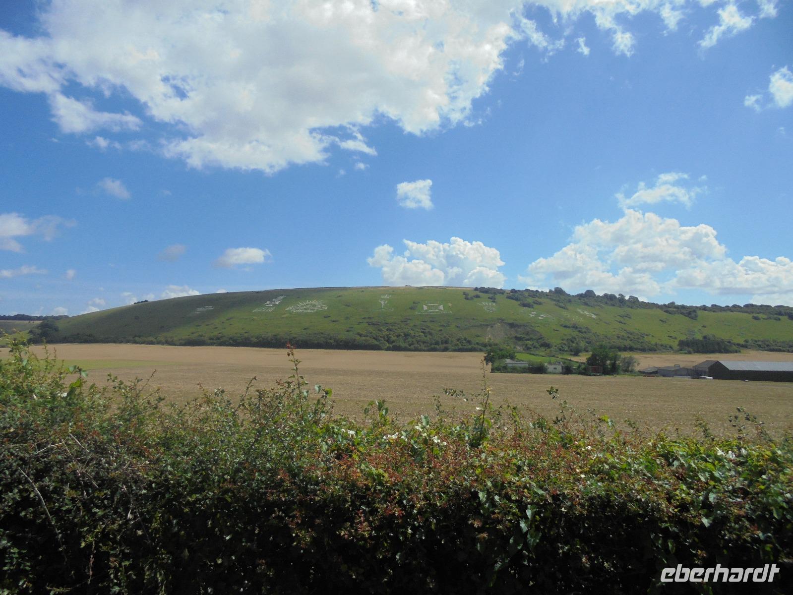 Ein gutes Stück Weg galt es heute Nachmittag zurückzulegen, den wir nur einmal für einen Fotostopp unterbrachen. Eine Merkwürdigkeit der Region sind die hiesigen „Hügelfiguren", die seit Jahrhunderten dadurch entstehen, dass man die dünne grüne Rasendecke der Hügel grabenartig wegkratzt, so dass der helle darunterliegende Kalkstein sichtbar wird. Auf diese Art wurden Pferde- oder Menschendarstellungen geschaffen, die man nur von bestimmten Punkten der Täler, Wege und Straßen erkennen kann. In dieser Technik hatte man aus Ehrerbietung gegenüber den Soldaten des 1. Weltkrieges nach dessen Ende riesige Darstellungen der Abzeichen wichtiger Armee-Einheiten in die Hügel gegraben. Einen solchen Anblick gibt es nur hier und nur von einer Stelle!