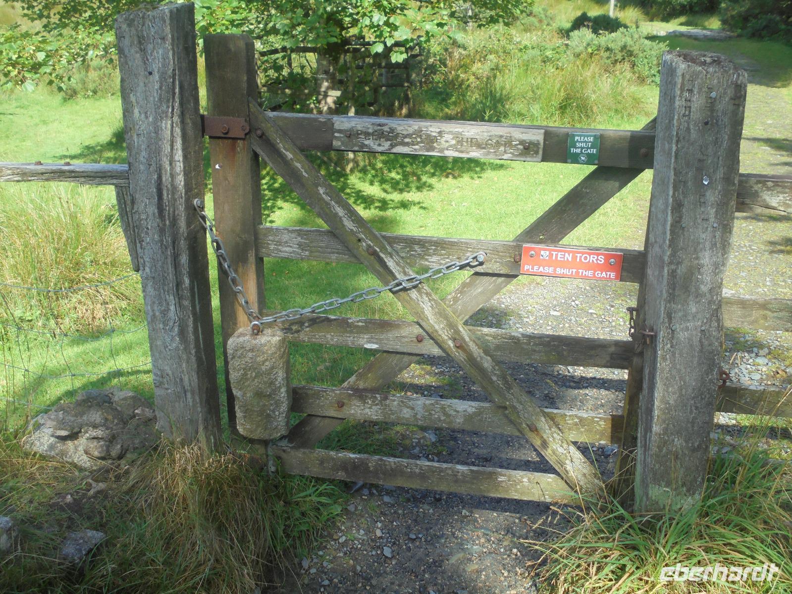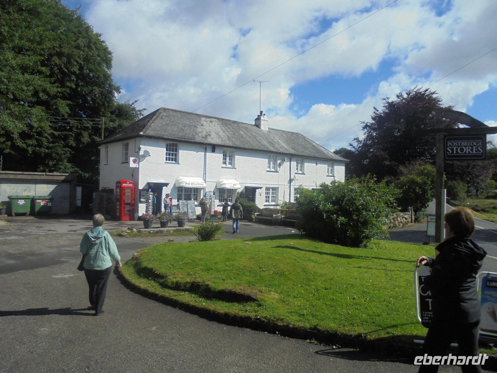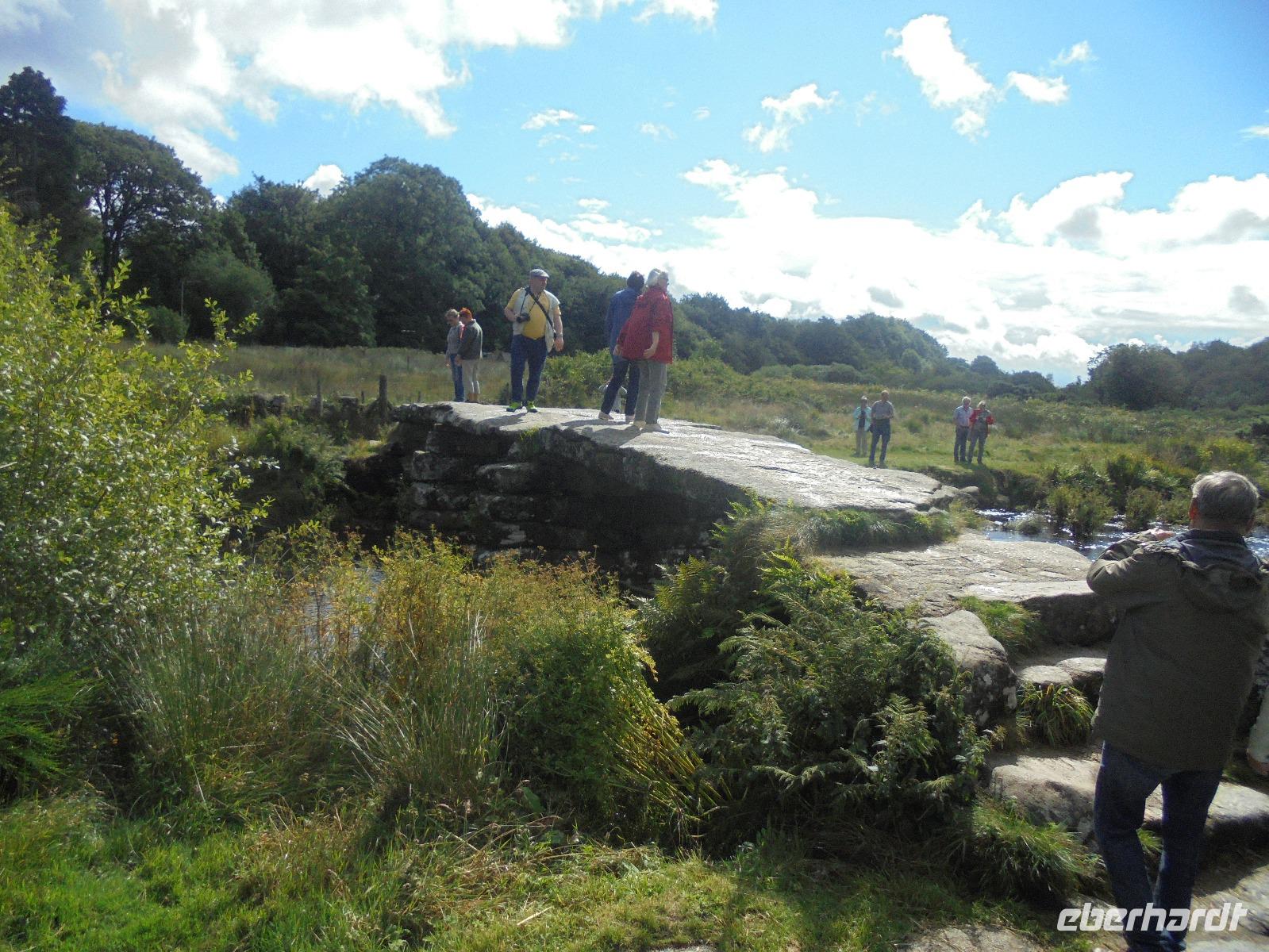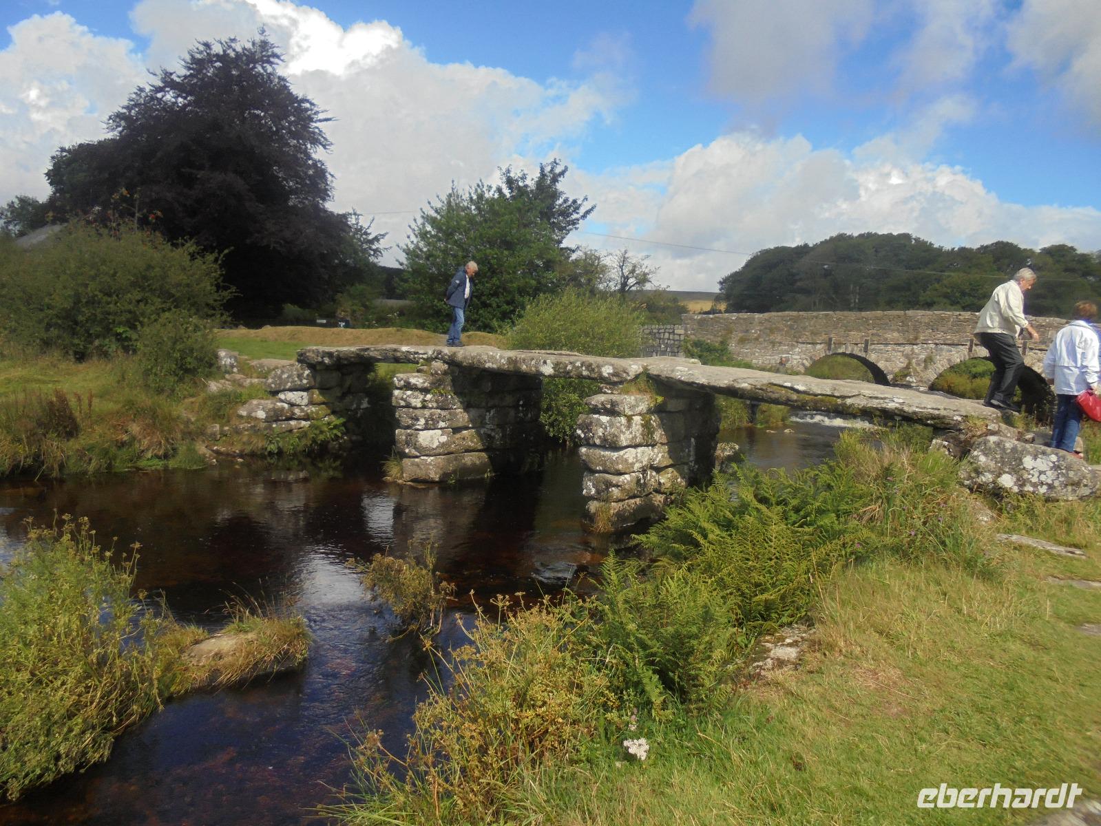 Der heutige Tag begann mit der Durchfahrt durch das Dartmoor, eine der bekanntesten Landschaften Englands. Anders als der Begriff Moor, bei dem schlammiges, schilfbewachsenes See- und Sumpfgelände erwartet, vermuten lässt, handelt es sich bei den Mooren hier um Stein- und Sumpfgebiete, eingebettet in eine Hügellandschaft. Das Dartmoor liegt auf einem knapp 1000 km² großen Granitmassiv der Grafschaft Devon, ist leicht hügelig, besitzt aber auch tiefere Täler und weite Hochflächen, unterbrochen von den genannten Tors, Hügel, die von Granitfelsbildungen gekrönt werden. Hier gefundene Überreste prähistorischer Wohnstätten, Menhire und Steinkreise, aber auch Reste künstlich angelegter Wege deuten auf eine frühe Besiedlung. Zu den charakteristischen und sehenswerten Besonderheiten gehören die aus Steinfundamenten mit darüber gelegten dünnen Granitplatten errichten sogenannten Clapper bridges, die seit vielen Jahrhunderten hier zur Überwindung von Bächen und Flüssen dienen. Besonders malerisch ist die Clapper-Bridge in Postbridge, wo wir Zeit für einen ausgedehnten Fotostopp hatten.