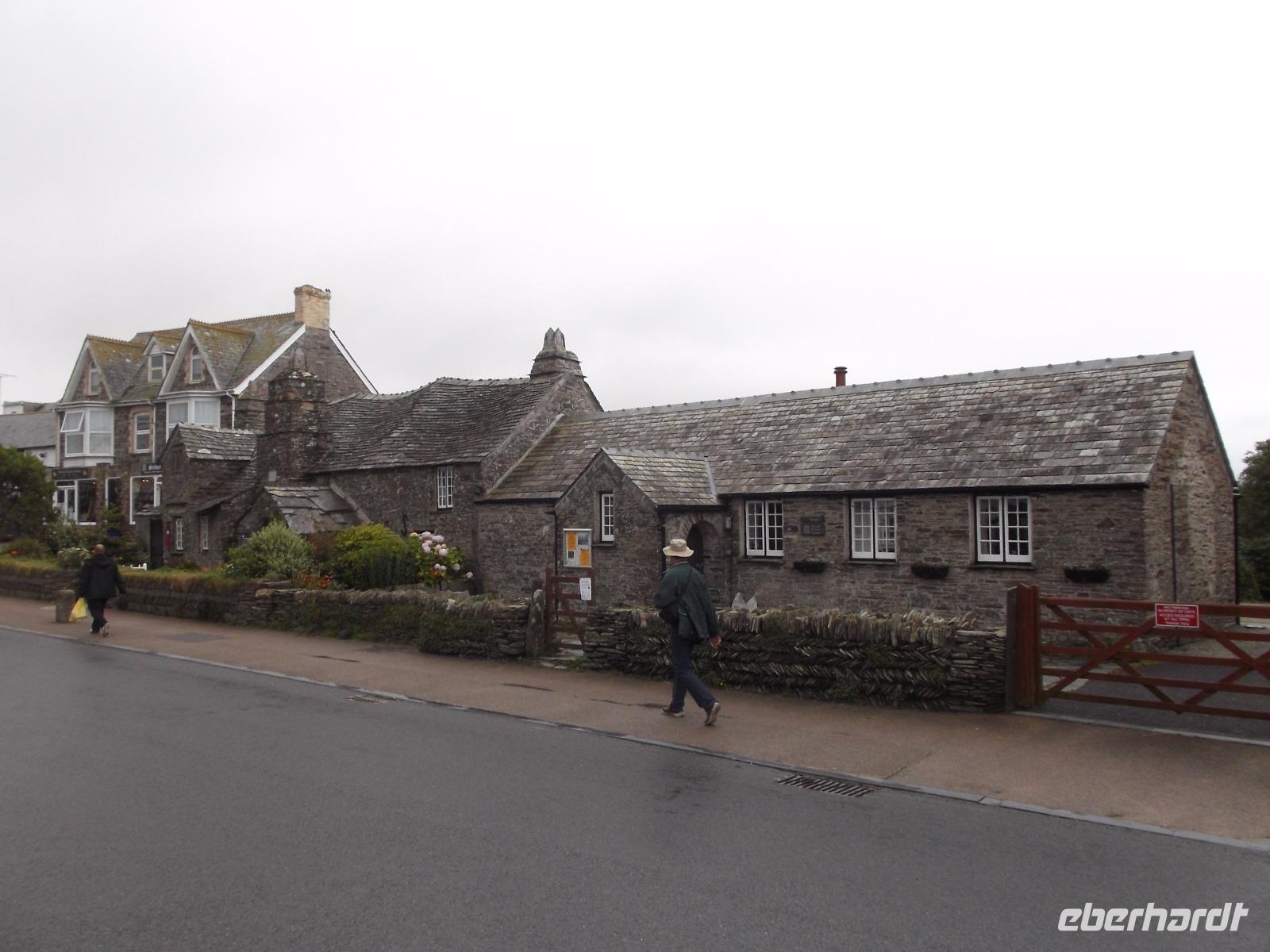 Dieser Ort an der Küste von West-Cornwall, der nebenher auch noch Merlins Zaubergrotte beherbergen soll, war also unser erstes Ziel. Trotz sehr wechselhaften Wetters war der Ausflug interessant, denn die imposante Ruine von Tintagel Castle, die sich über zwei Berggipfel mit einer Schlucht dazwischen erstreckt, liegt auf einem Felsplateau und eröffnet phantastische Ausblicken über Meer und Küste von Cornwall. Dass die mittelalterliche Burg erst im 12. Oder 13. Jh. erbaut wurde - lange nach der Artus-Zeit - stört dabei eigentlich nicht. Der Ort Tintagel selbst, sehr touristisch ausgerichtet, lebt vorwiegend von den Geschichten um Artus. Er ist recht idyllisch, insbesondere das alte Postamt gehört zu den interessantesten Gebäuden der Umgebung.