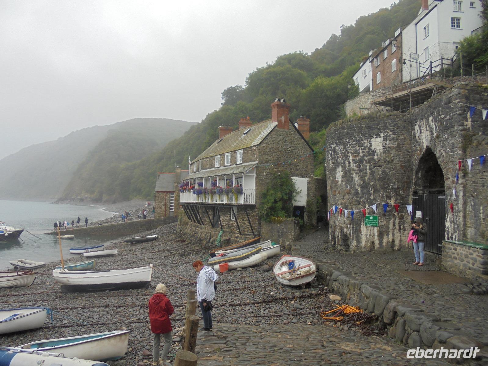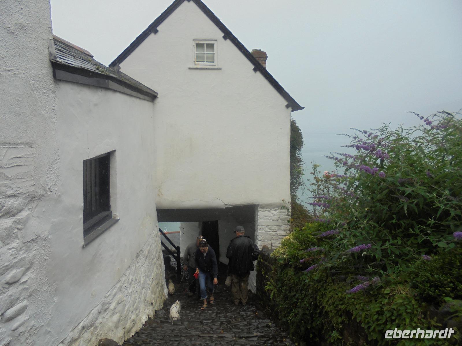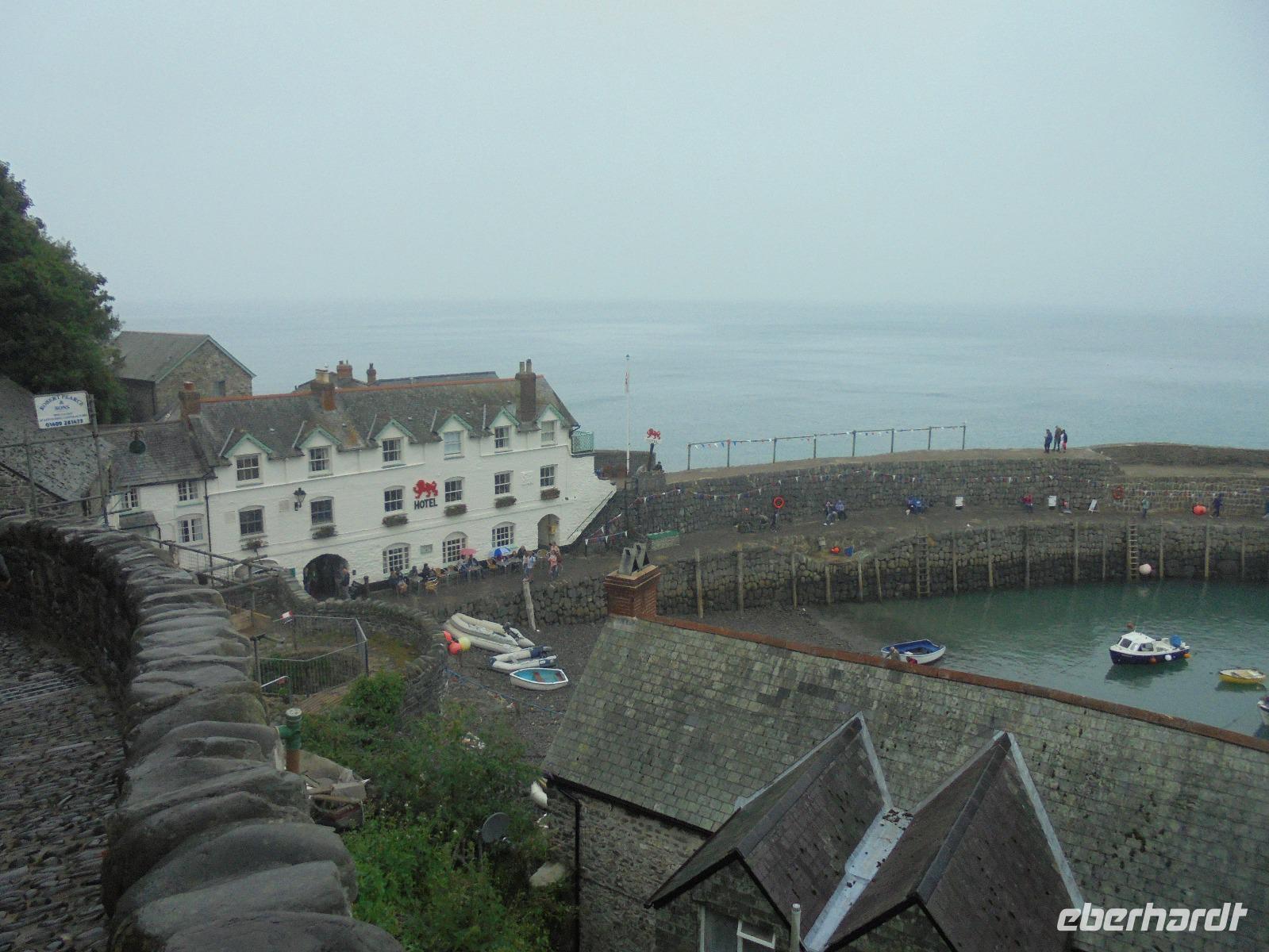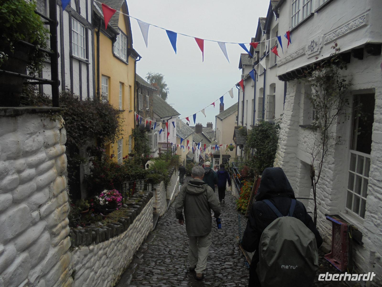 Auch der Aufenthalt in Clovelly wurde zu einem Höhepunkt. Seit langer Zeit ist das ganze Dorf im Privatbesitz, viele seiner Bewohner, die in malerischen weißgetünchten Häusern leben, betreiben bis heute Fischfang. Der Ort liegt außerordentlich malerisch an einem Steilhang und lockte stets viele Touristen an. Man kann ihn nur zu Fuß besichtigen, aufgrund des steilen Gefälles und der engen, kieselgepflasterten Straßen könnten hier gar keine Autos fahren. So wird selbst heute noch der Warenverkehr wie früher mit einer Art Gleitschlitten abgewickelt oder per Esel. Wir liefen den steilen, mehrere hundert Meter langen Weg mit seinem glatten Kieselpflaster bis hinunter zum Hafen, der von einer zangenförmigen Kaimauer aus dem 14.Jh. gebildet wird.