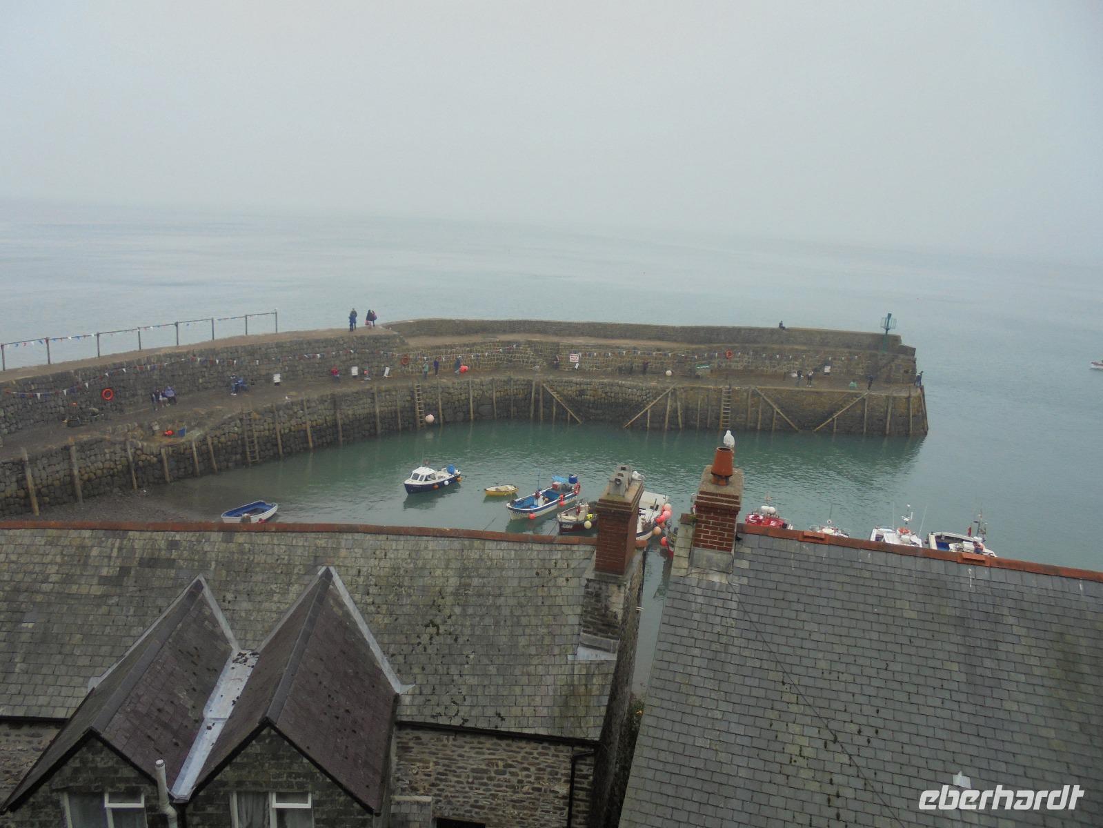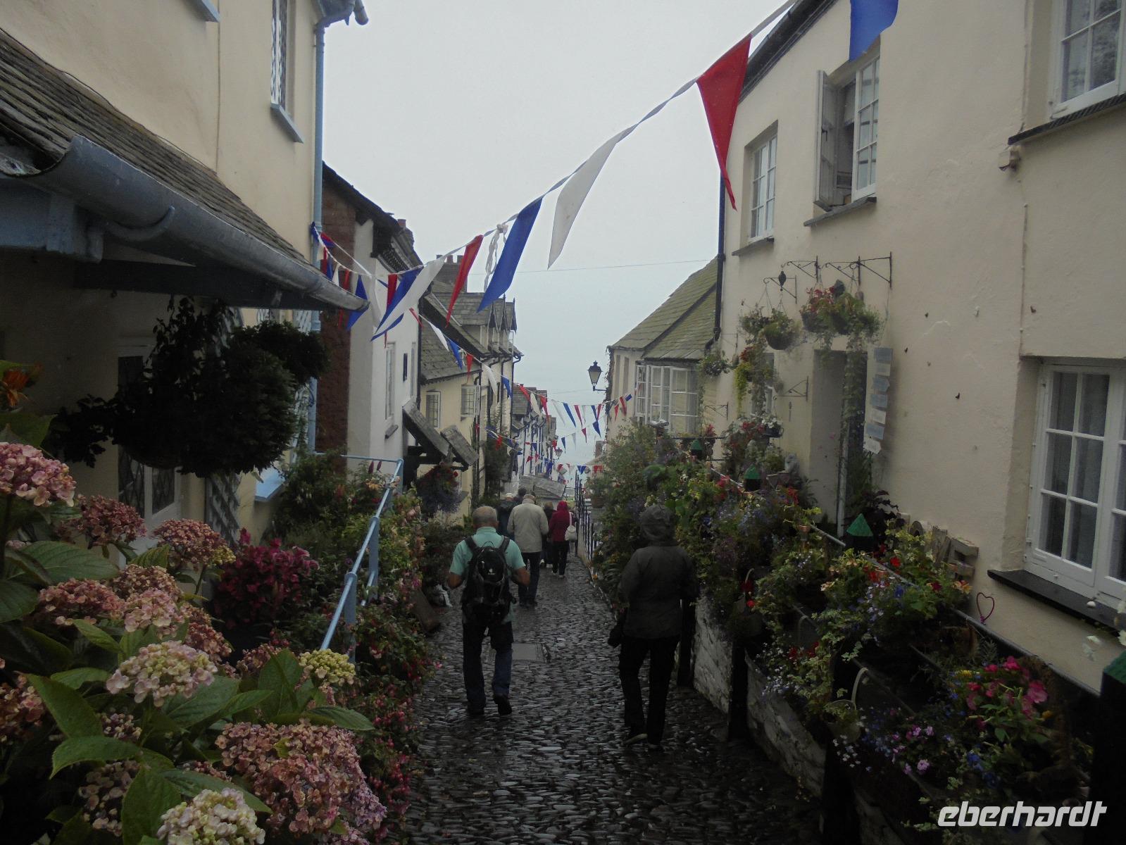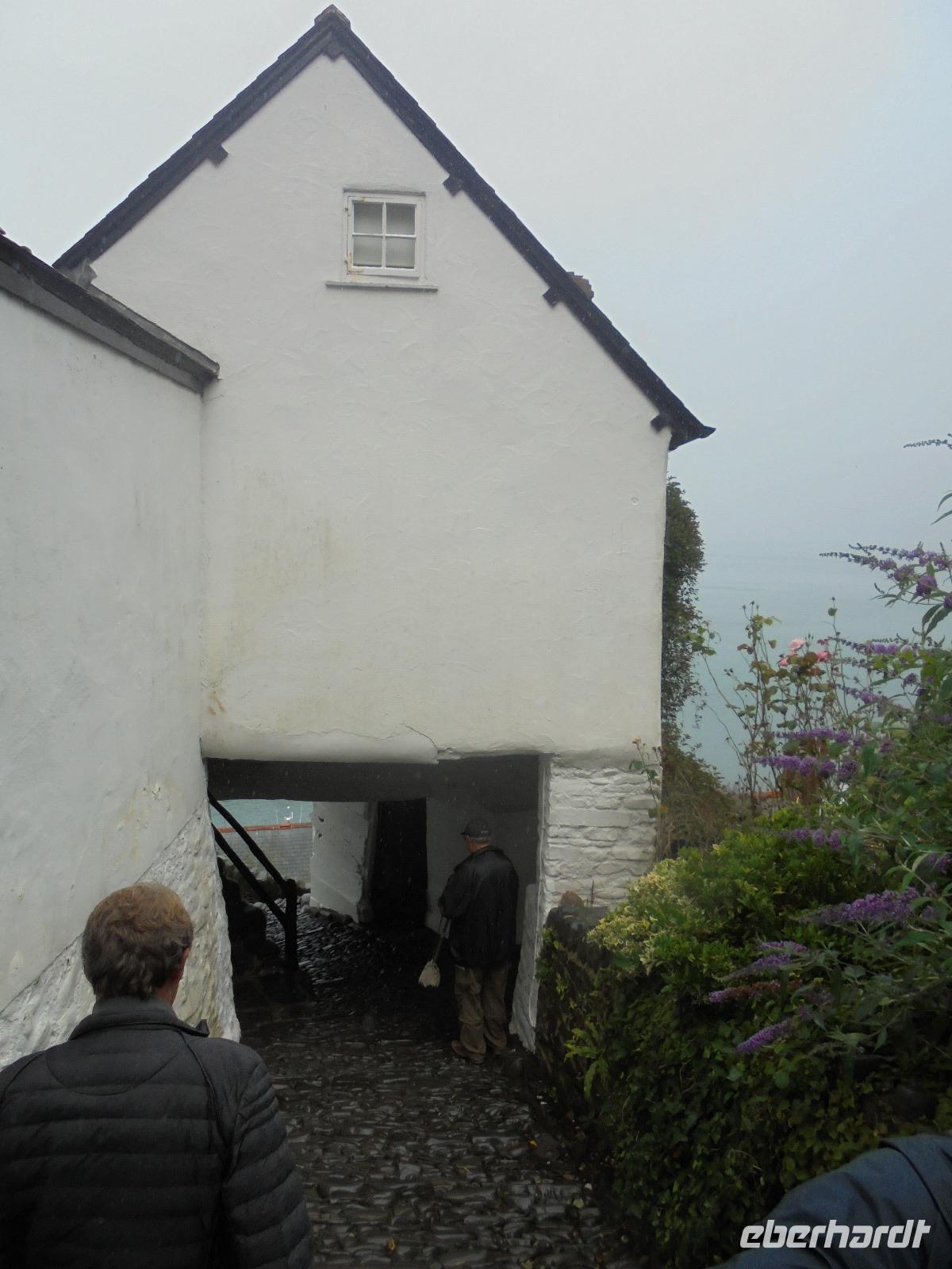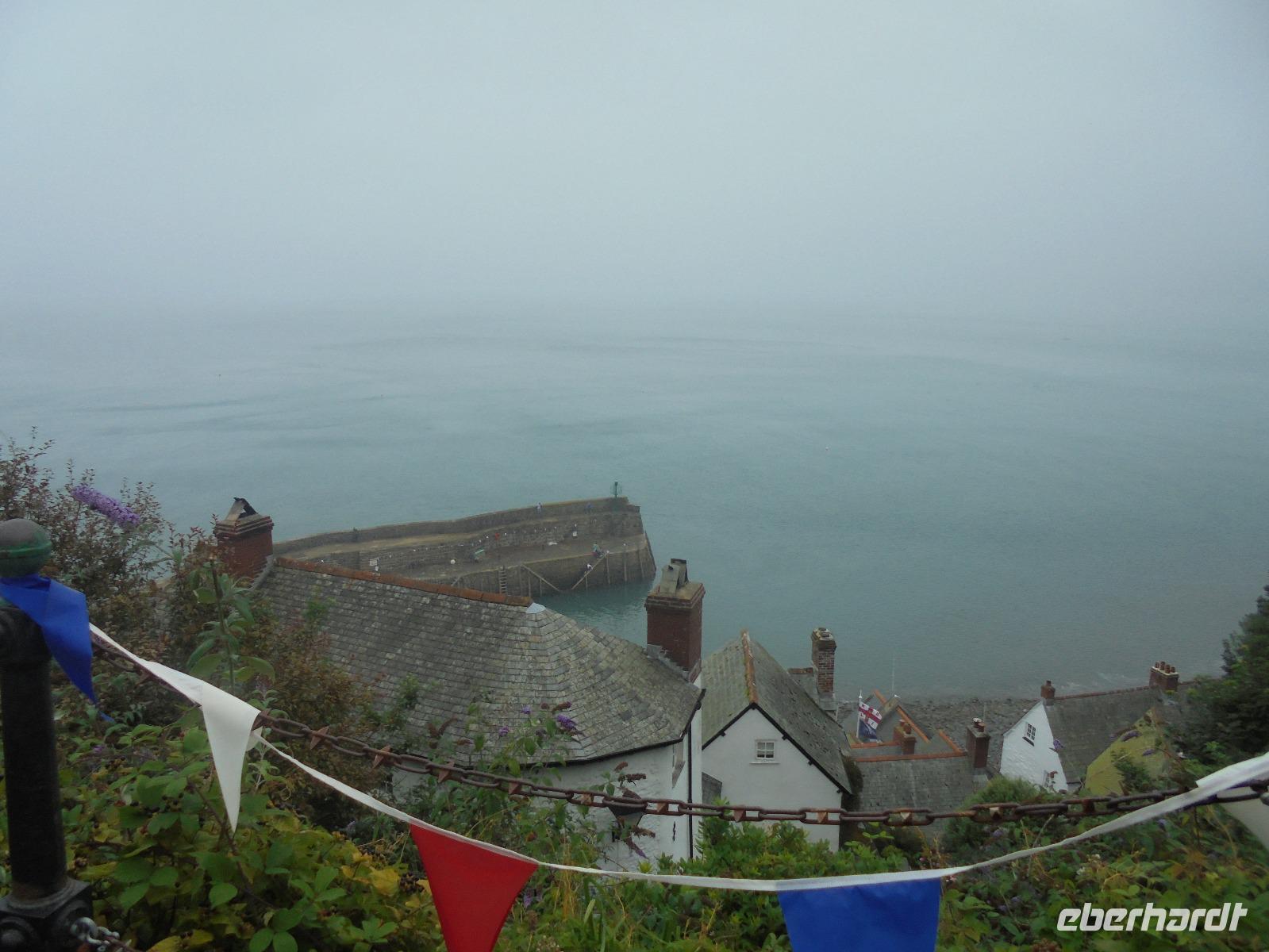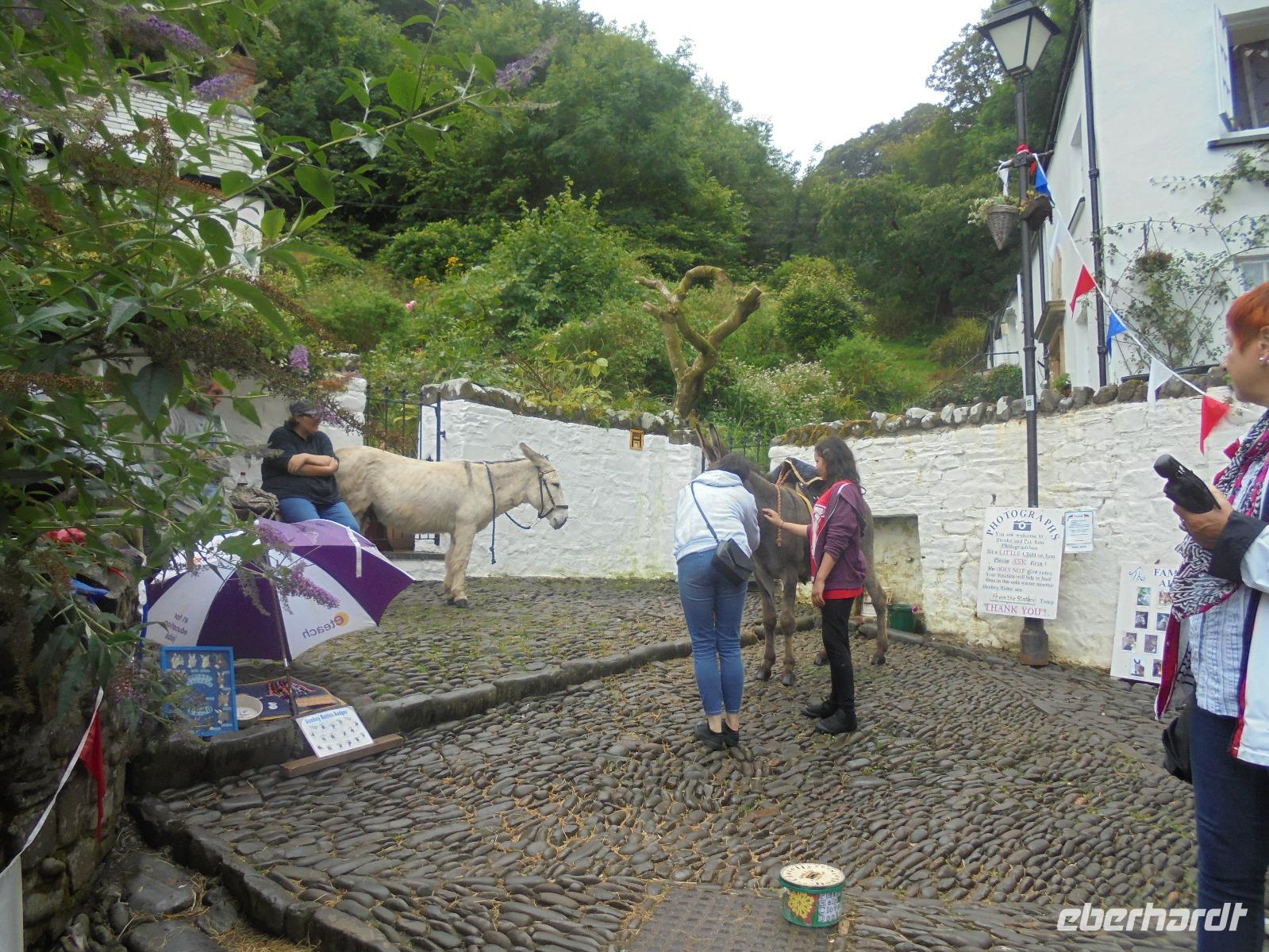 Auch der Aufenthalt in Clovelly wurde zu einem Höhepunkt. Seit langer Zeit ist das ganze Dorf im Privatbesitz, viele seiner Bewohner, die in malerischen weißgetünchten Häusern leben, betreiben bis heute Fischfang. Der Ort liegt außerordentlich malerisch an einem Steilhang und lockte stets viele Touristen an. Man kann ihn nur zu Fuß besichtigen, aufgrund des steilen Gefälles und der engen, kieselgepflasterten Straßen könnten hier gar keine Autos fahren. So wird selbst heute noch der Warenverkehr wie früher mit einer Art Gleitschlitten abgewickelt oder per Esel. Wir liefen den steilen, mehrere hundert Meter langen Weg mit seinem glatten Kieselpflaster bis hinunter zum Hafen, der von einer zangenförmigen Kaimauer aus dem 14.Jh. gebildet wird.