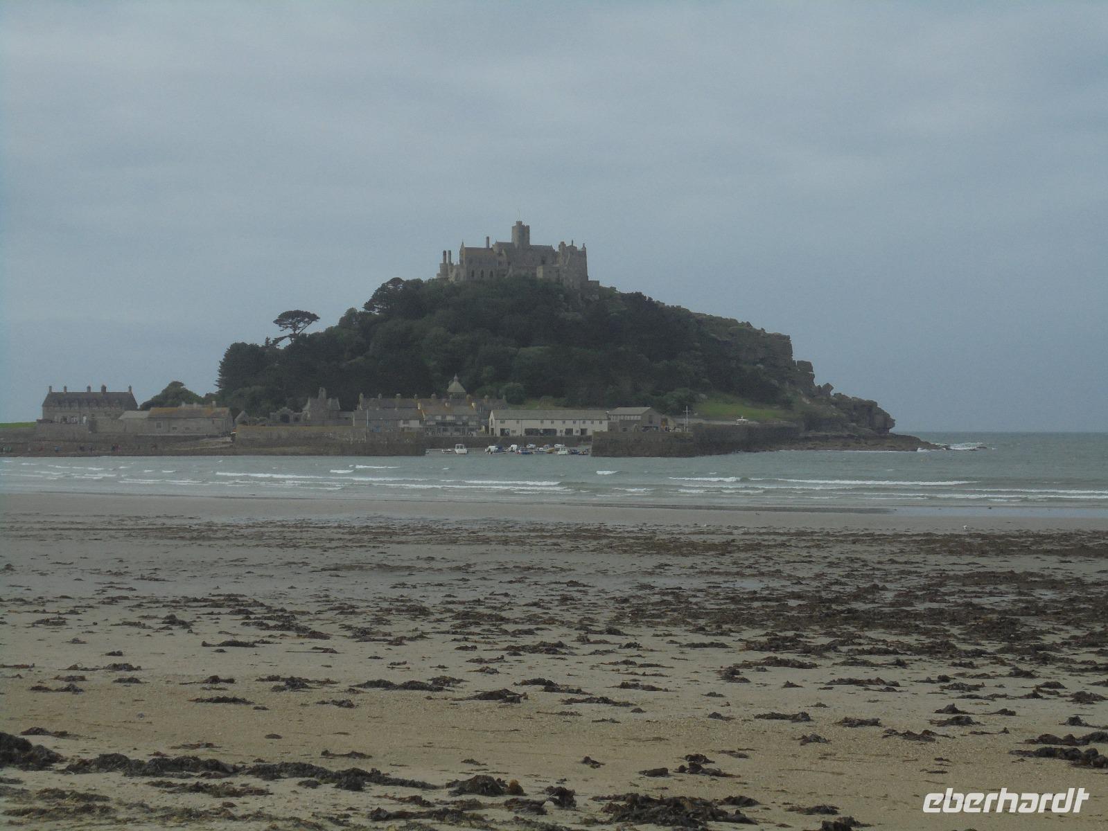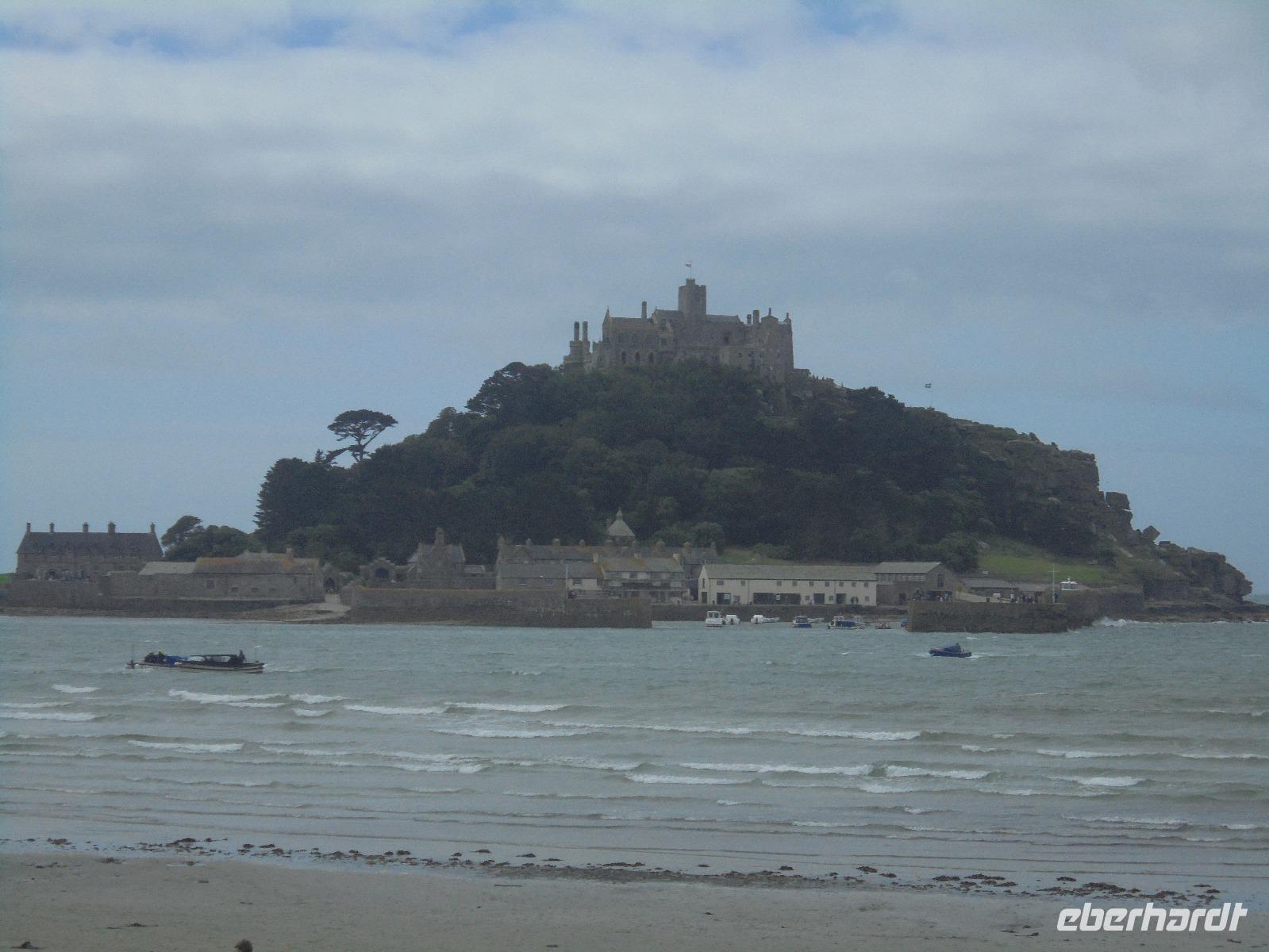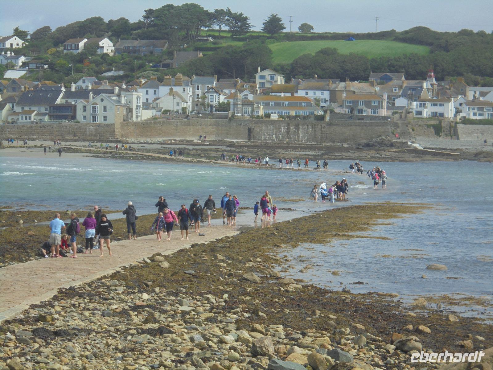 Er war denn auch heute unser erstes Ziel. Wir fuhren in das hübsche Städtchen Marazion, vor dessen Küste nur wenige hundert Meter entfernt der Felsen des St. Michael's Mount liegt. Wie bei seinem französischen Namensvetter, mit dem der englische Berg übrigens durch gemeinsame Geschichte verbunden ist, handelt es sich um eine Gezeiteninsel. Mit nur wenigen hundert Quadratmetern Fläche liegt sie knapp 500 m vor Marazion in Cornwall im Meer. Ein gepflasterter Dammweg ermöglicht es, das Eiland bei Ebbe zu Fuß zu erreichen. Erst bei Flut wird St. Michael's Mount tatsächlich zur Insel und ist nur noch mit dem Boot erreichbar. Da wir die Fluttabelle kannten, hatten wir es zeitlich so eingerichtet, dass wir zu Fuss über den Damm zur Insel marschierten. Während unserem Aufenthalt hier konnten wir dann beobachten, wie sich das Meer diesen Weg „zurückholte", indem die steigende Flut den Damm überschwemmte. Wir hatten Zeit, um die Klosterfestung besichtigen, deren Burgberg mit Kapelle - nach der Säkularisierung des Klosters in eine Festung umgewandelt - sich bis heute in Privatbesitz befindet. Bis heute lebt hier noch die Besitzer-Familie der St. Aubyns auf dem Burgfelsen, um den herum sich malerisch einige Häuser am kleinen Hafen gruppieren. Zum Besuch kann man die historische Pilgertreppe an der alten Molkerei vorbei und durch die Anlagen des kleinen subtropischen Gartens zur Burg emporklimmen. Bis heute ist der legendenhafte Ruf der Pilgerstätte erhalten und bis heute genießt der Ort eine gewisse VerehrungNach dem Besuch der Insel St. Michael's Mount, den wir, durch die steigende Flut gezwungen, mit einer kurzen Bootsfahrt beendeten, konnten wir noch etwas durch den hübschen Ort Marazion flanieren, bevor es weiterging nach Land's End.