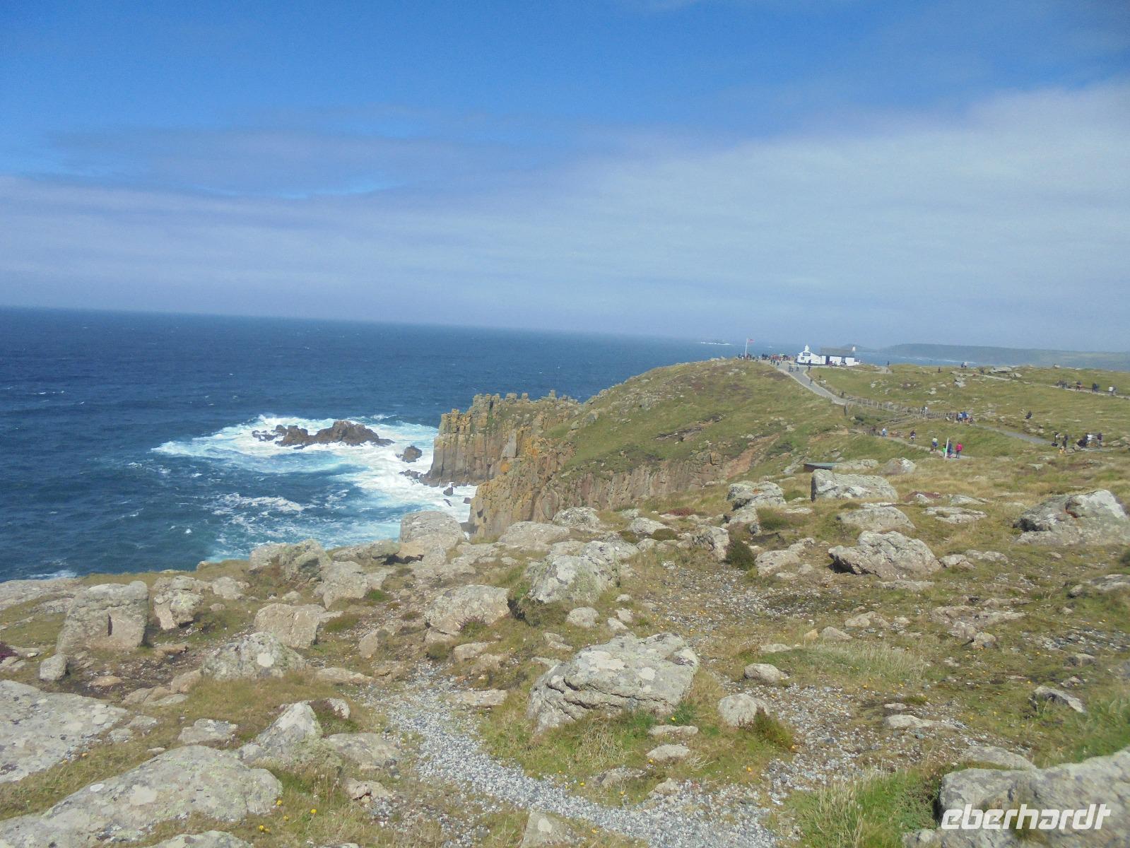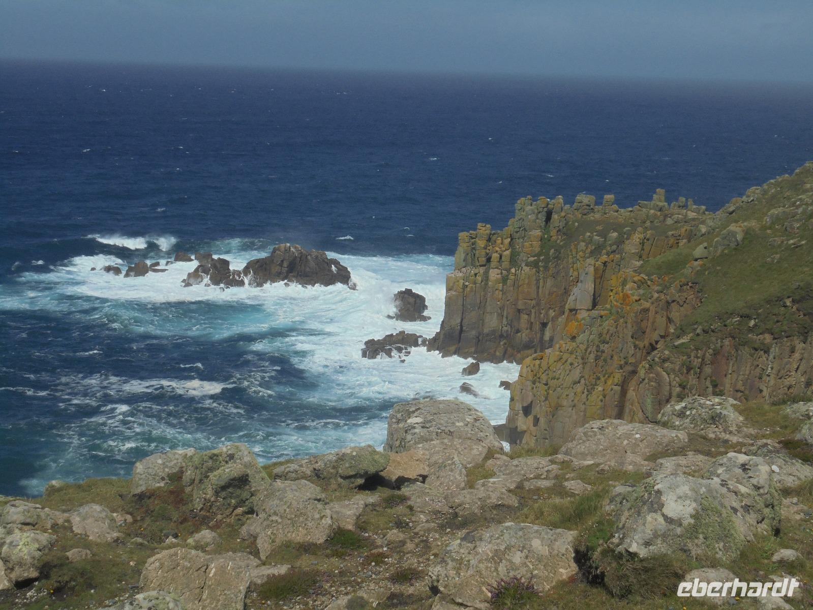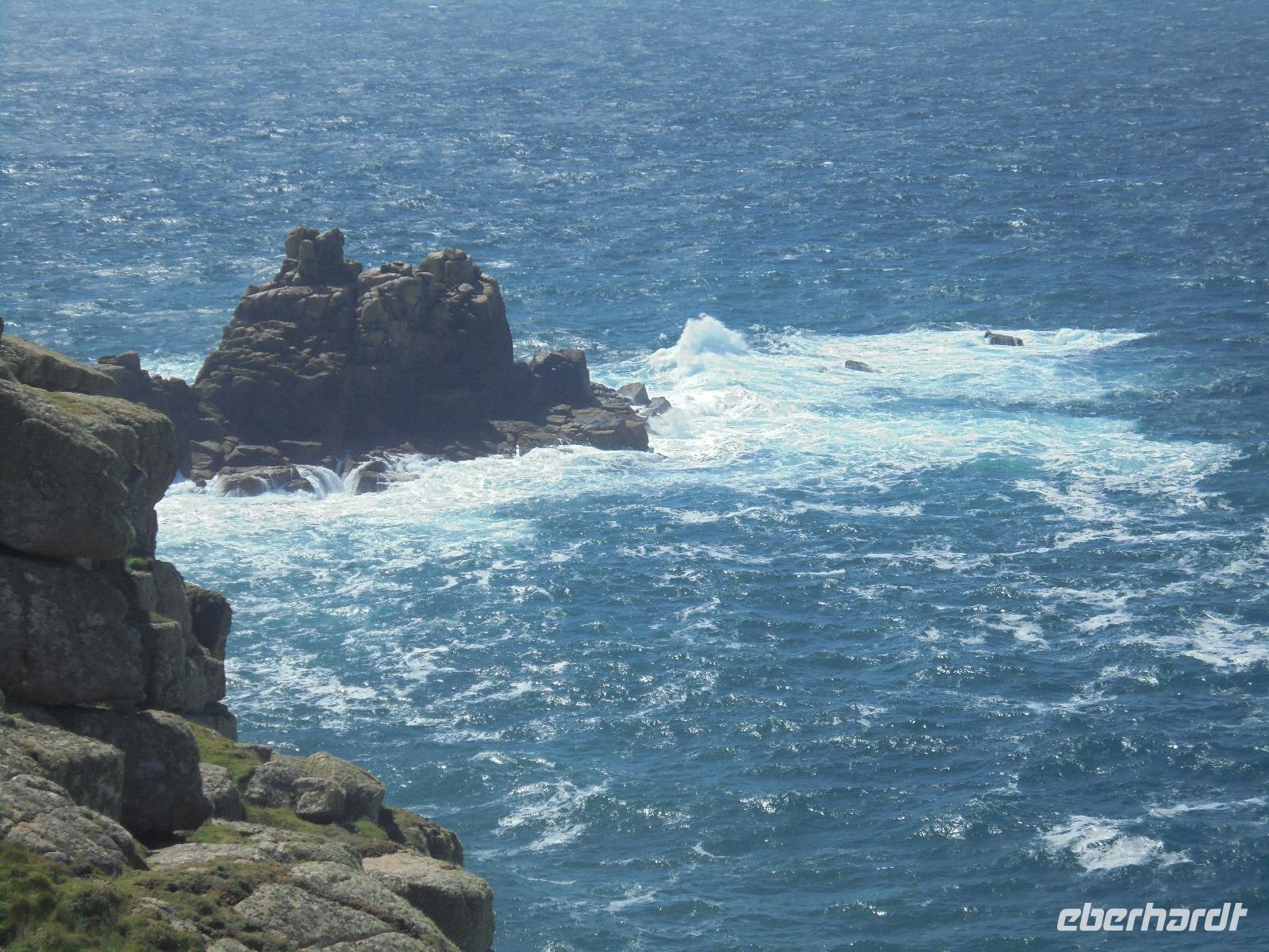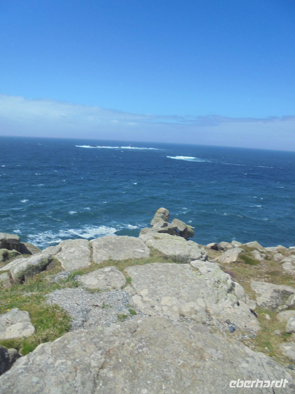 Das ist die zerklüftete Südwestspitze Cornwalls, bekannt für ihre wilden Felsenszenerien. Die wind- und brandungsumtosten roten und grauen Felsen und ihre vorgelagerten Riffe sind seit Jahrhunderten nicht nur Landmarke, sondern auch eine Gefahr für die Schiffahrt und man sagt, ein gewaltiger Schiffsfriedhof breite sich hier in den vorgelagerten Gewässern aus. Daher hat man etwa zwei Kilometer vor der Küste ein weithin sichtbares Seefeuer aufgestellt: der Longship Leuchtturm steht auf der vorgelagerten Riffkette aus Quarzit und Serpentinit.