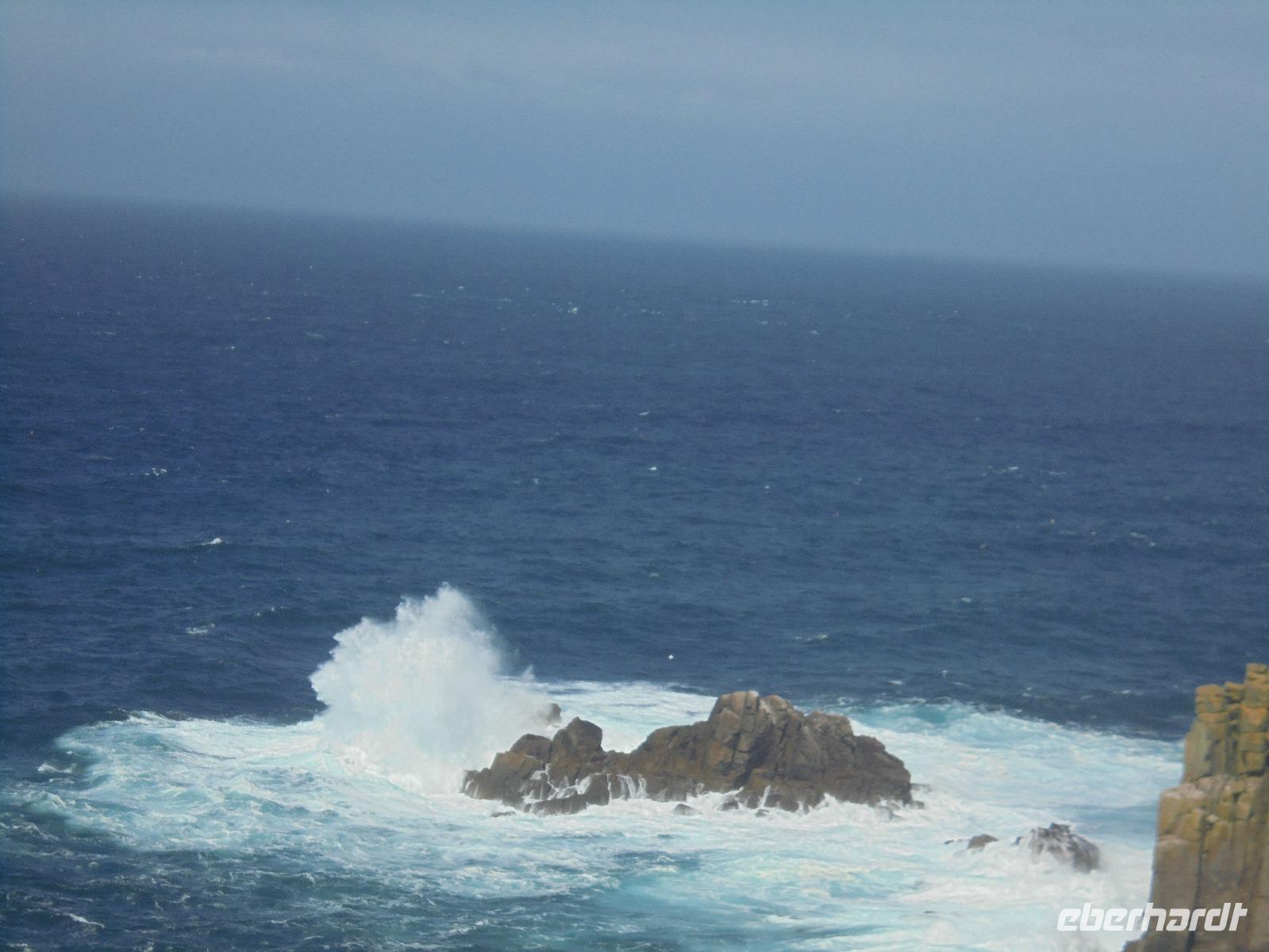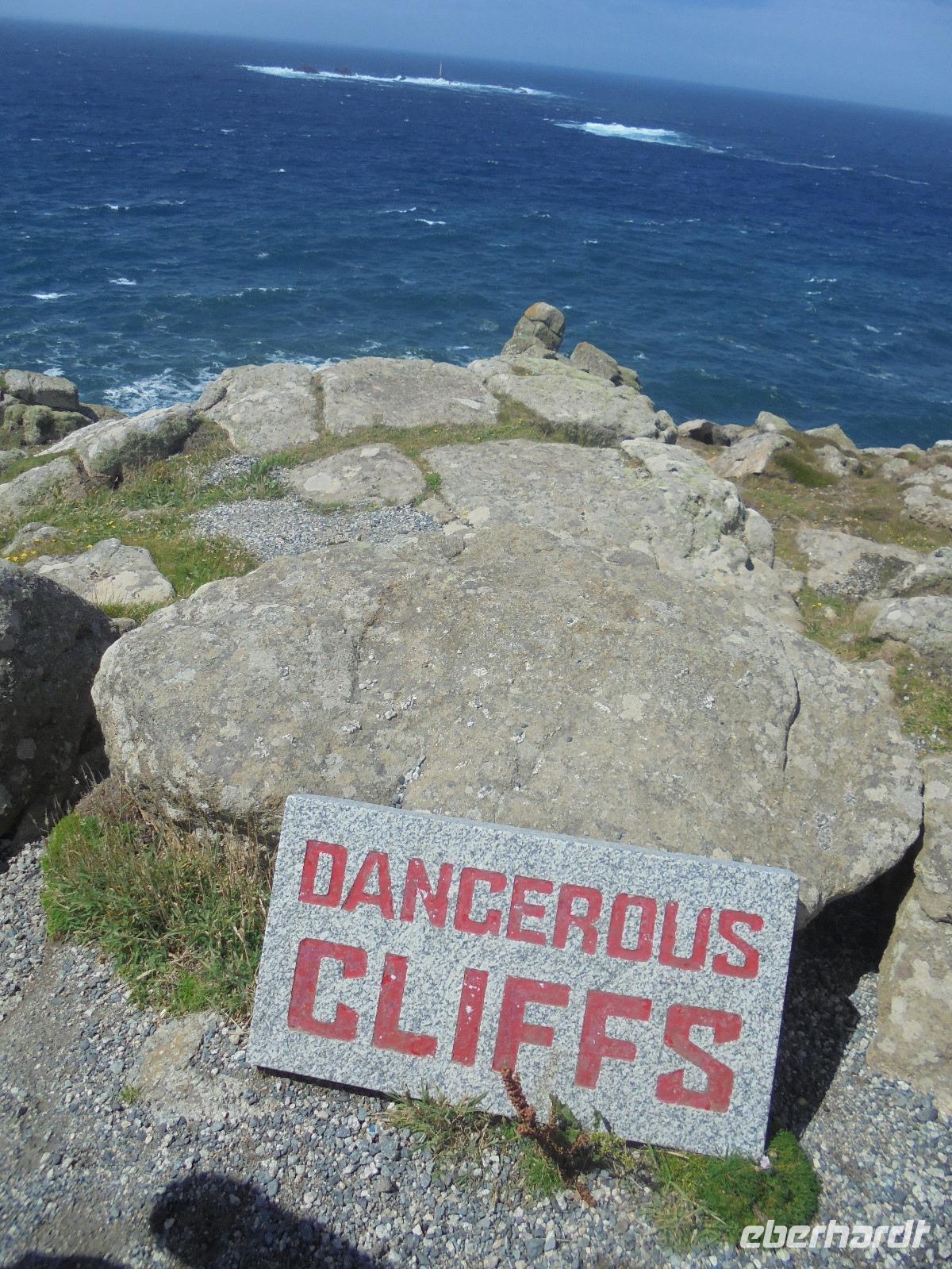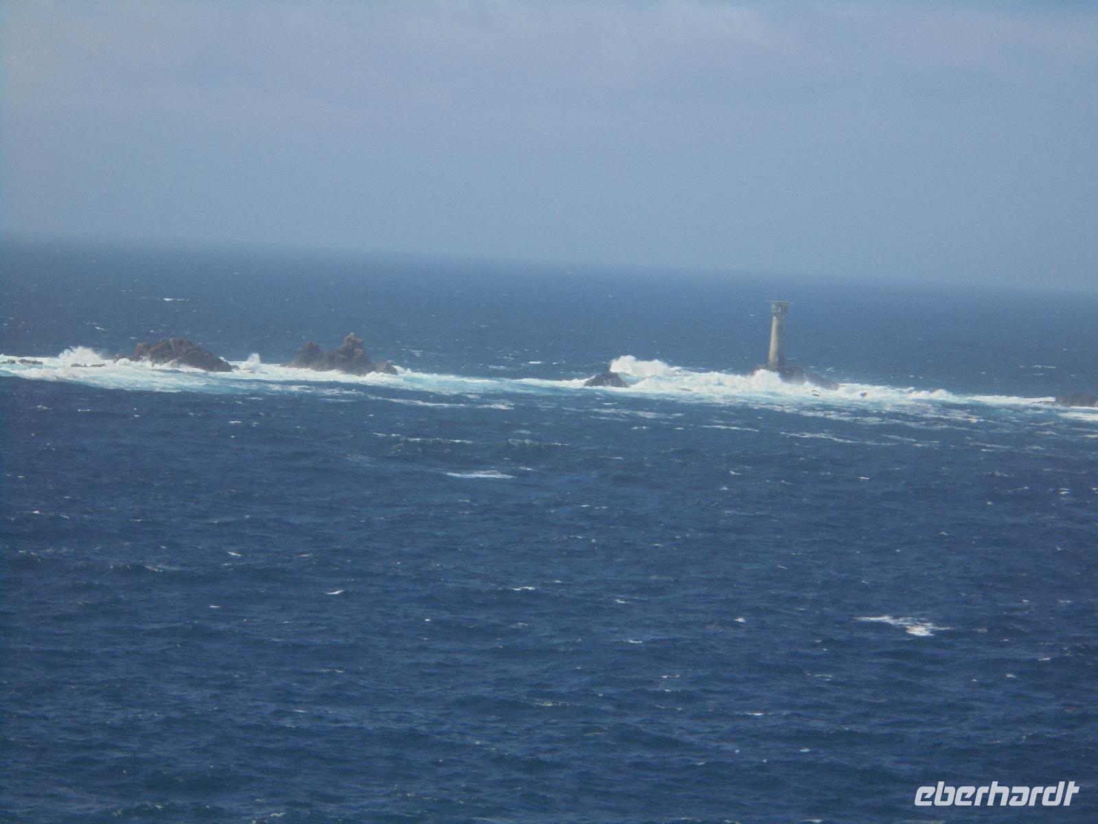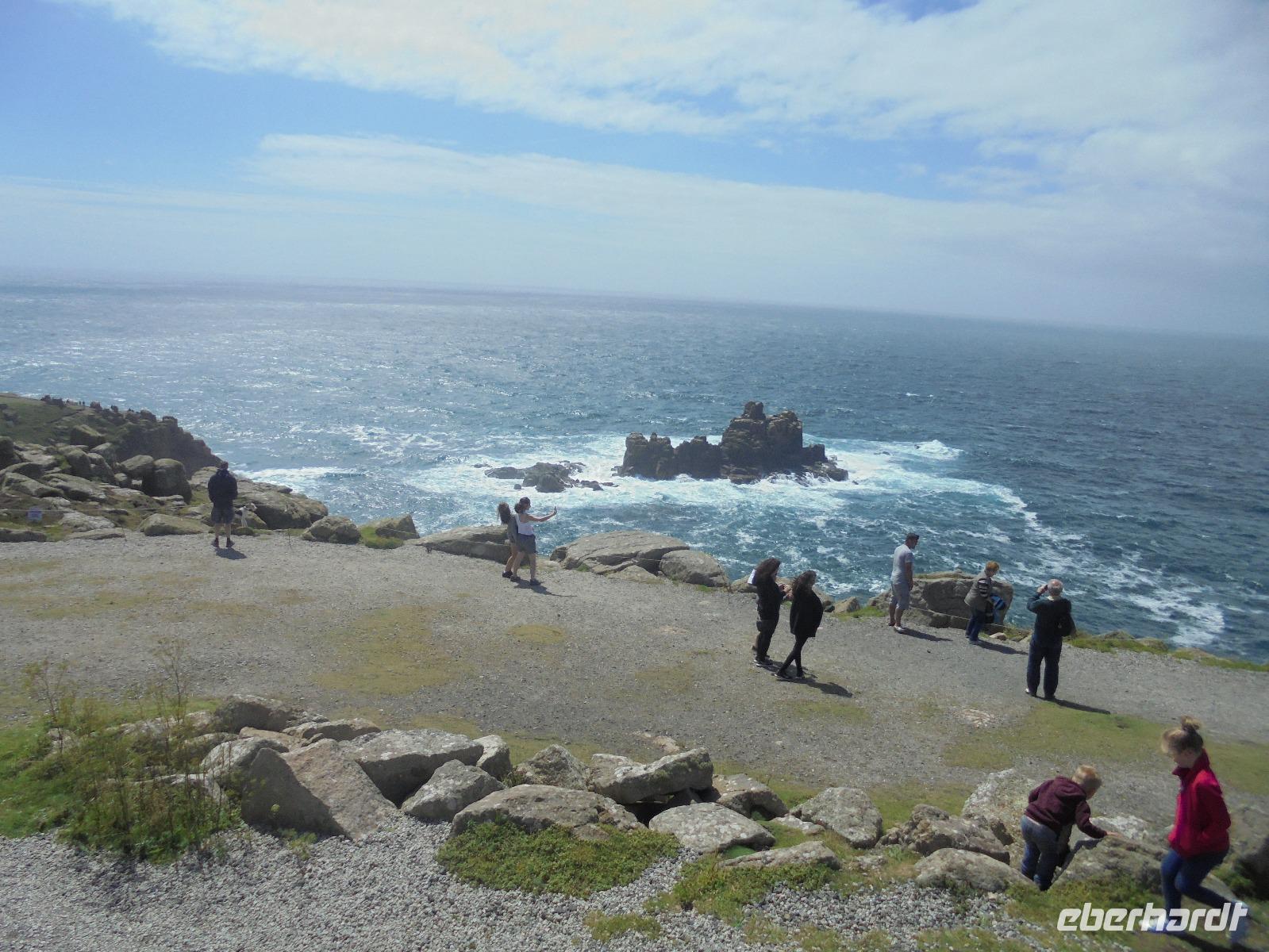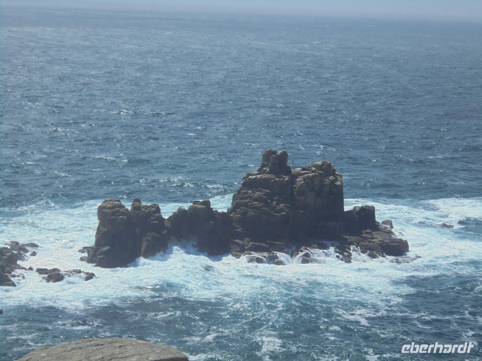 Das ist die zerklüftete Südwestspitze Cornwalls, bekannt für ihre wilden Felsenszenerien. Die wind- und brandungsumtosten roten und grauen Felsen und ihre vorgelagerten Riffe sind seit Jahrhunderten nicht nur Landmarke, sondern auch eine Gefahr für die Schiffahrt und man sagt, ein gewaltiger Schiffsfriedhof breite sich hier in den vorgelagerten Gewässern aus. Daher hat man etwa zwei Kilometer vor der Küste ein weithin sichtbares Seefeuer aufgestellt: der Longship Leuchtturm steht auf der vorgelagerten Riffkette aus Quarzit und Serpentinit.