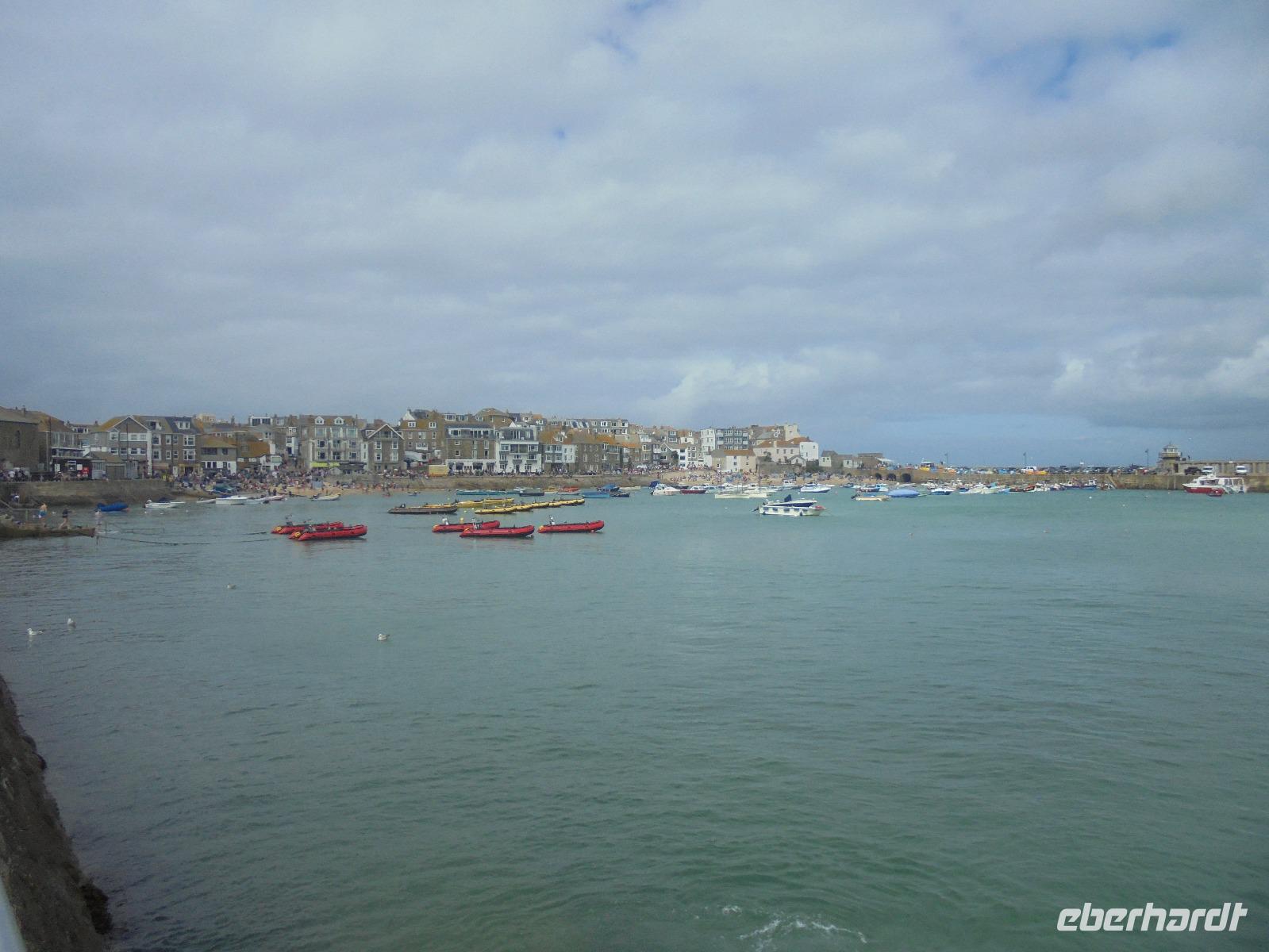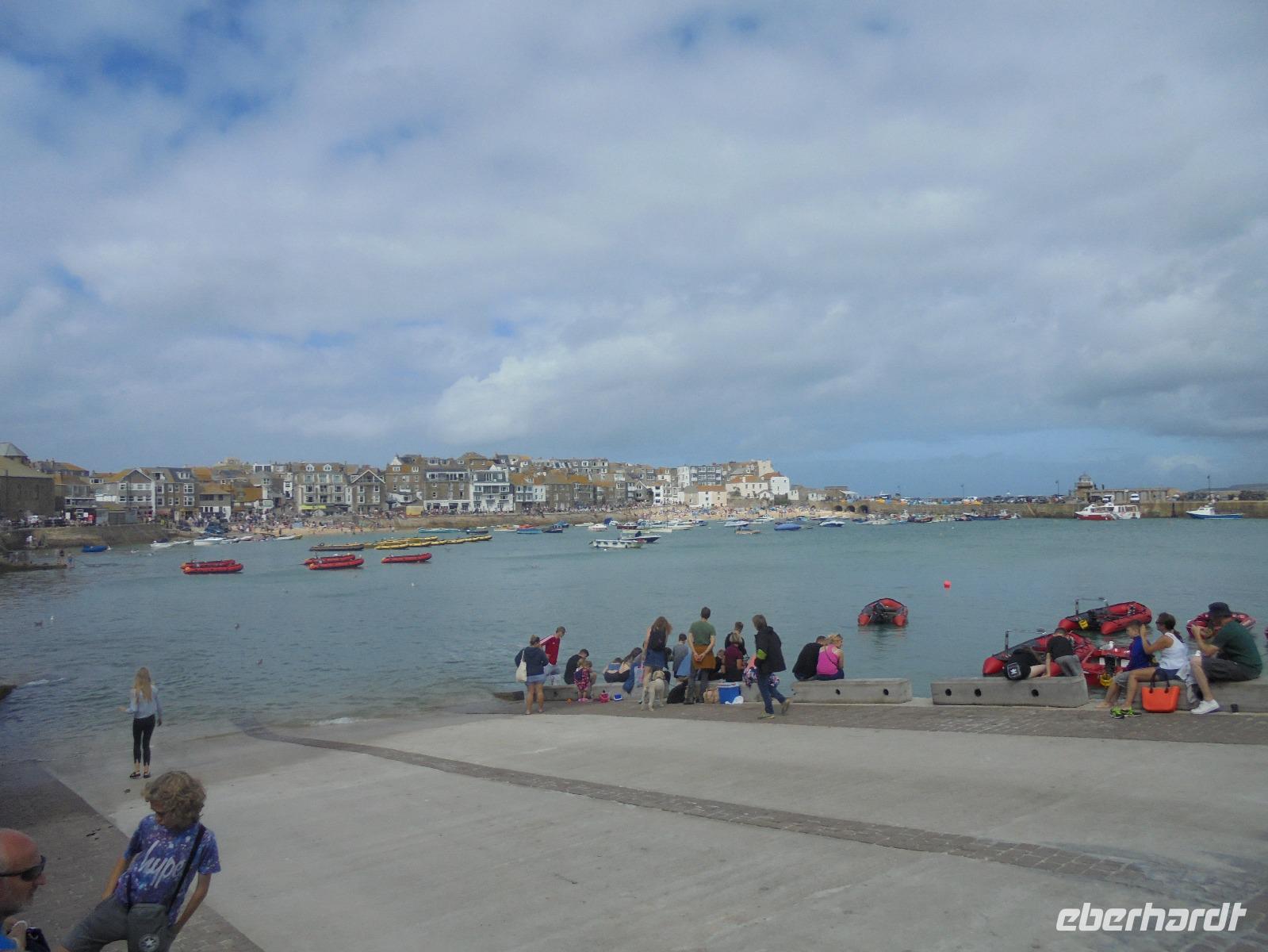 Am Nachmittag gönnten wir uns wiederum einen kleinen Abstecher: bis zur Rückkehr zum Abendessen ins Hotel in Newquay blieb noch etwas Zeit und wir konnten wir den malerischen Bade- und Fischerort St. Ives besuchen. Vom Busparkplatz aus bringen Shuttlebusse regelmäßig die Touristen ins überlaufene Stadtzentrum, in dem man sich dann nur zu Fuß bewegen kann. Das Städtchen St. Ives ist für drei Dinge berühmt: für seine Sandstrände, den geschäftigen Hafen voller Ausflugsboote und dafür, dass unweit von hier Rosamunde Pilcher geboren wurde. Trotz der vielen in- und ausländischen Touristen kann man bei einem Bummel hier die engen geschäftigen Straßen, die herrliche Atmosphäre und - so wie wir - das schöne Sonnenwetter und dann natürlich zahlreiche Cafés, Eisdielen und Pubs genießen.