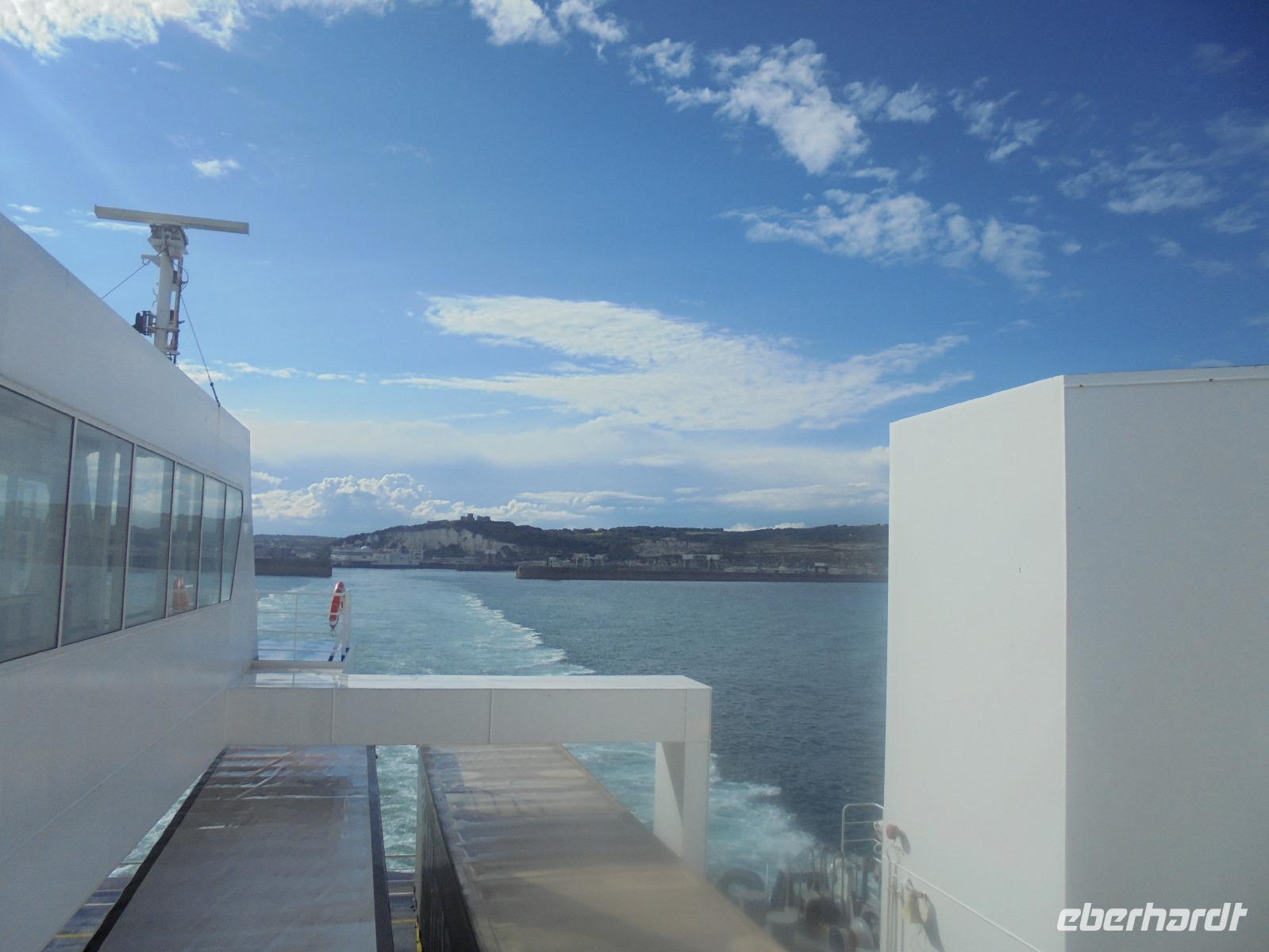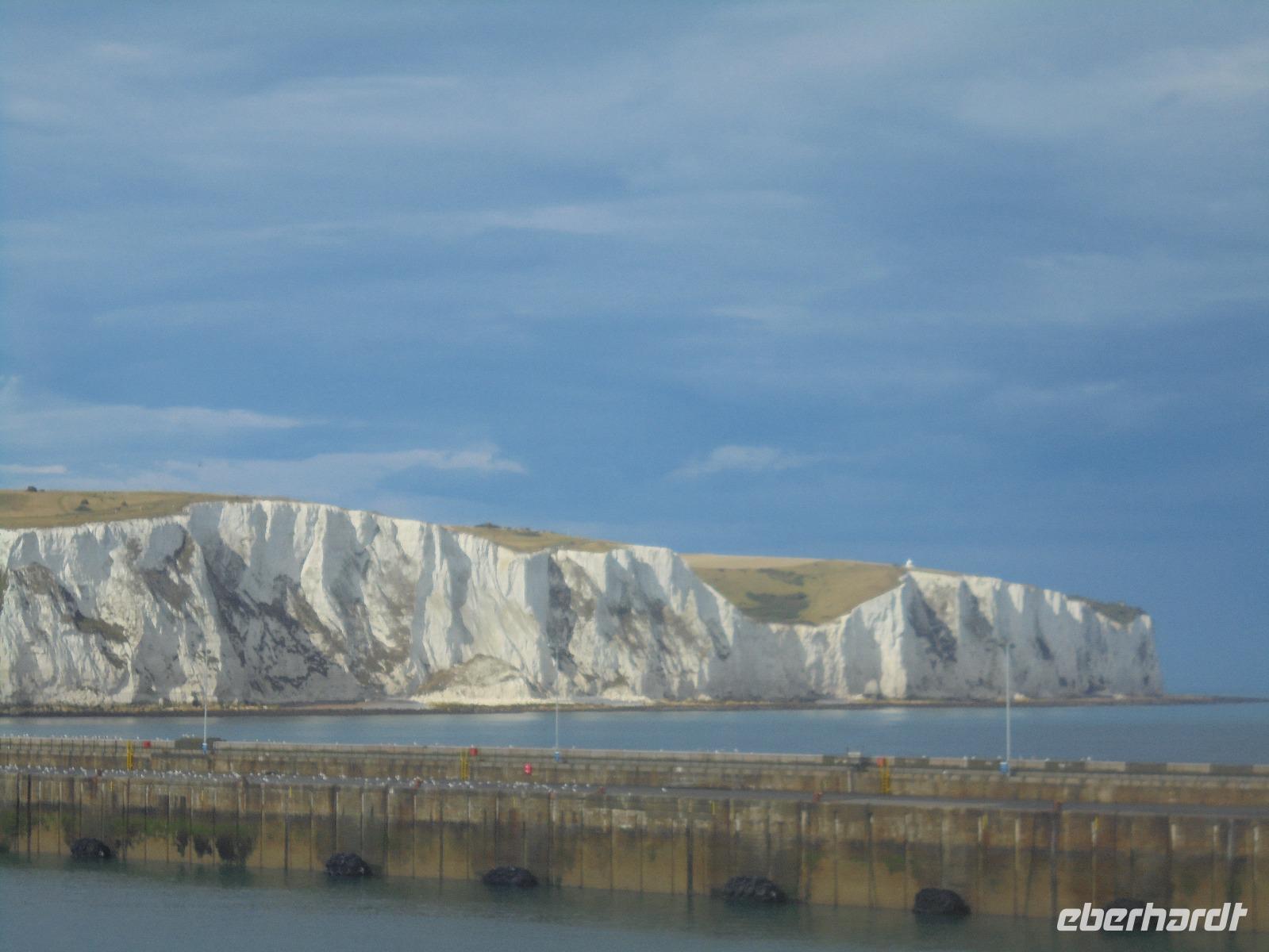 Vom Rathausplatz brachen wir dann zum Fährhafen auf, den wir pünktlich erreichten und wo wir dann zunächst durch den Container mit der französischen und danach britischen Passkontrolle mussten. Es ging zum Schiff der DFDS-Fährgesellschaft, das uns dann in weniger als zwei Stunden zu den berühmten Kreideklippen von Dover brachte. Zwar war das Wetter nicht ganz so, dass sie so weiss leuchteten wie erwartet - allerdings sollten wir diesen Eindruck dann ganz unerwartet bei der Rückfahrt haben...