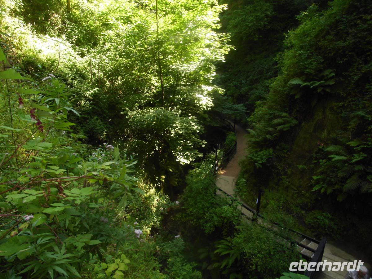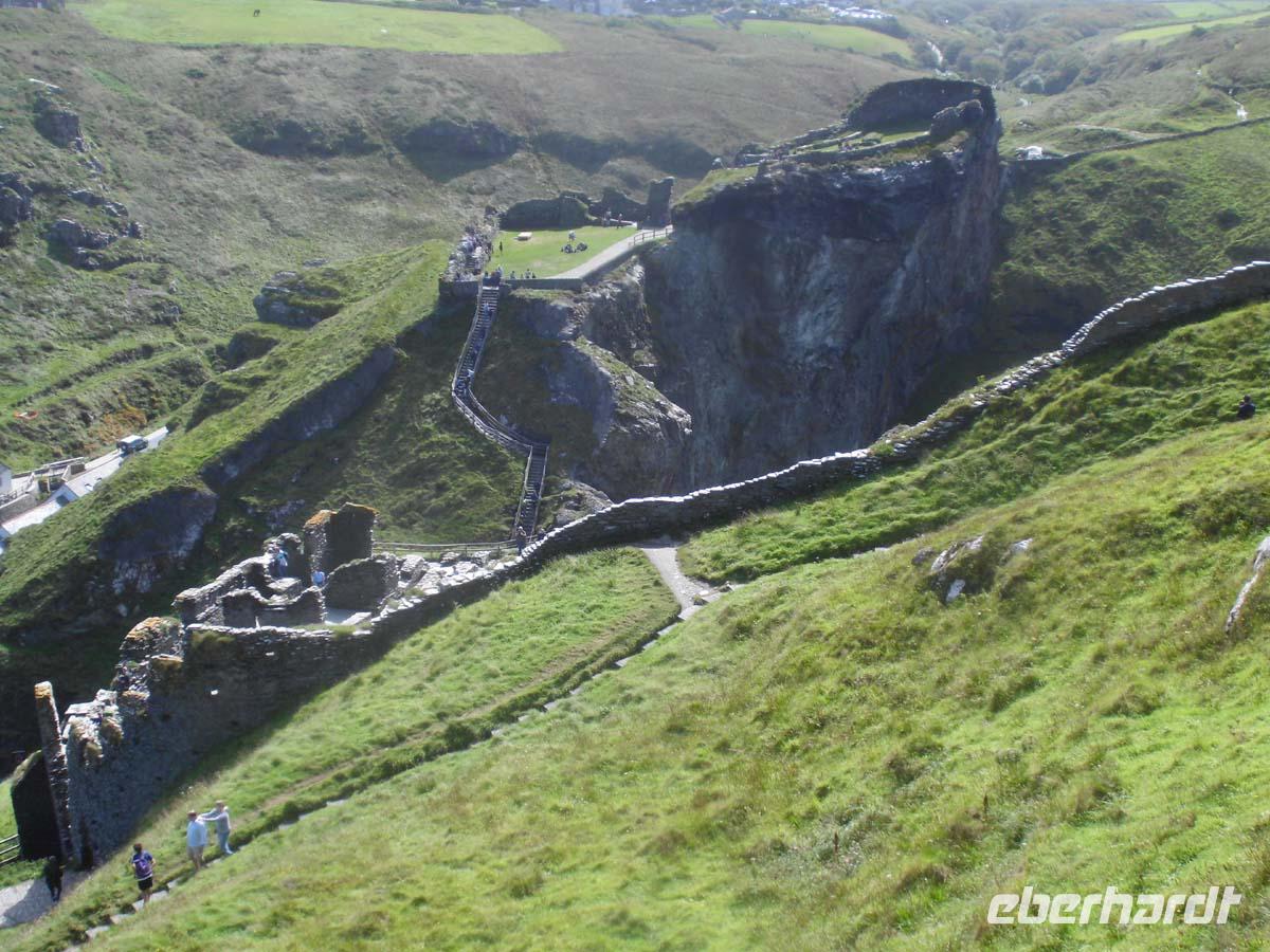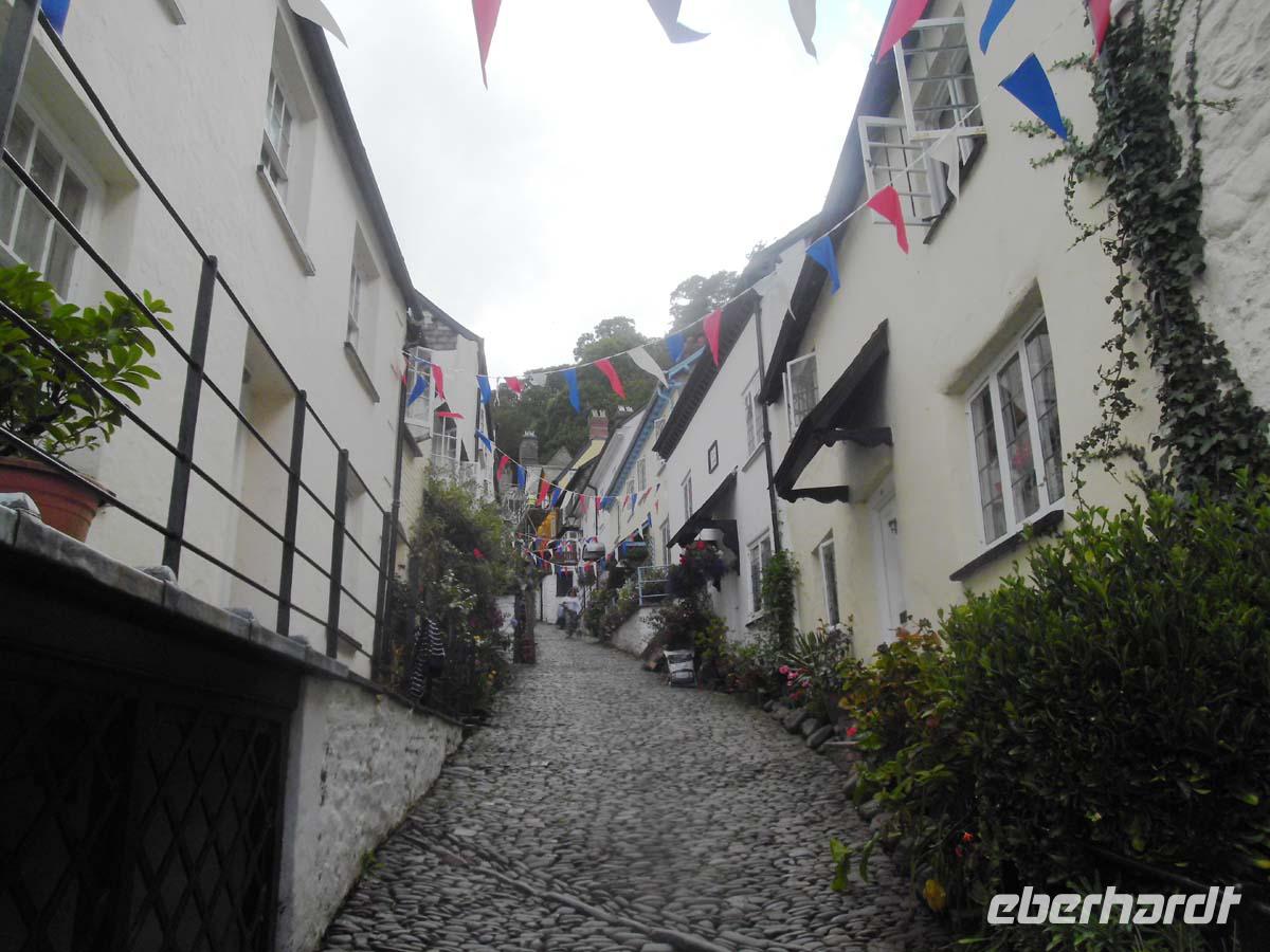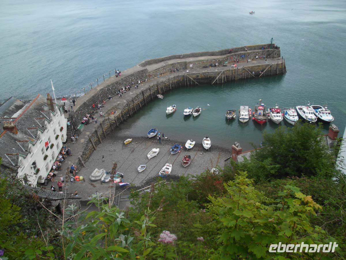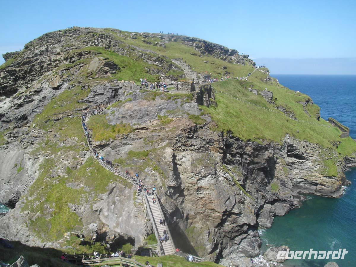 Der heutige Ausflug ist fakultativ. Einige Gäste verbringen den Tag in Newquay. Das Gros der Gruppe aber nimmt an dem Ausflug auf den Spuren von König Artus teil. Er führt uns zur mächtigen Burg Tintagel, auf der der Sage nach Artus das Licht der Welt erblickt haben soll. Ausgrabungen haben tatsächlich Funde aus dem 5. und 6. Jahrhundert zu Tage gefördert. Heute ist aber vor allem die Ruine einer hochmittelalterlichen Burg zu sehen, deren Mauern schon sehr beeindruckend sind. Sie besteht aus einer Vorburg und der Hauptburg, welche sich auf einem Felsen im Meer erhebt. Der Aufstieg über eine steile Treppe ist recht anstrengend, lohnt sich aber. Und an der Spitze steht König Artus als Denkmal aus Bronze mit seinem Schwert Exkalibur. Der Ort Tintagel selbst ist voll auf Tourismus eingestellt. Viele nette Läden laden zum Stöbern ein. Auch das Besucherzentrum ist gut sortiert. Nach unserem Mittagessen reisen wir nach Clovelly. Es ist ein denkmalgeschütztes Fischerdorf, welches man nur zu Fuß erkunden kann. Steil schmiegt es sich an die Küste und besteht im Grunde nur aus 2 Gassen. Seit über 250 Jahren befindet es sich im Besitz der Familie Rous, welche die Eintrittsgelder zum Erhalt des Dorfes verwendet. Wer möchte, kann sich auch auf dem Rücken eines Esels durch das Dorf führen lassen. Man kann sich jedoch den mühevollen Aufstieg hinauf zum Busparkplatz ersparen. Neben dem Dorf gibt es eine Versorgungsstraße für das einzige Hotel unten am Hafen aus dem 14. Jh,. Hier wird ein Shuttleservice angeboten. Mit Landrovern werden die Gäste für 2 Pfund 50 bequem den Berg hinauf gebracht. Mit dem Gefühl, heute zwei einzigartige und weltberühmte Dinge besichtigt zu haben, nehmen wir im Hotel unser Abendessen ein.