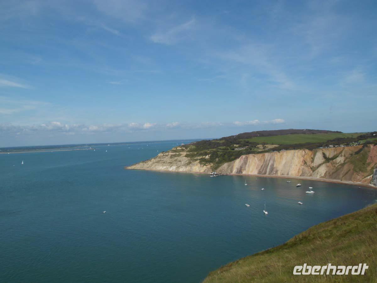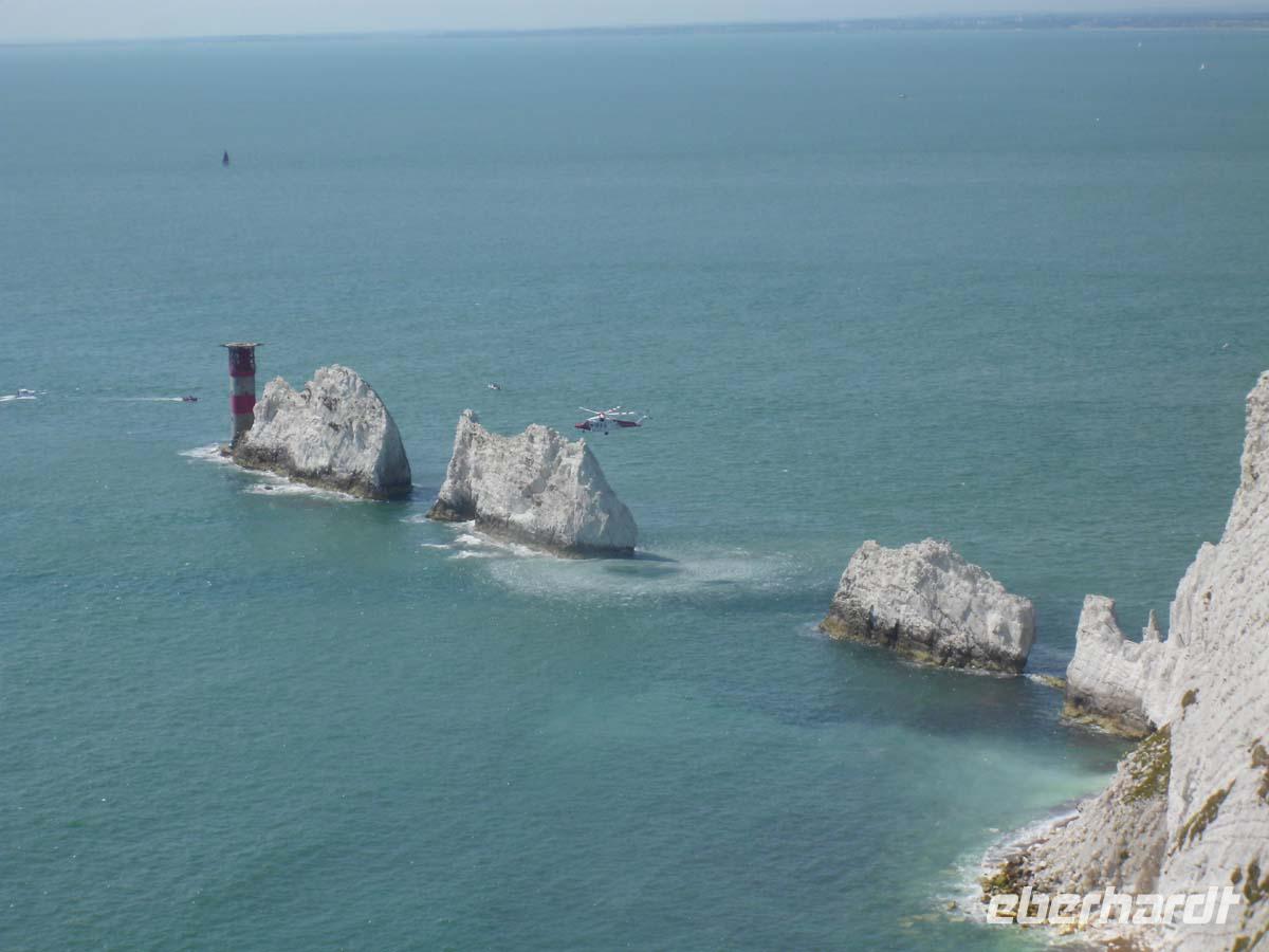 Heute erkunden wir die Isle of Wight. Von Southampton setzen wir mit der Fähre über den Solent über. So heißt die Meerenge, die erst nach der letzten Eiszeit die Insel zu einer solchen machte und heute ein beliebtes Seglerparadies ist. In East Cowes angekommen, begeben wir uns ziemlich in die Mitte nach Godshill. Es ist ein schmuckes kleines Dorf mit strohgedeckten Cottages und vielen kleinen Läden, in denen man viel gucken, und vielleicht auch kaufen kann. Als kleine Dreingabe stehen auch noch uralte Oldtimer neben uns auf dem Parkplatz. An der Südostküste erreichen wir Shanklin. Hier unternehmen wir einen Spaziergang durch den Schanklin Chine. Ein Chine ist auf der Isle auf Wight eine Klamm. In Jahrhunderttausenden durch Wasser in den Fels gefräst, dienten diese Chines früher auch als Schmugglerverstecke. Der Shanklin Chine gilt als der verwunschenste. Üppige, teils subtropische Vegetation umfängt uns auf dem durch Treppen unterbrochenen Pfad. Ein tiefer Wasserfall rauscht schon kurz nach dem Eingang im Dorf. Unten öffnet sich die Klamm zum Strand und ein Café lädt neben einer Kunstausstellung und großen Vogelvolieren zum Verweilen ein. Nach einem Aufenthalt am Strand und einem Kaffee am Bus streben wir dem Höhepunkt des Höhepunkt des Tages entgegen: Den Needles. Schroff ragen die markanten Kreidefelsen am westlichsten Punkt der Insel aus dem Meer. Wir erreichen sie nach einem kleinen Spaziergang von ca. 20 min. Diesen kann man gut als Verdauungsspaziergang ansehen, wenn man sich wie wir, vorher mit Fish & Chips gestärkt hat. So wie wir gekommen sind verlassen wir die Insel wieder auf der Fähre und haben von dort auch noch einen schöne Sicht auf Portsmouth.