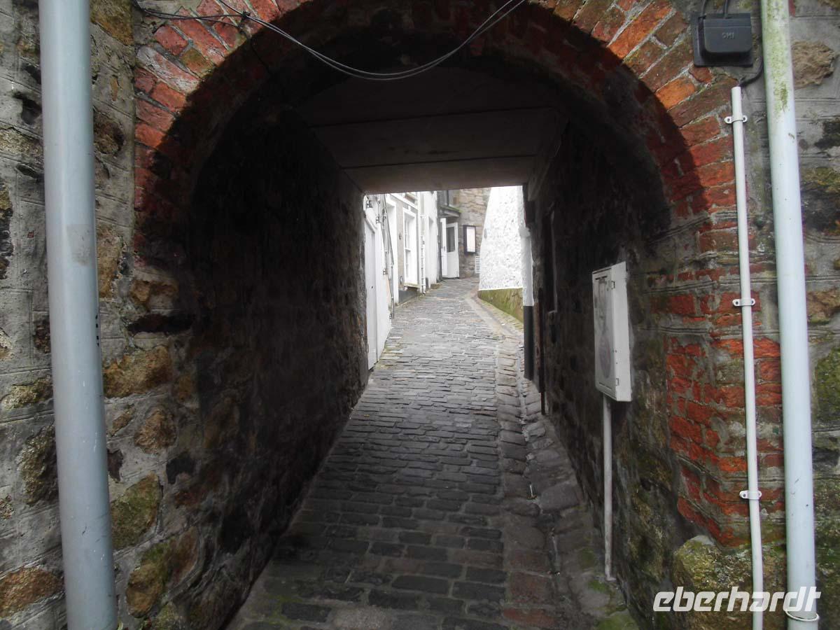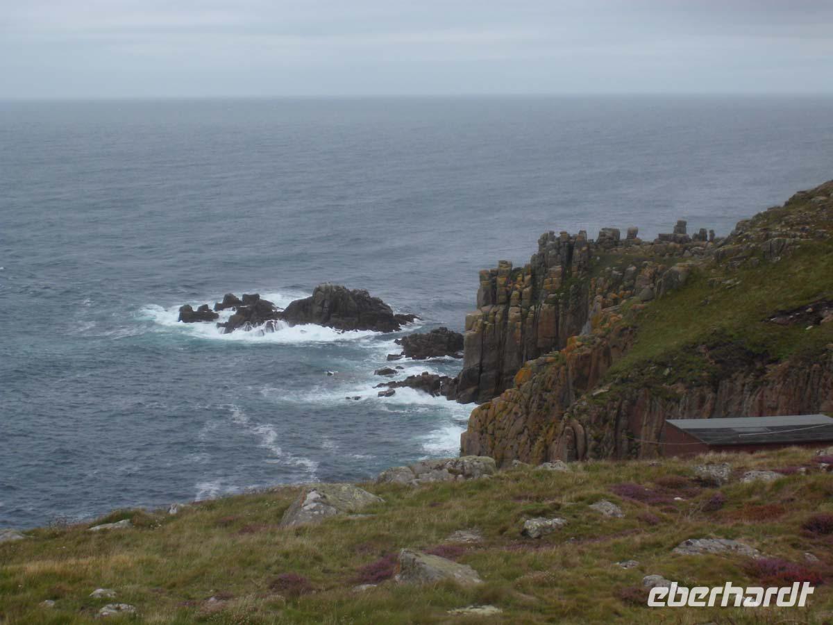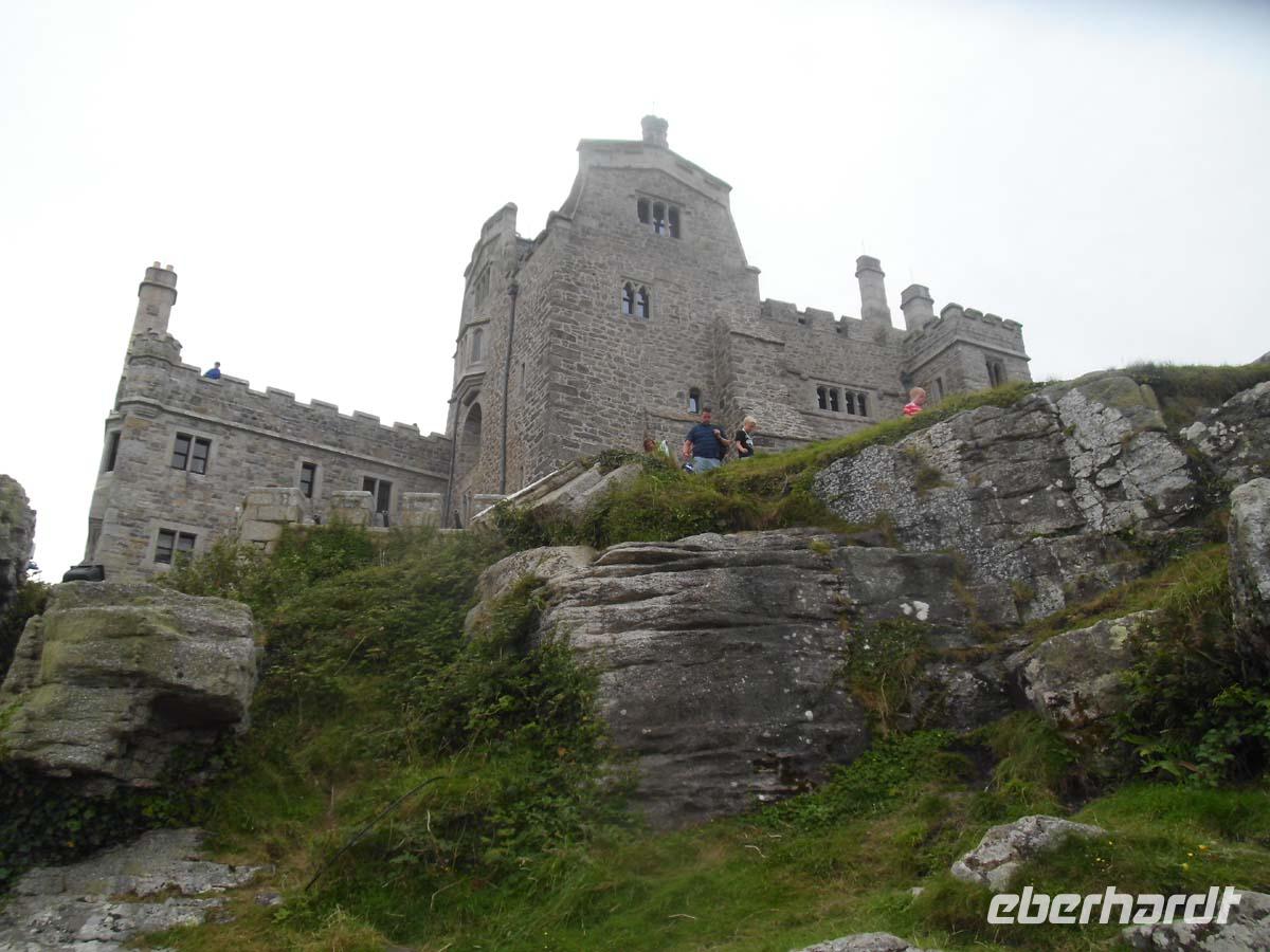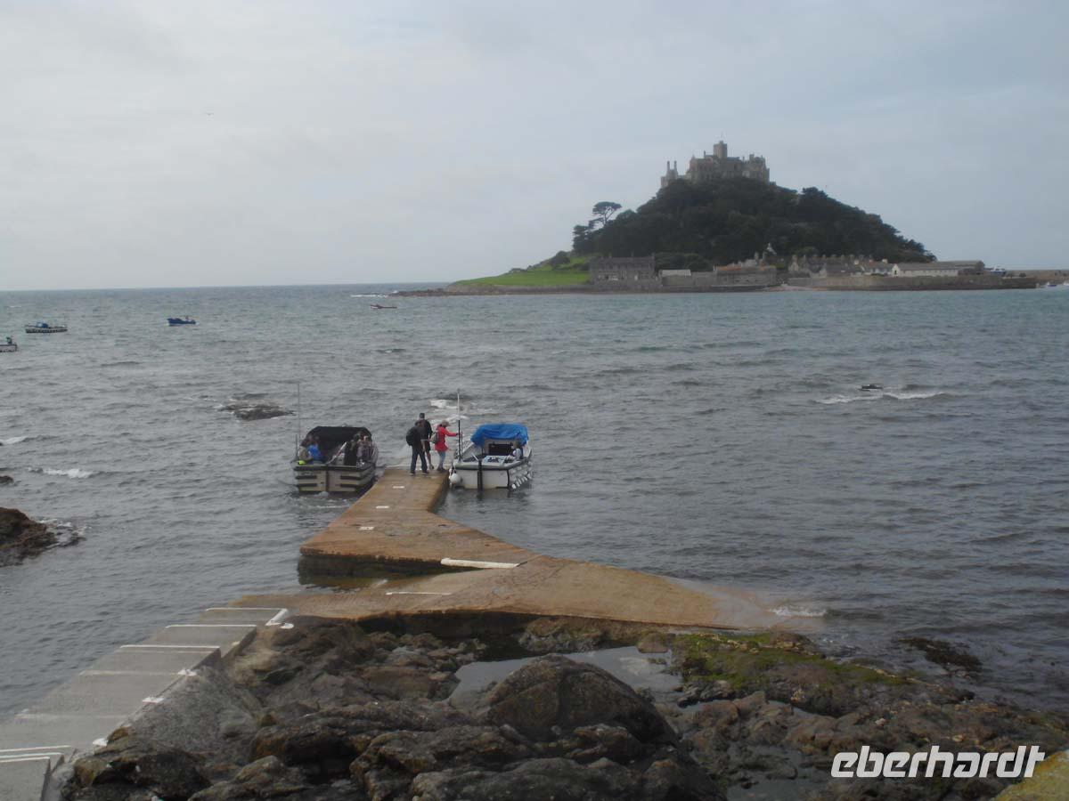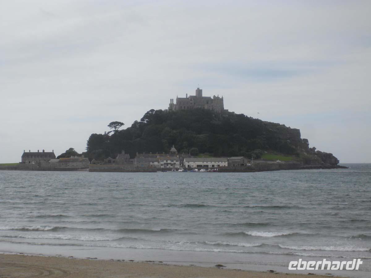Das Pendant von Mont St.Michel in Frankreich ist heut unser erstes Ziel. St. Michaels Mount wurde tatsächlich von den Mönchen dort gegründet. Wilhelm der Eroberer rief sie schon im 11. Jh. hierher. Nach und nach wich die religiöse Nutzung einer militärischen. Von hier aus wurde z. B. das erste Signal bei der Entdeckung der spanischen Armada im 16. Jh. gegeben. Die Familie Aubyn, welche die Insel im 17.Jh. übertragen bekam, lebt noch immer dort. Zwar hat der Lord 1964 alles dem National Trust übereignet, nicht jedoch ohne für seine Nachkommen ein Wohnrecht für die nächsten 999 Jahre zu sichern. Weil Flut ist, müssen wir mit Booten auf die Insel übersetzen. Nur bei Ebbe ist sie über einen Damm fußläufig zu erreichen. Wir setzen unsere Reise zum westlichsten Punkt der britischen Insel, trefflich „Lands End" genannt fort. Noch ist es trocken und die Landschaft wird durch blühende Heide in violette Farbtöne getaucht. Am Nachmittag erreichen wir St. Yves. Wir alles sind uns einig: Es ist die wohl schönste Stadt, welche uns auf unserer Reise durch Cornwall begegnet ist. Zwei Strände rahmen die total verwinkelten Gassen ein. Uralte Wohnhäuser, eng zusammen stehend in schmalsten Gässchen münden am Hafen, der den weiten Blick aufs Meer freigibt. Nach einem gemeinsamen Rundgang kann man in individueller Freizeit herrlich in Läden mit Kunsthandwerk und lukullische Genüssen stöbern. Und dann kommt er doch noch, der Regen. Es schüttet wie aus Kübeln. Aber auch das gehört nun einmal zu England.