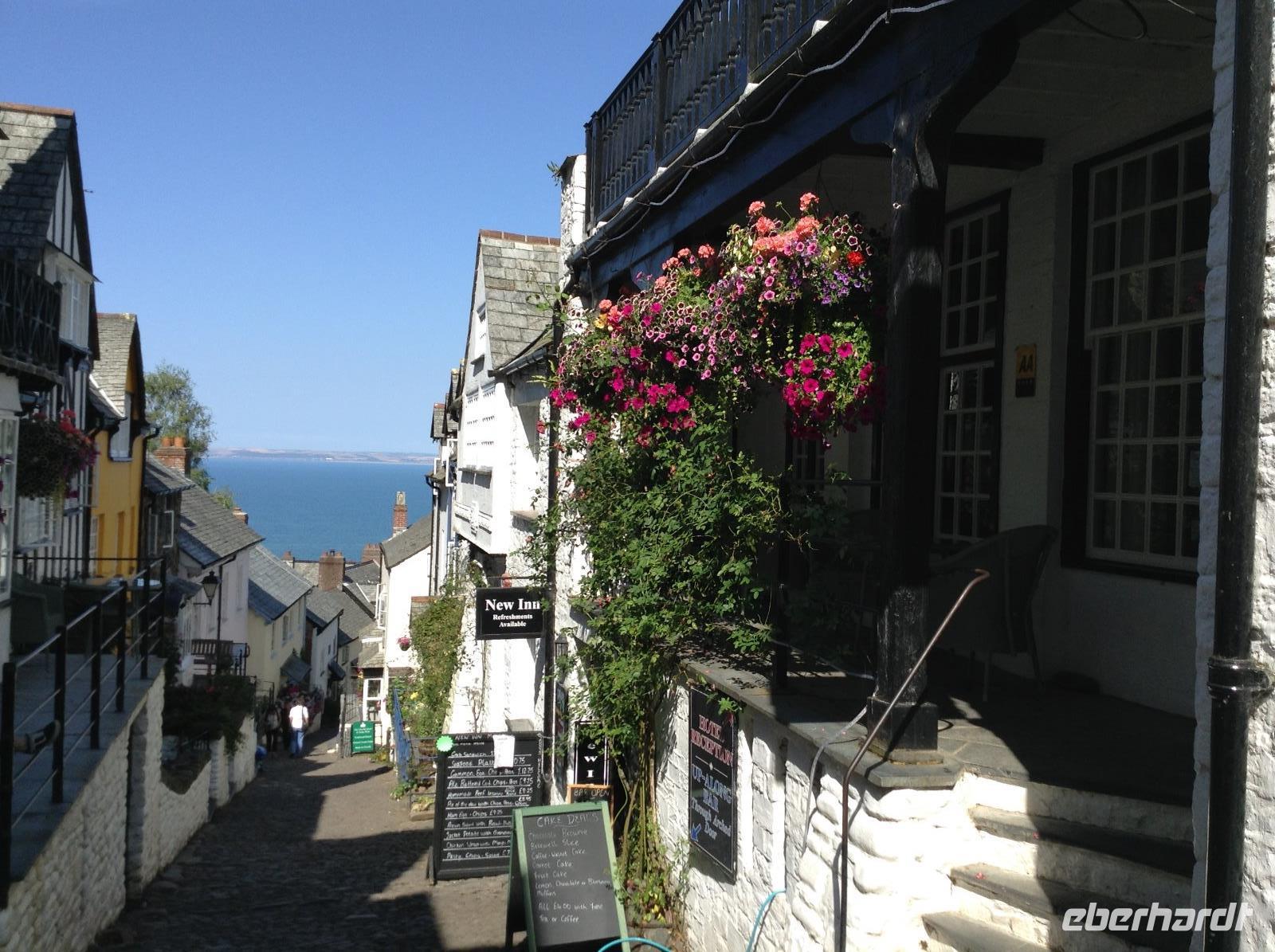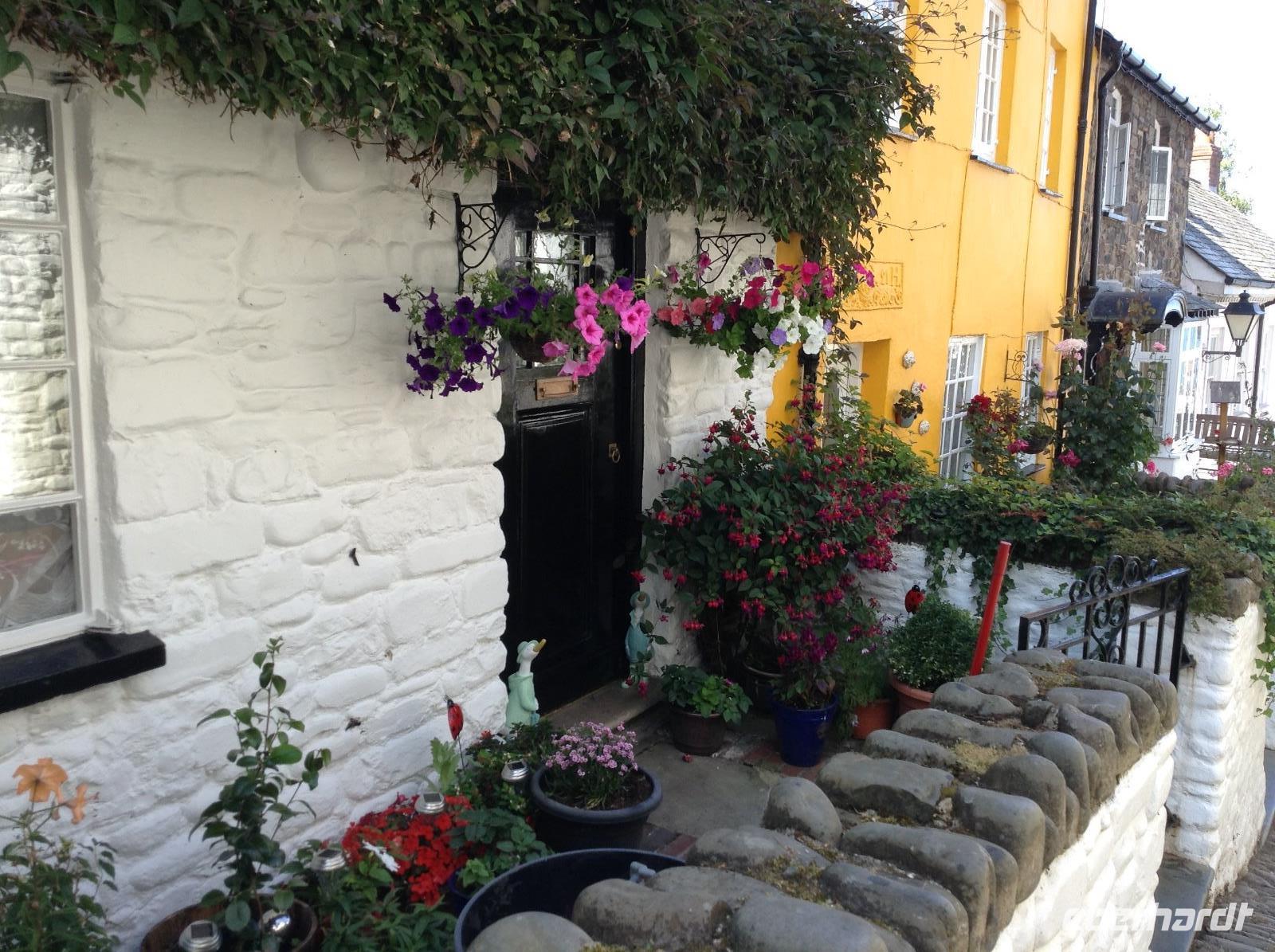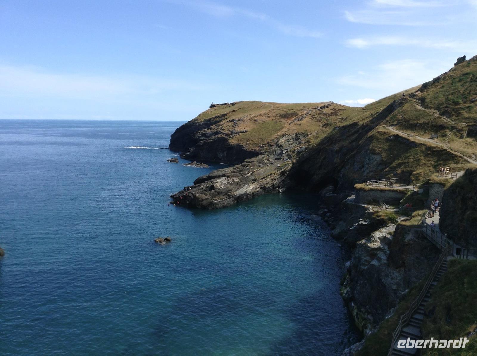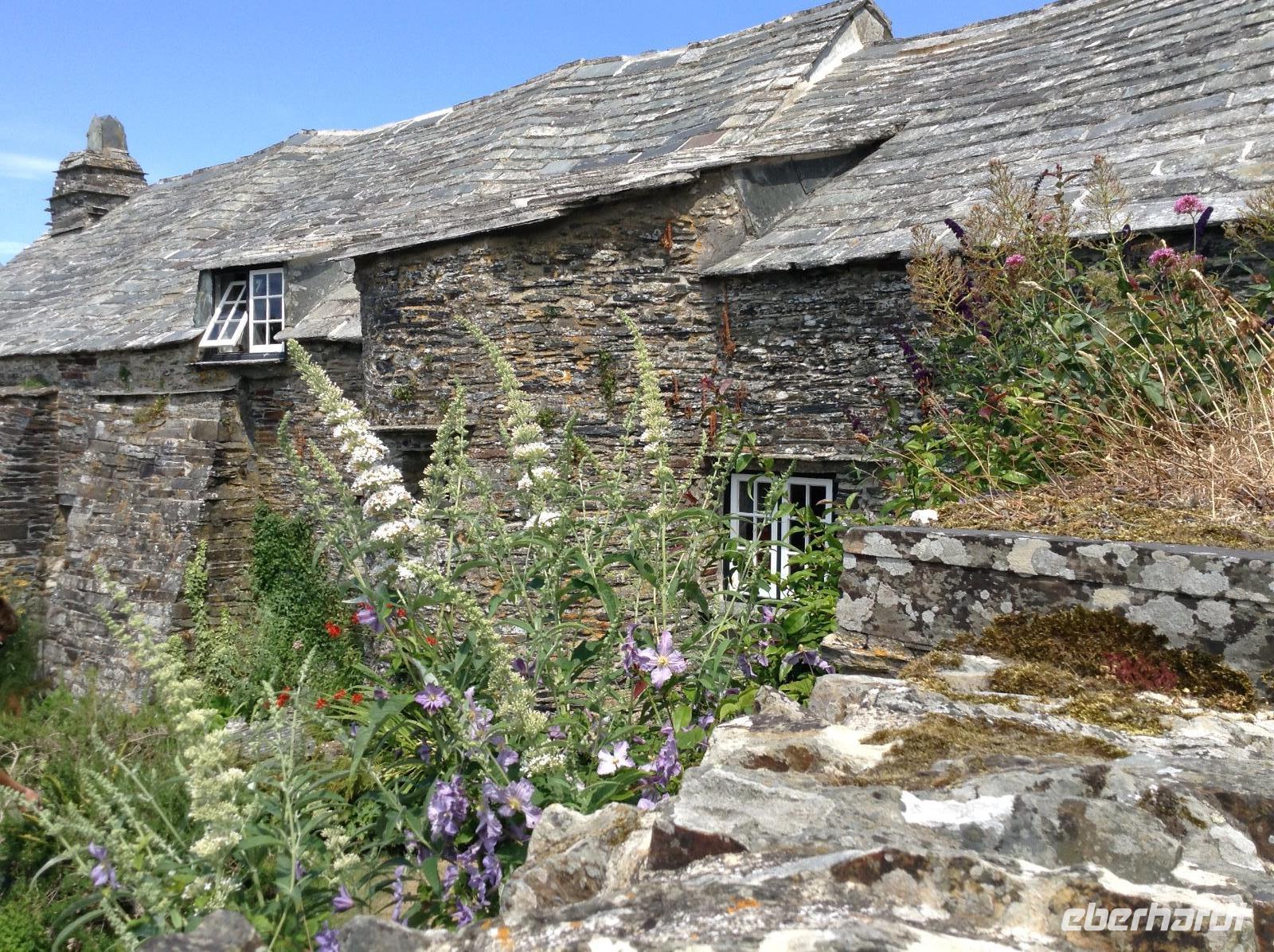 Heute war unser fakultativer Ausflugstag entlang der Westküste. Alle Gäste waren dabei, als es morgens zum sagenumwobenen Ort Tintagel ging. Wir hatten wieder traumhaftes Wetter und Tintagel, die alte Burgruine und die gesamte Küste zeigten sich von der besten Seite. Es gab eine fantastische Weitsicht und eine wunderschöne, ganz klare Küstenlinie zu sehen. Wir genossen die schönen Aussichten sehr. Gegen Mittag fuhren wir wieder schmale, enge Straßen über Boscastle zum kleinen Fischerort Clovelly. Zu Fuß ging es hinab in das steile hübsche Fischerstädtchen. Die Esel begrüßten uns am Weg. Der Weg führte beschwerlich über altes Kopfsteinpflaster bis hinunter zum kleinen Hafen. Dann war Ebbe, im Hafen kaum Wasser zu sehen. Den steilen Rückweg schafften die meisten dann doch lieber mit dem Jeep.