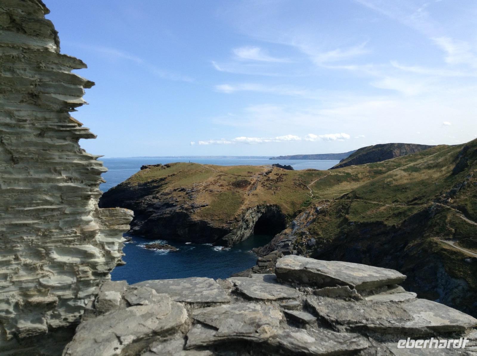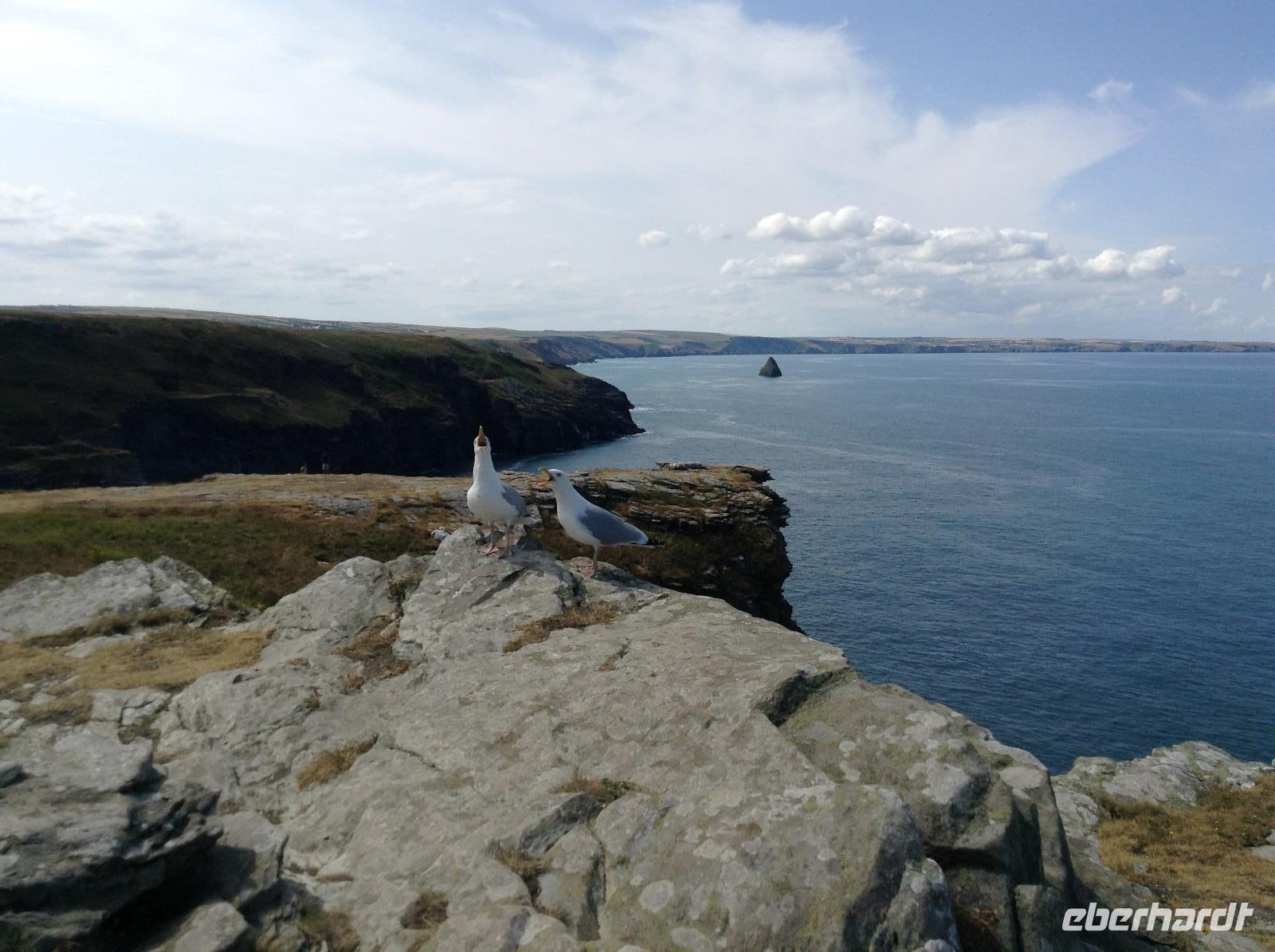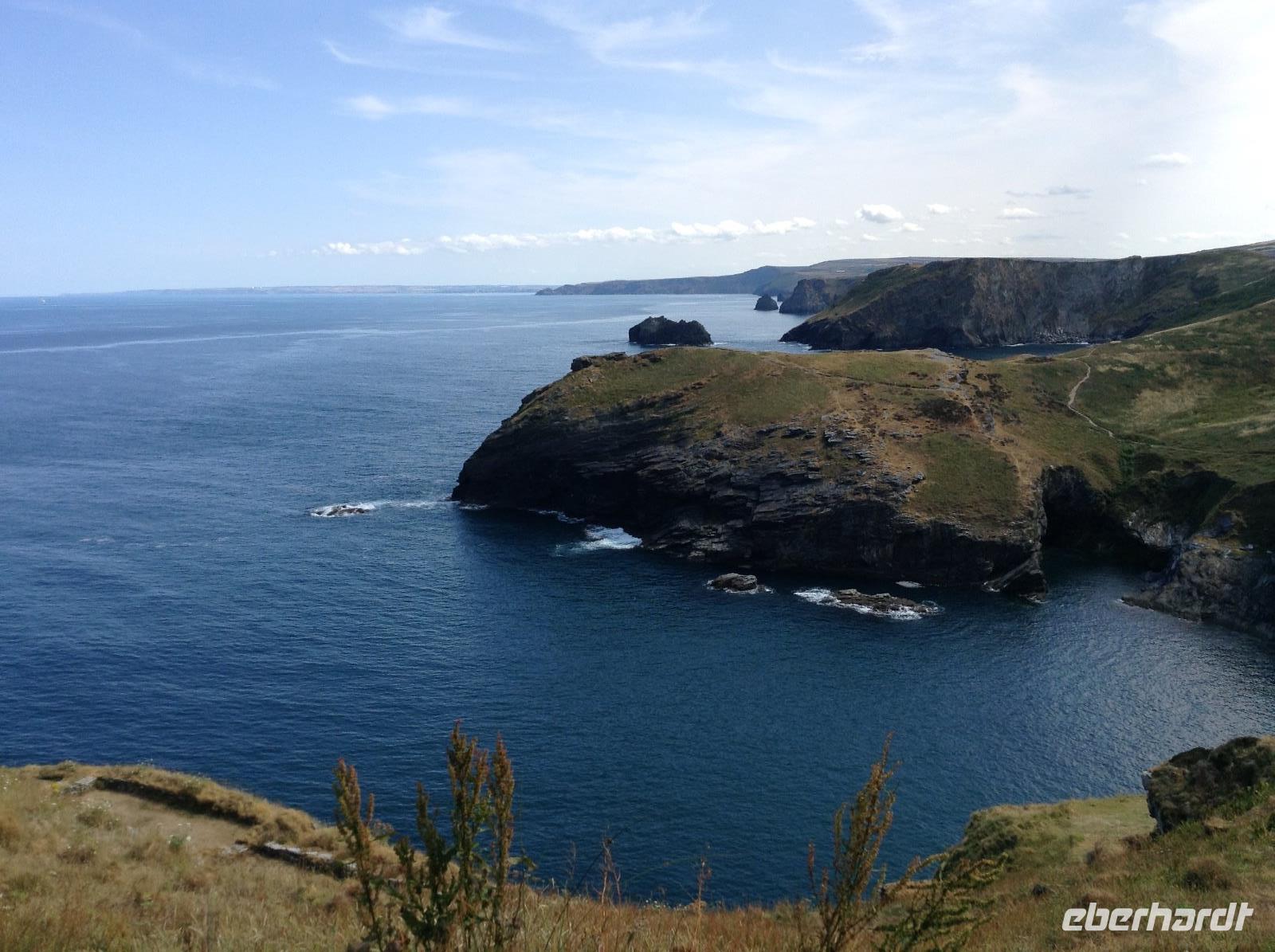 Heute war unser fakultativer Ausflugstag entlang der Westküste. Alle Gäste waren dabei, als es morgens zum sagenumwobenen Ort Tintagel ging. Wir hatten wieder traumhaftes Wetter und Tintagel, die alte Burgruine und die gesamte Küste zeigten sich von der besten Seite. Es gab eine fantastische Weitsicht und eine wunderschöne, ganz klare Küstenlinie zu sehen. Wir genossen die schönen Aussichten sehr. Gegen Mittag fuhren wir wieder schmale, enge Straßen über Boscastle zum kleinen Fischerort Clovelly. Zu Fuß ging es hinab in das steile hübsche Fischerstädtchen. Die Esel begrüßten uns am Weg. Der Weg führte beschwerlich über altes Kopfsteinpflaster bis hinunter zum kleinen Hafen. Dann war Ebbe, im Hafen kaum Wasser zu sehen. Den steilen Rückweg schafften die meisten dann doch lieber mit dem Jeep.