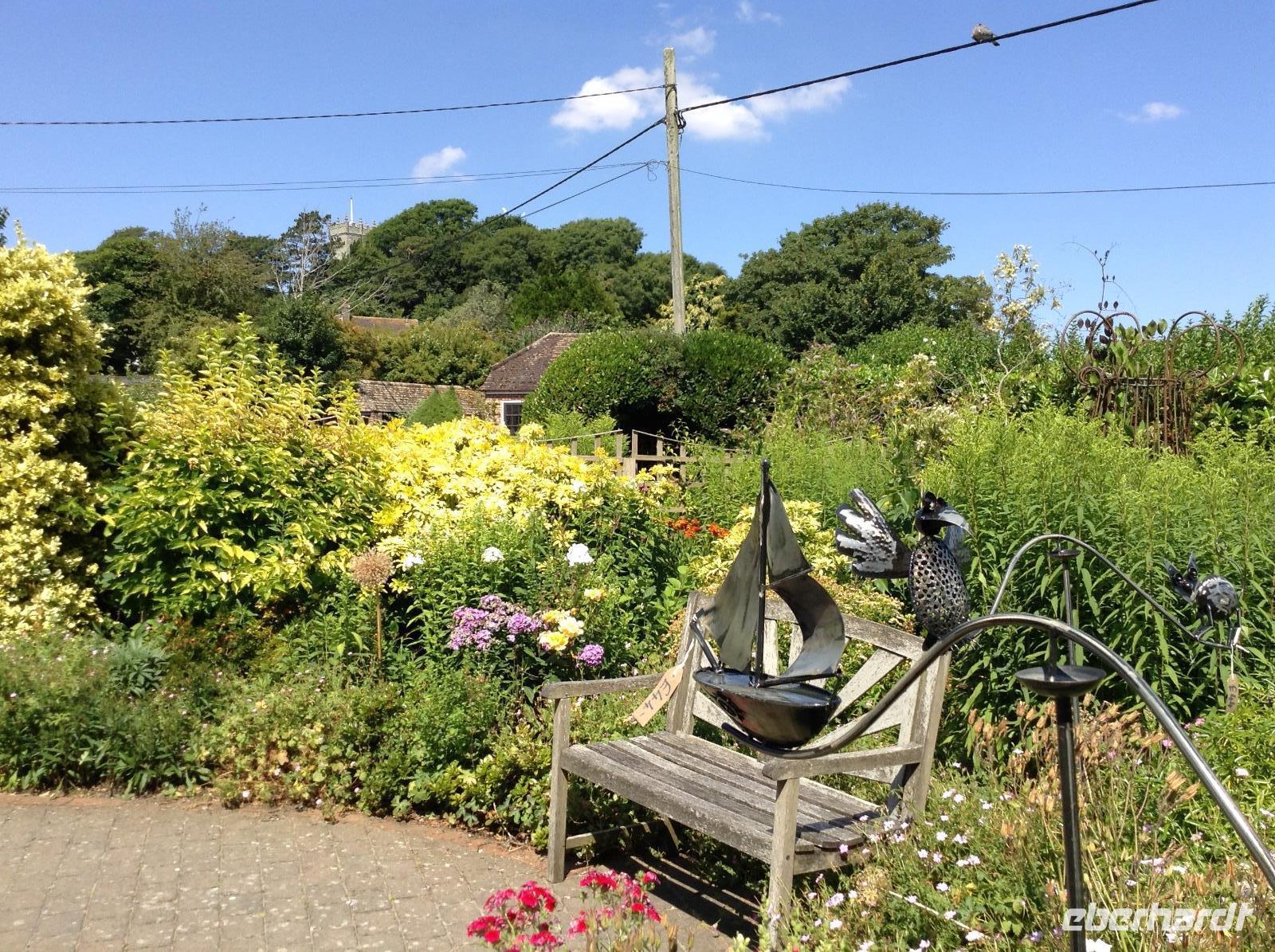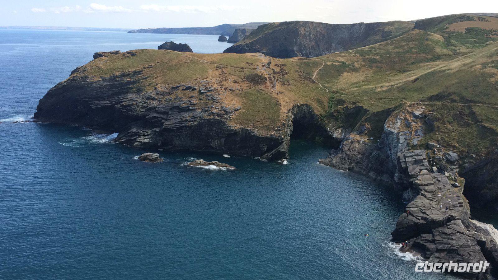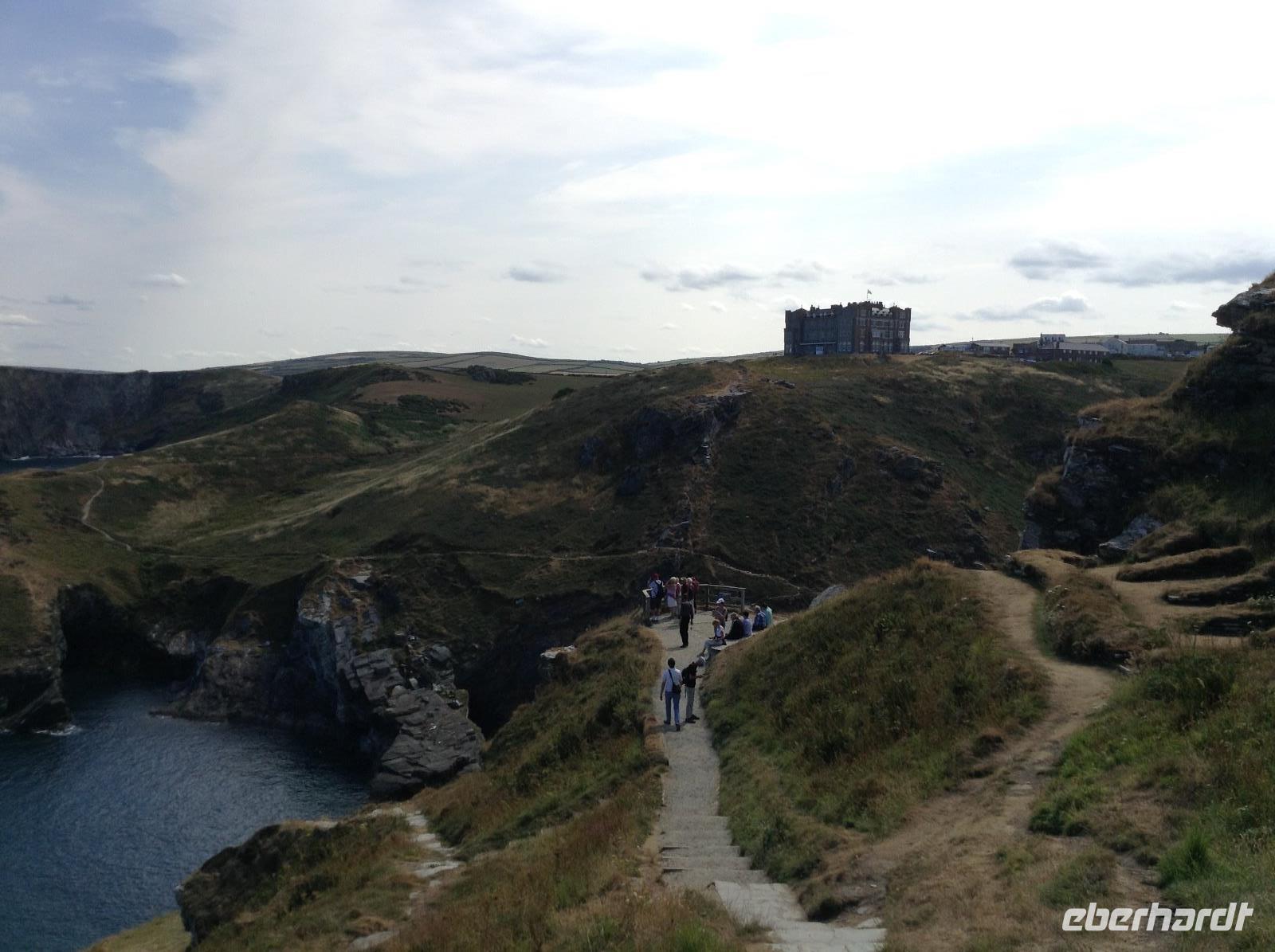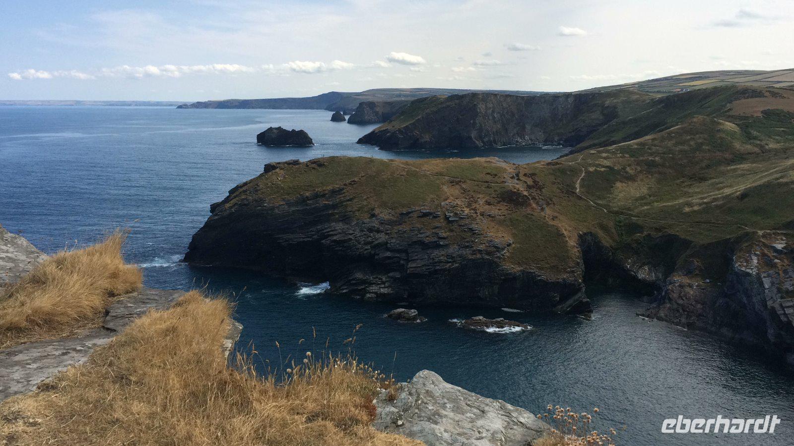 Heute war unser fakultativer Ausflugstag entlang der Westküste. Alle Gäste waren dabei, als es morgens zum sagenumwobenen Ort Tintagel ging. Wir hatten wieder traumhaftes Wetter und Tintagel, die alte Burgruine und die gesamte Küste zeigten sich von der besten Seite. Es gab eine fantastische Weitsicht und eine wunderschöne, ganz klare Küstenlinie zu sehen. Wir genossen die schönen Aussichten sehr. Gegen Mittag fuhren wir wieder schmale, enge Straßen über Boscastle zum kleinen Fischerort Clovelly. Zu Fuß ging es hinab in das steile hübsche Fischerstädtchen. Die Esel begrüßten uns am Weg. Der Weg führte beschwerlich über altes Kopfsteinpflaster bis hinunter zum kleinen Hafen. Dann war Ebbe, im Hafen kaum Wasser zu sehen. Den steilen Rückweg schafften die meisten dann doch lieber mit dem Jeep.