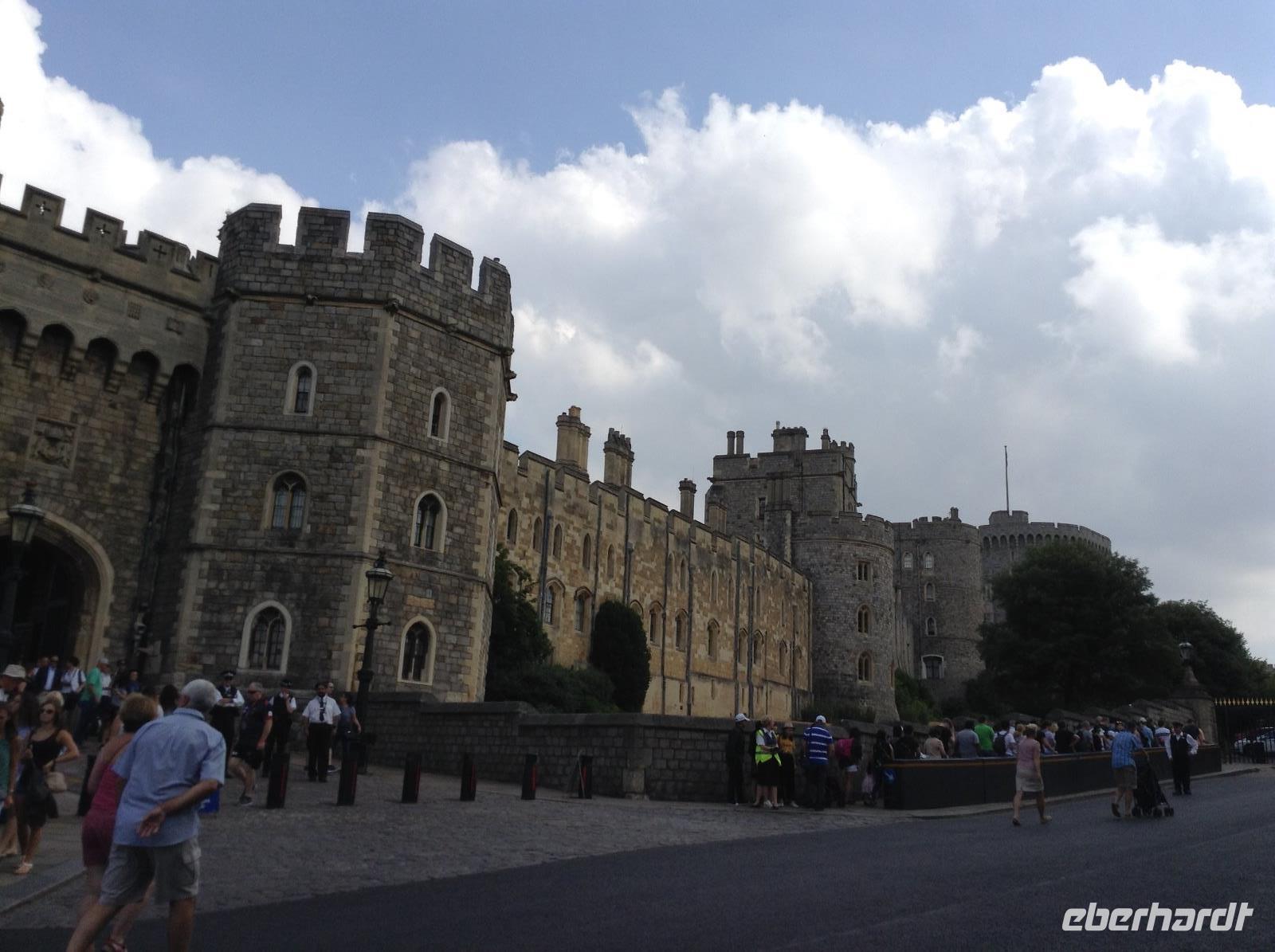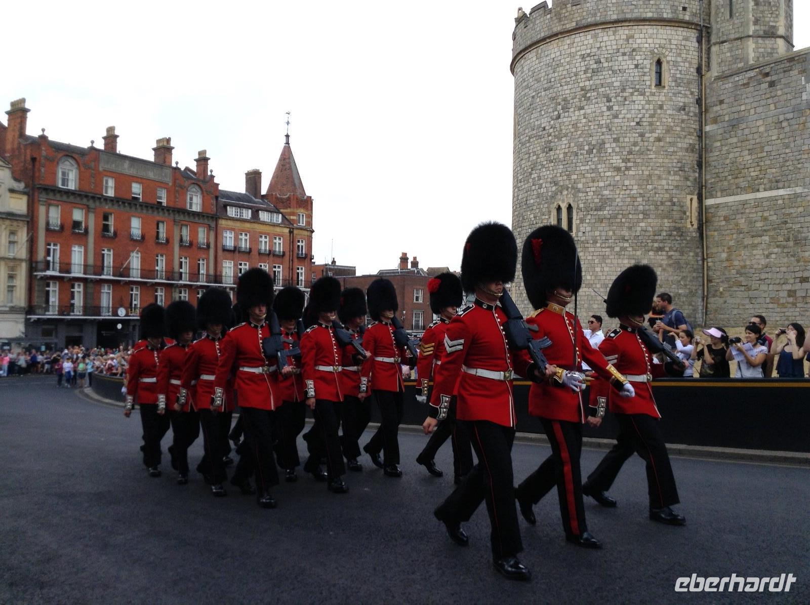 Schon früh zeitig verabschiedeten wir die ersten Fluggäste für den Heimflug. Für die anderen hieß es dann etwas später auch auschecken. Nach einem leckeren Frühstück begann auch für uns die Fahrt in Richtung Osten, entlang der Cotswolds ging es auf London zu. Am Vormittag erreichten wir Windsor vor den Toren von London. Der Busparkplatz war wieder sehr voll, gemeinsam bummelten wir von da aus durch den alten Bahnhof hinüber zum Castle. Um 11 Uhr war Wachablösung und wir hatten Glück, uns dieses Specktakel mit ansehen zu können.