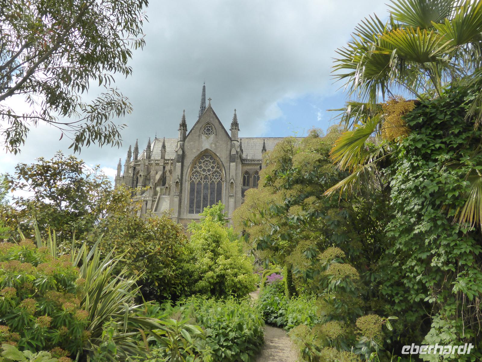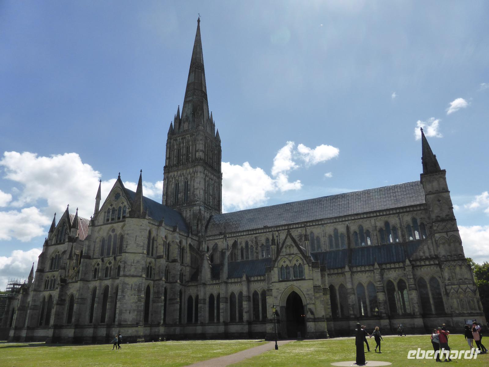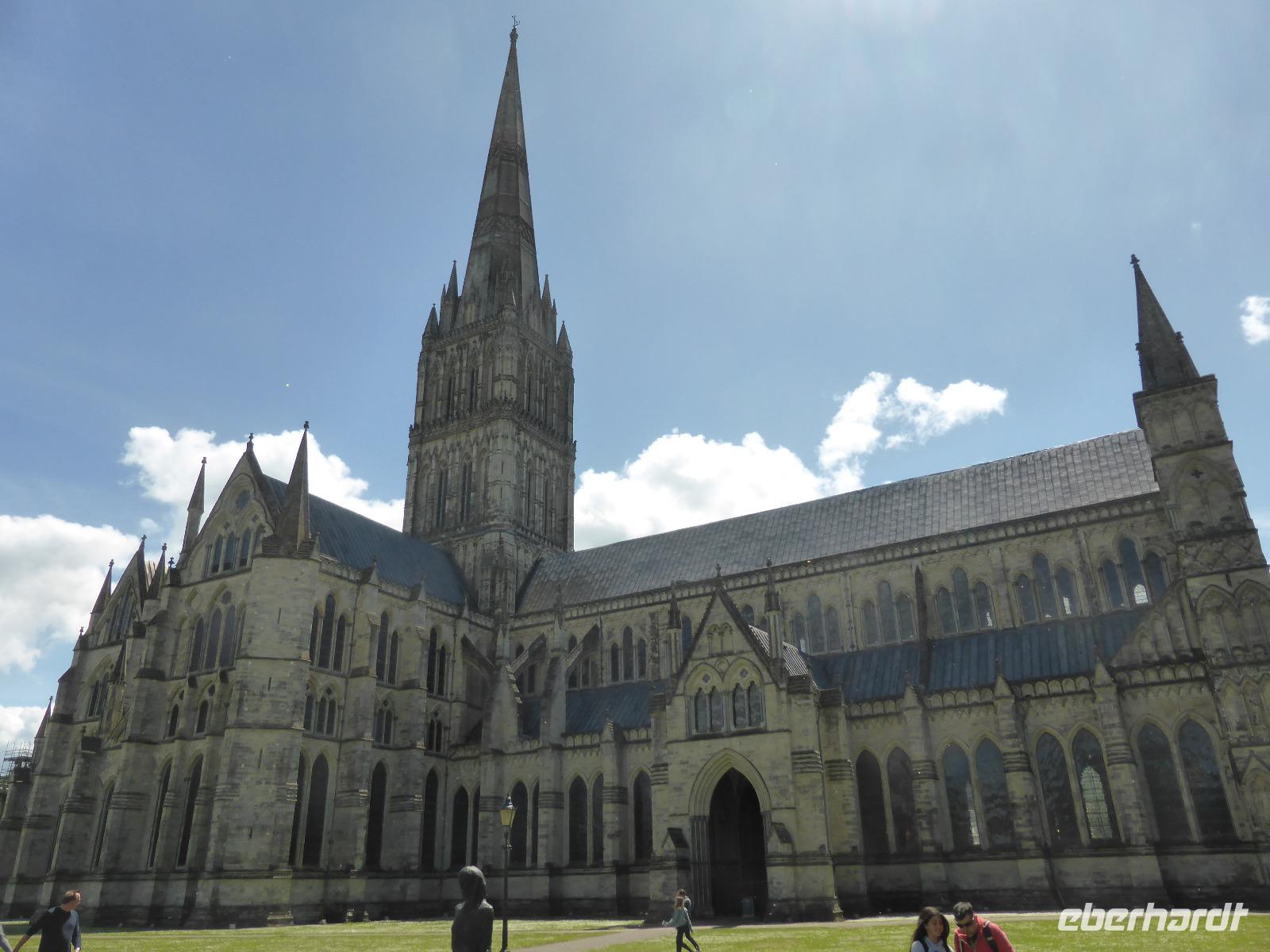 Nach diesem beeindruckendes Erlebnis führte uns der Weg nach Salisbury. Salisbury gehört mit der prachtvollen Kathedrale sowie der romantisch verträumten Altstadt zu den schönsten Städten Englands. Im 13. Jh. entstand in sehr kurzer Bauzeit ein gotisches Wunderwerk, das fast ausschließlich im reinsten Early-English-Stil (engl. Frühgotik) errichtet worden ist. Von Ferne grüßte uns bereits der 123 m hohe schlanke Turm, der höchste Kirchturm Englands. Dieser Turm brachte den Baumeistern viel Kopfzerbrechen, da er aus statischen Gründen nicht hätte gebaut werden dürfen. Unser Weg führte uns durch die größte Domfreiheit aller englischen Kathedralen zur Westfassade mit ihrem reichen Skulpturenschmuck.