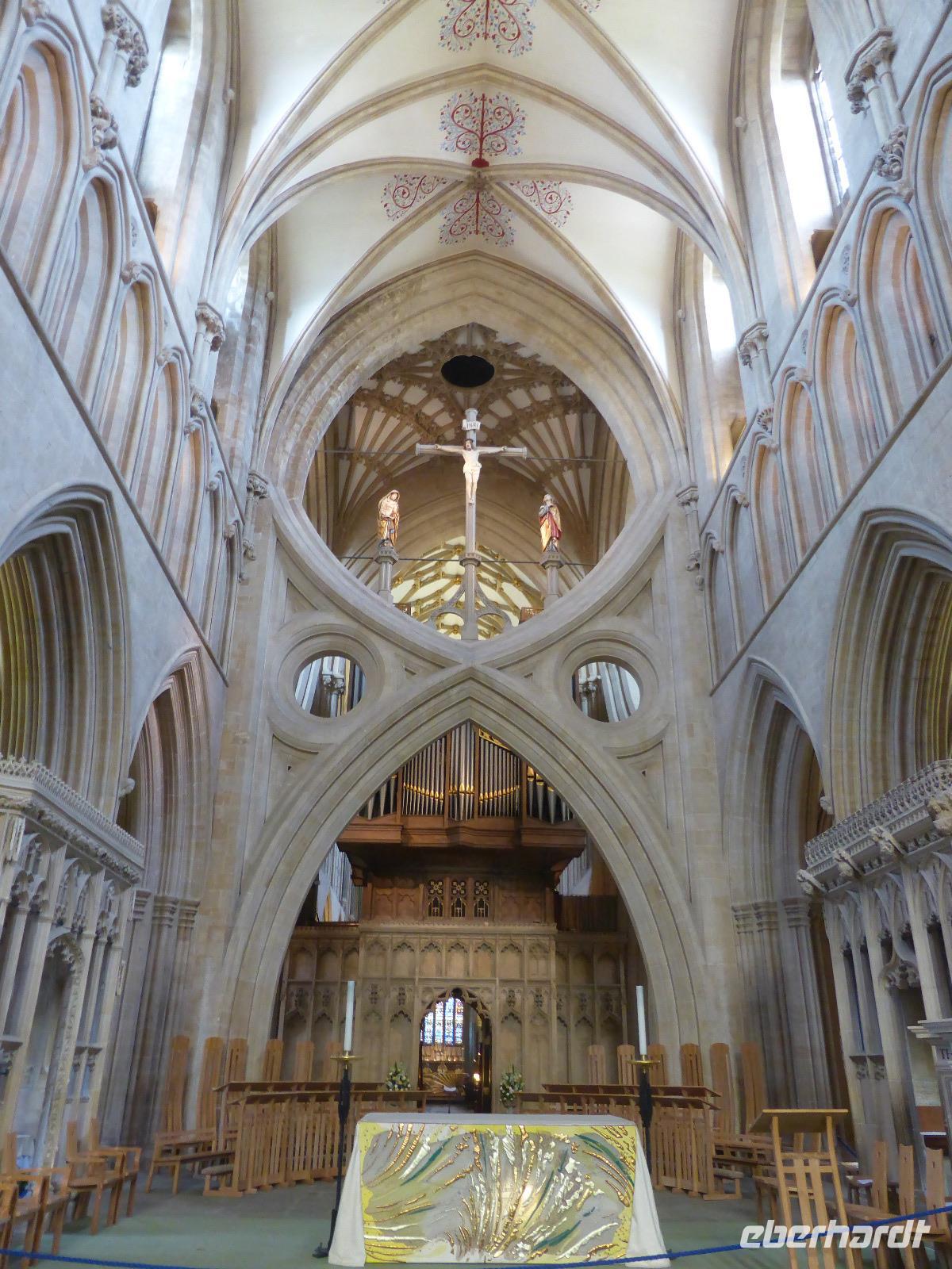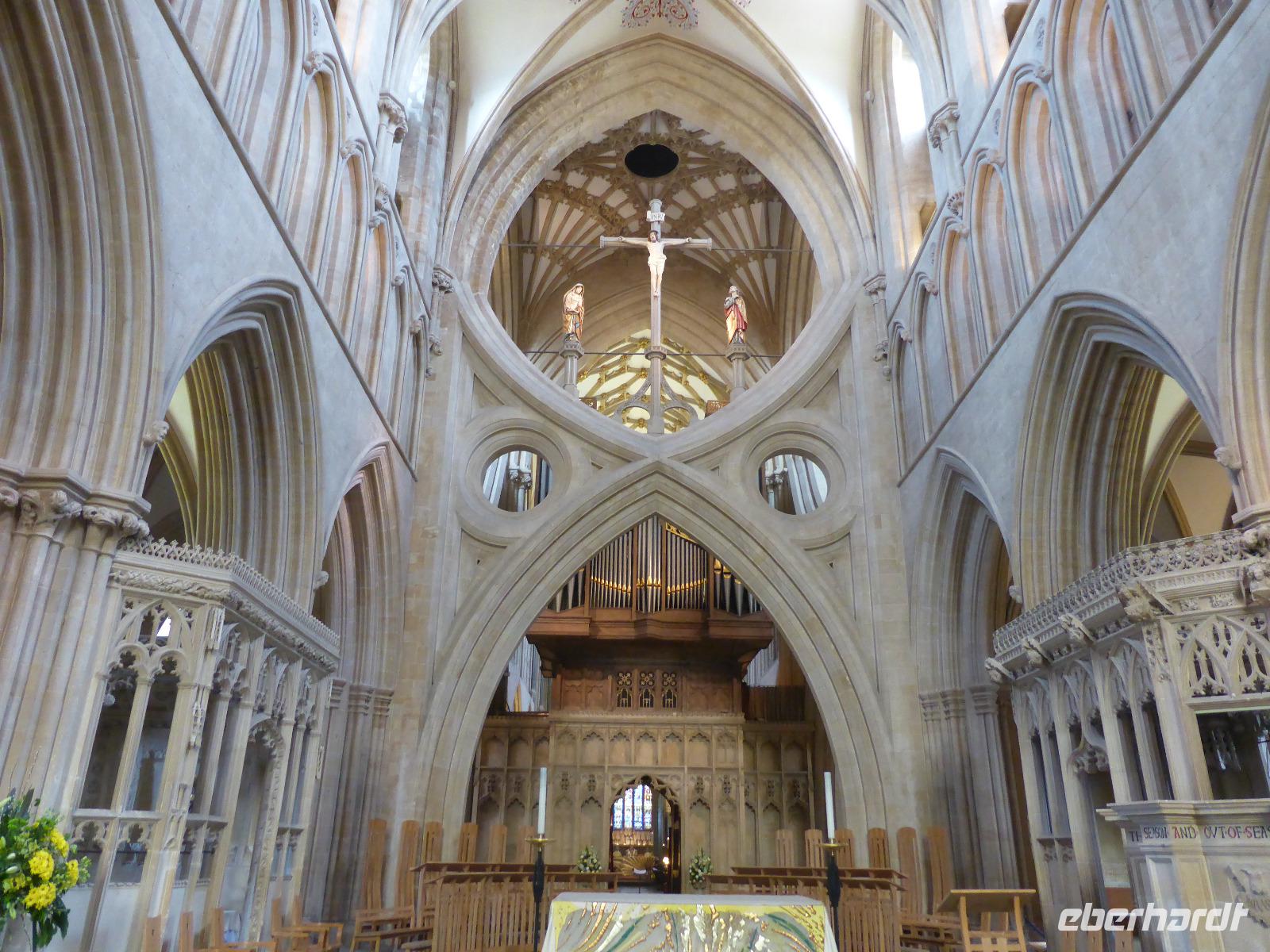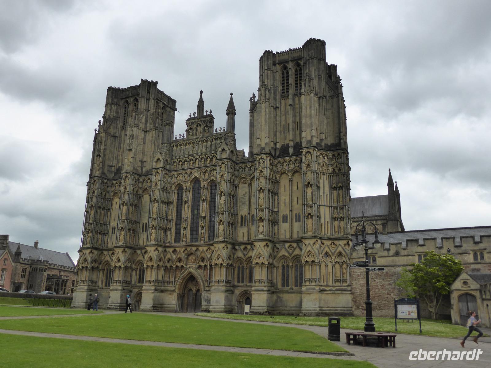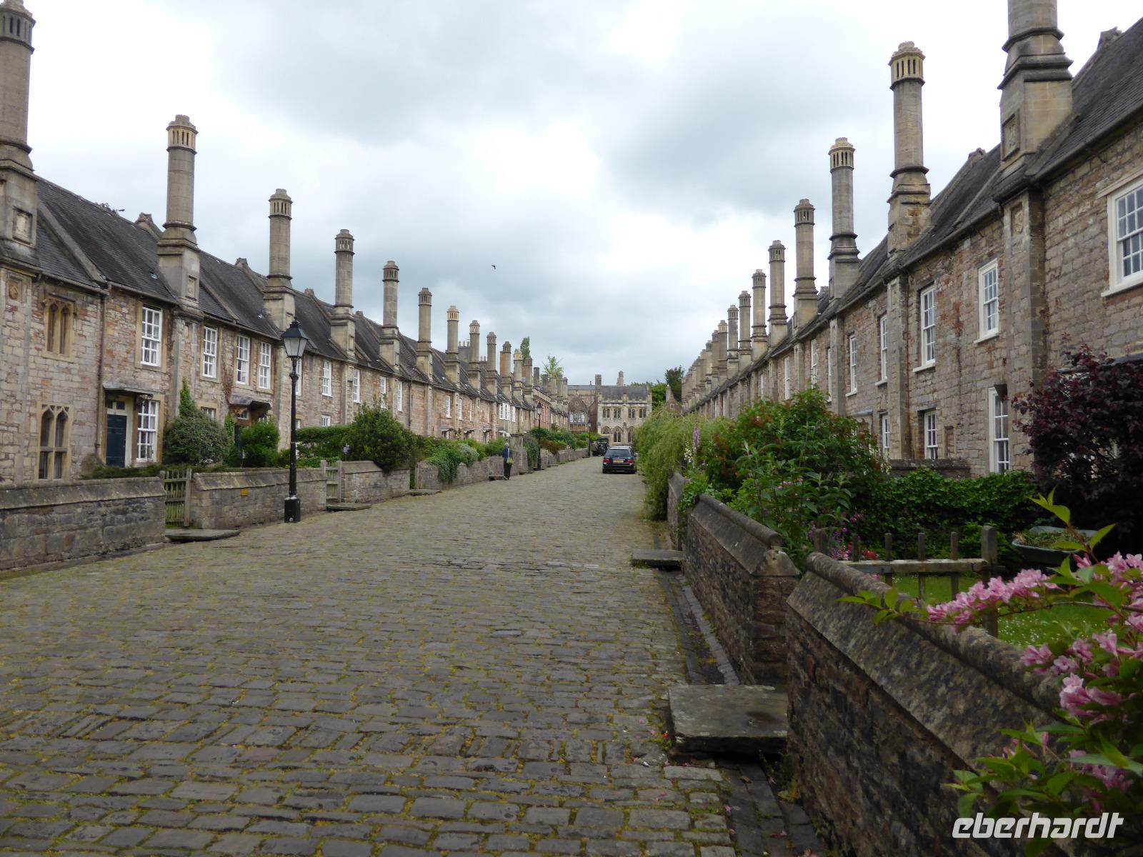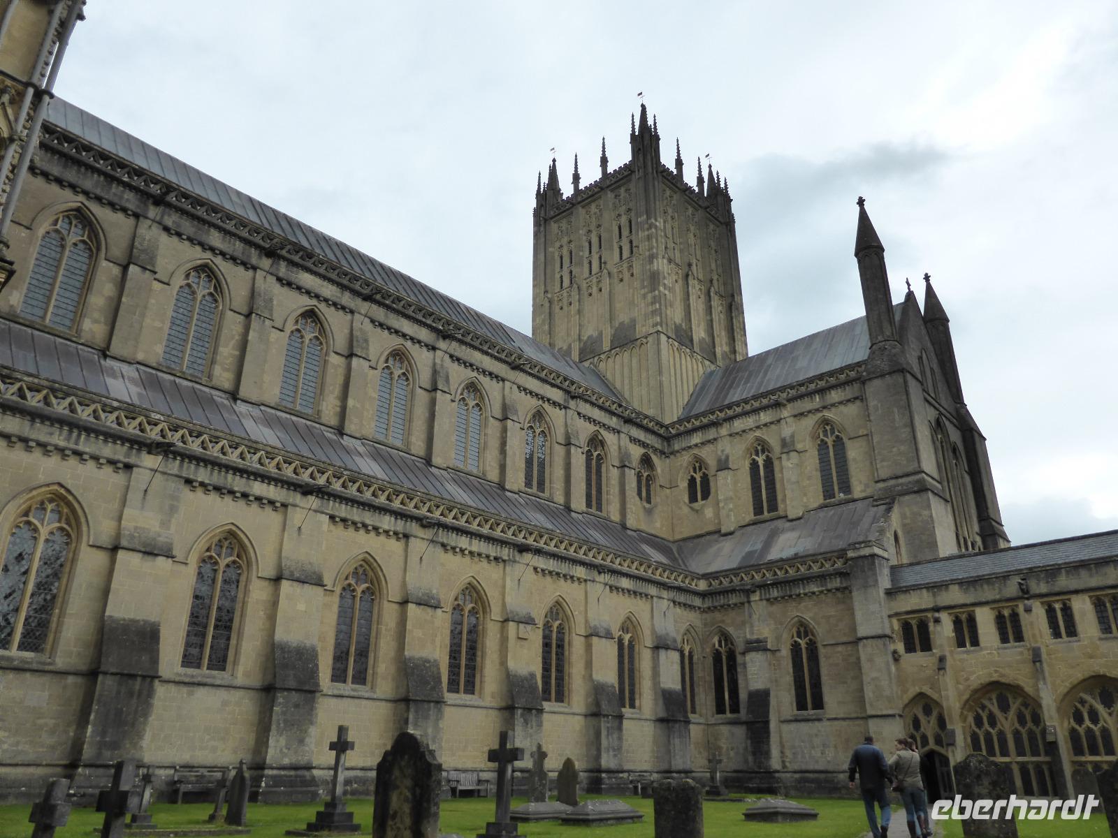Der zweite Stopp am heutigen Tag war die Kathedralstadt Wells. In Wells unternahmen wir einen Spaziergang durch die Domfreiheit zum Vicar´s Close, der ersten Reihenhausanlage der Welt. Diese Straße mit 42 Häusern wurde 1348 vom Bischof geplant. Entlang des Burggrabens erreichten wir den Haupteingang des Bischofspalastes. In den Gärten des Bischofspalastes entspringen die Quellen, die Wells ihren Namen gegeben hatten. Die Kirche hatten wir fast völlig allein und konnten den Evening Song noch miterleben. Mit den anmutigen Stimmen und der Orgel war dies ein besonderes Erlebnis. Im Inneren der Kathedrale beeindruckten vor allem der Chor, die astronomische Uhr, die berühmte Treppe von Wells sowie Scherenbögen in der Vierung.