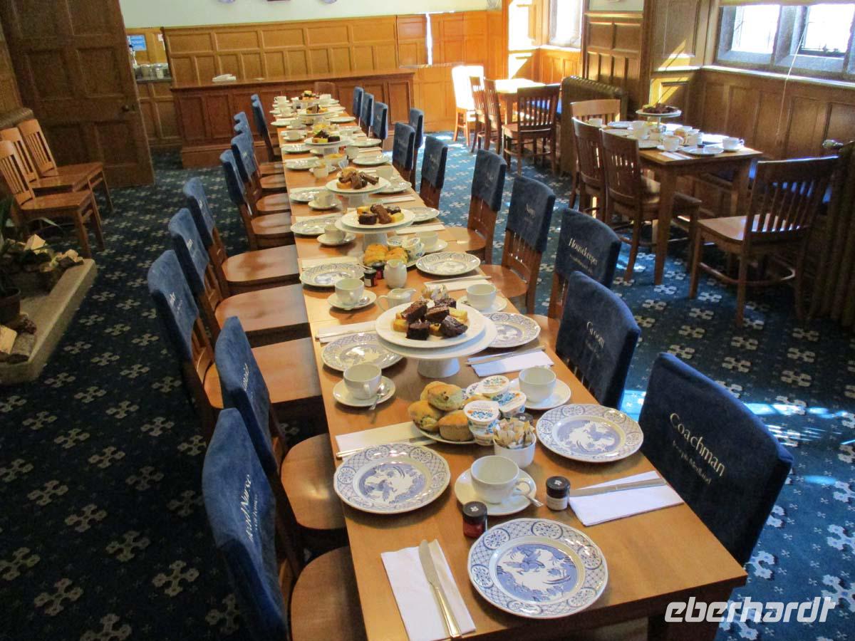 Heite reisen wir nach Tintagel auf dessen Burg der der Sage nach Artus das Licht der Welt erblickt haben soll. Ausgrabungen haben tatsächlich Funde aus dem 5. und 6. Jahrhundert zu Tage gefördert. Heute ist aber vor allem die Ruine einer hochmittelalterlichen Burg aus dem 12. Jh. zu sehen, deren Mauern schon sehr beeindruckend sind. Sie besteht aus einer Vorburg und der Hauptburg, welche sich auf einem Felsen im Meer erhebt. Seit August diesen Jahres verbindet eine neue Hängebrücke die Vorburg mit der vorgelagerten Insel, was den Zutritt enorm erleichtert. Der Ort Tintagel selbst ist voll auf Tourismus eingestellt. Viele nette Läden laden zum Stöbern ein. Auch das Besucherzentrum ist gut sortiert. Zudem gibt es ein weiteres Schmankerl, nämlich ein Gebäude aus dem frühen 14. Jh., in welchem sich das alte viktorianische Postamt befindet. Das gesamte Haus kann man besichtigen und die Enge der Räume auf sich wirken lassen. Wir füllen lassen es uns zunächst bei einem lokalen Nach unserem Mittagessen reisen wir nach Clovelly. Es ist ein denkmalgeschütztes Fischerdorf, welches man nur zu Fuß erkunden kann. Steil schmiegt es sich an die Küste und besteht im Grunde nur aus 2 Gassen. Seit über 250 Jahren befindet es sich im Besitz der Familie Rous, welche die Eintrittsgelder zum Erhalt des Dorfes verwendet. Wer möchte, kann sich auch auf dem Rücken eines Esels durch das Dorf führen lassen. Man kann sich jedoch den mühevollen Aufstieg hinauf zum Busparkplatz ersparen. Neben dem Dorf gibt es eine Versorgungsstraße für das einzige Hotel unten am Hafen aus dem 14. Jh,. Hier wird ein Shuttleservice angeboten. Mit Landrovern werden die Gäste für 2 Pfund 50 bequem den Berg hinauf gebracht. Mit dem Gefühl, heute zwei einzigartige und weltberühmte Dinge besichtigt zu haben, nehmen wir im Hotel unser Abendessen ein.