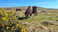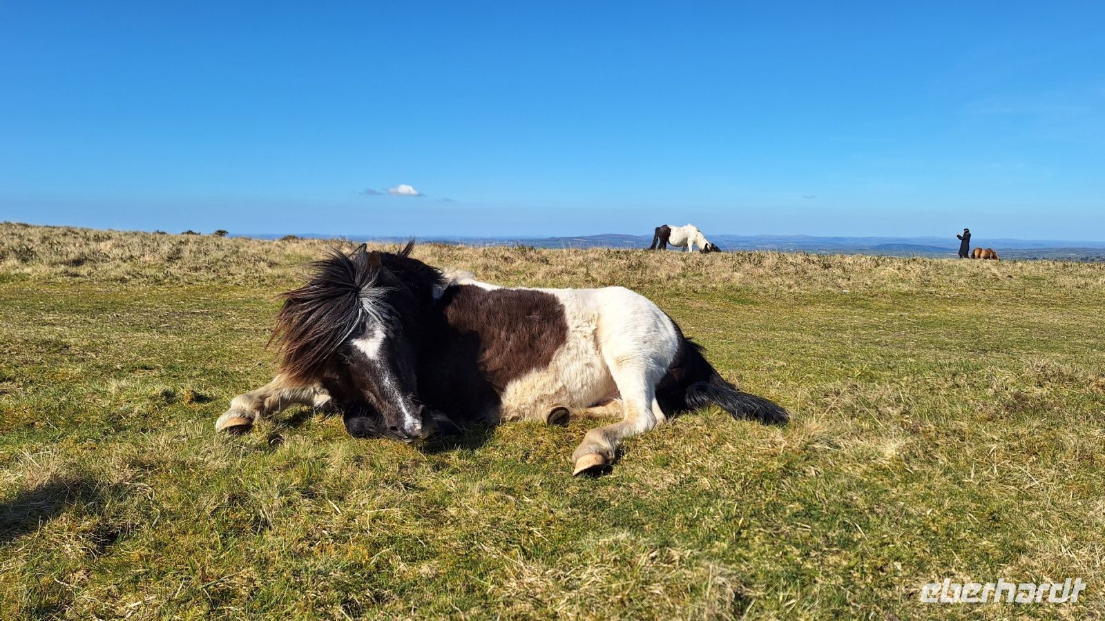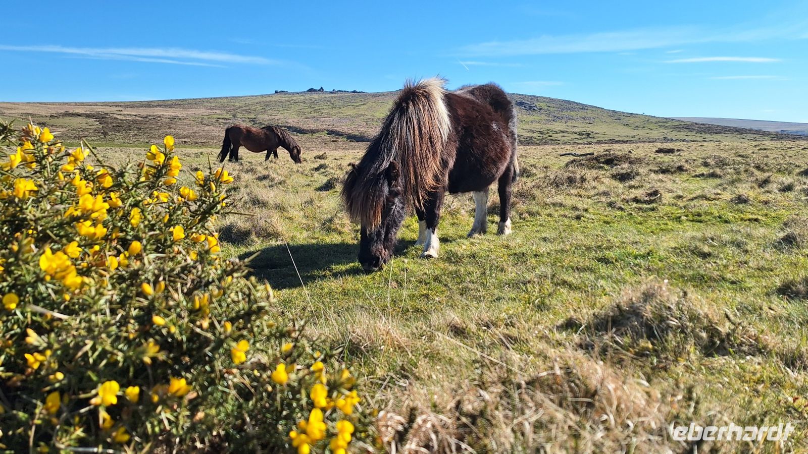 Auch der Sonntagmorgen begrüßt uns wieder mit herrlichem Wetter, also entscheiden wir uns dazu, noch ein wenig mehr von der herrlichen Natur im Dartmoor zu genießen. Wir fahren zunächst auf der geplanten Route in Richtung Tavistock, wo einst der große Seefahrer Francis Drake das Licht der Welt erblickte, dann biegen wir noch ein mal ab nach Osten, und erreichen schon nach wenigen Minuten die grünen Hügel des Dartmoor Nationalparks. Hier legen wir einen Stopp ein und haben so die Möglichkeit, die tolle Aussicht in Richtung Küste zu genießen und auch, die niedlichen Dartmoor Ponys noch einmal aus der Nähe zu betrachten. Die Tiere scheinen sich gar nicht von unserer Anwesenheit stören zu lassen und einige fordern auch sehr direkt ihre Streicheleinheiten ein. Neben den streng in ihrer Blutlinie kontrollieren Dartmoor Ponys, treffen wir zu unserer Überraschung jedoch auch auf ein Shetland Pony – wie das wohl hier gelandet ist?