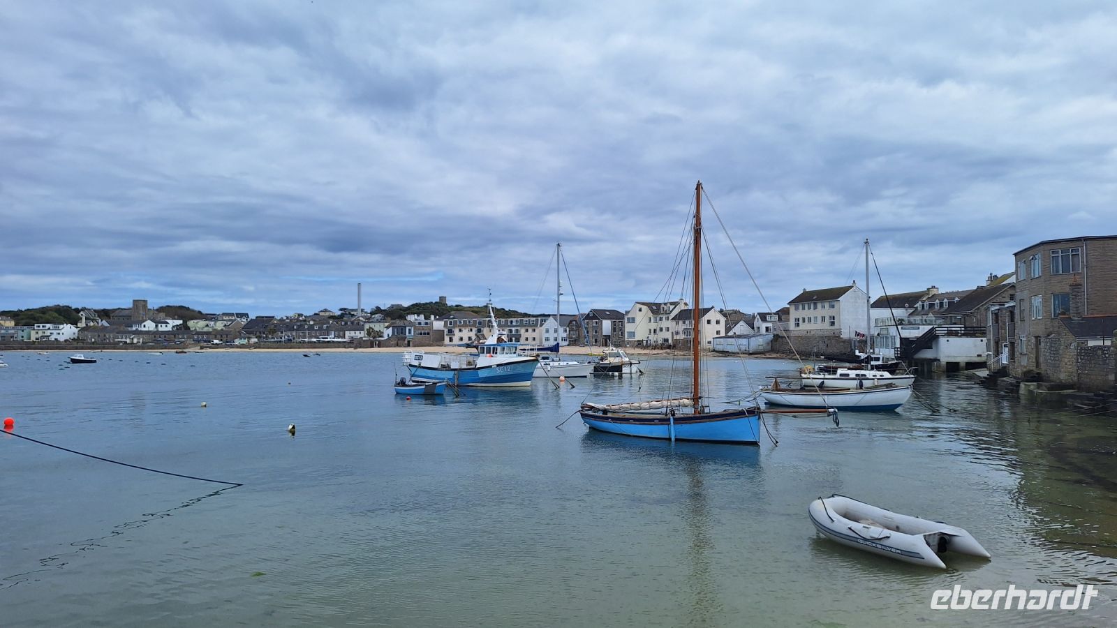 Zu unserer Überraschung legt das kleine Fährschiff überpünktlich ab, und auch nachdem wir die geschützten Gewässer zwischen den Inseln verlassen haben, bleib die keltische See spiegelglatt. Heute macht der „Vomit-Express“ seinem Namen offensichtlich keine Ehre – uns stört es nicht. Nach etwa eineinhalb Stunden ist die Penzance-Halbinsel schon am Horizot zu erkennen und eine Stunde später bekommen wir noch einmal eine schöne Sicht auf den St Michael's Mount und den Hafen von Penzance.