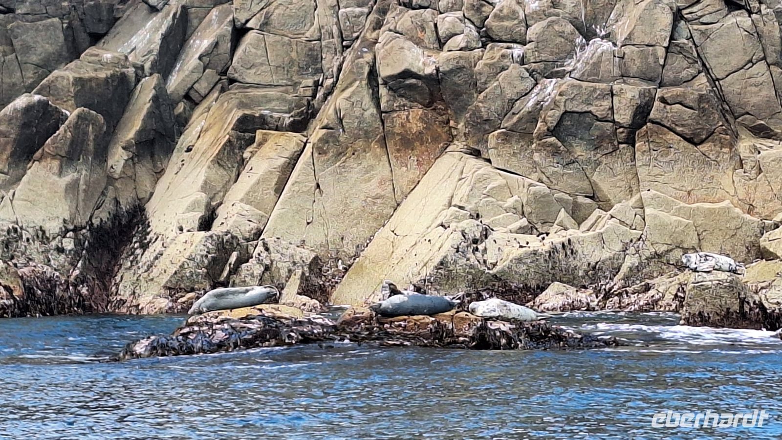 Heute auf dem Programm steht zunächst eine Schifffahrt zur Tierbeobachtung, danach geht es dann auf die Garteninsel Tresco weiter. Aufgrund des hohen Passagieraufkommens transferiert unsere Bootscrew (zufällig dieselbe wie gestern) zunächst noch eine Gruppe englischer Touristen auf die Insel St Agnes. Gut für uns, denn so sehen wir mehr, als eigentlich auf dem Programm gewesen wäre. Dann fahren wir weiter in Richtung Annet, eine Insel, die komplett unter Naturschutz steht und zu dieser Jahreszeit das Hauptbrutgebiet für Papageientaucher ist. Gespannt schauen wir aufs Wasser und hoffen, die niedlichen Vögel zu entdecken. Lange dauert es tatsächlich nicht, und wir können die ersten Tiere beobachten, wie sie vor dem Boot auf dem Wasser ausruhen, um dann weiterzufliegen. Wir folgen den Tieren durch die nicht unbeachtlichen hohen Wellen und treffen bald noch mehr Papageientaucher, sowie auch andere Alkenvögel wie Trottellummen und Tordalken. Einige Kegelrobben können wir ebenfalls auf den zerklüfteten Felsen erkennen.