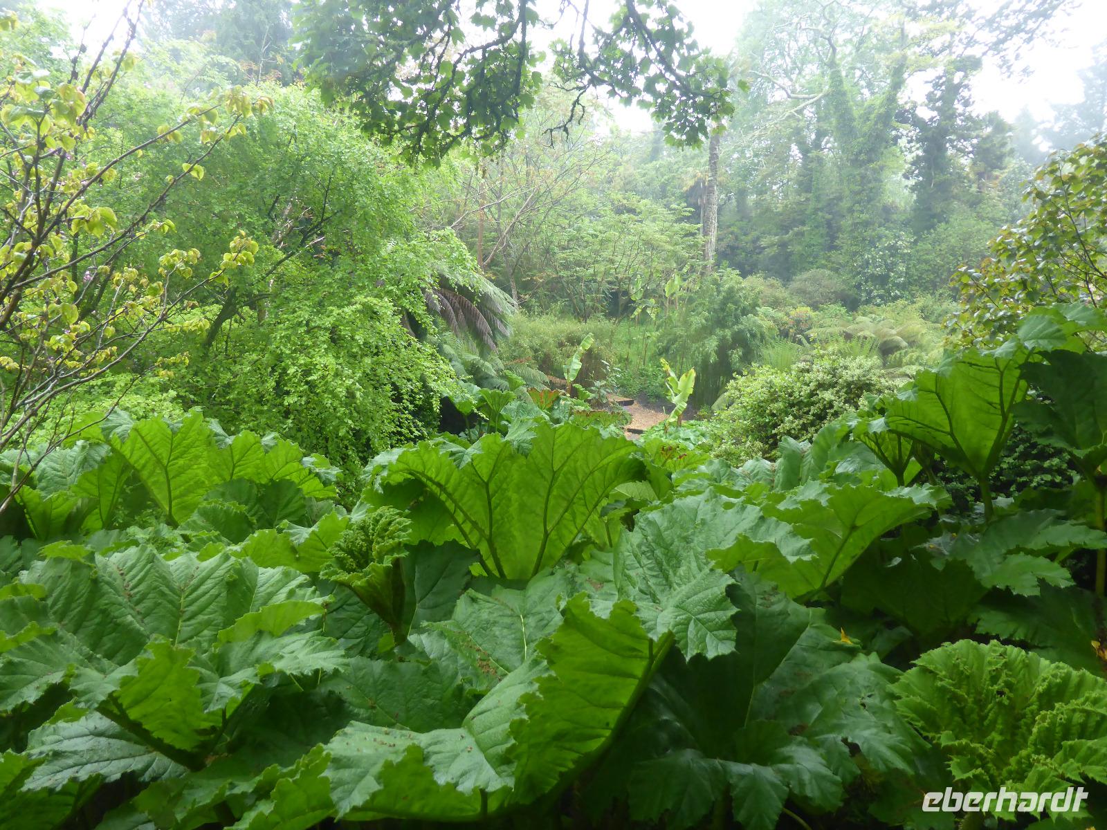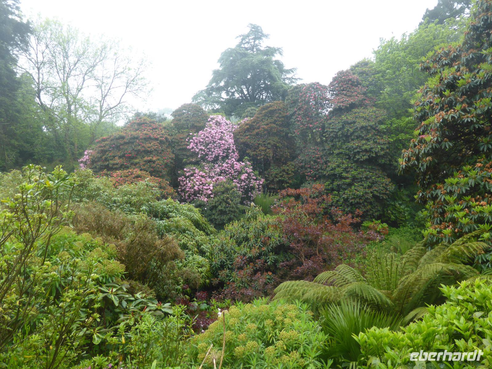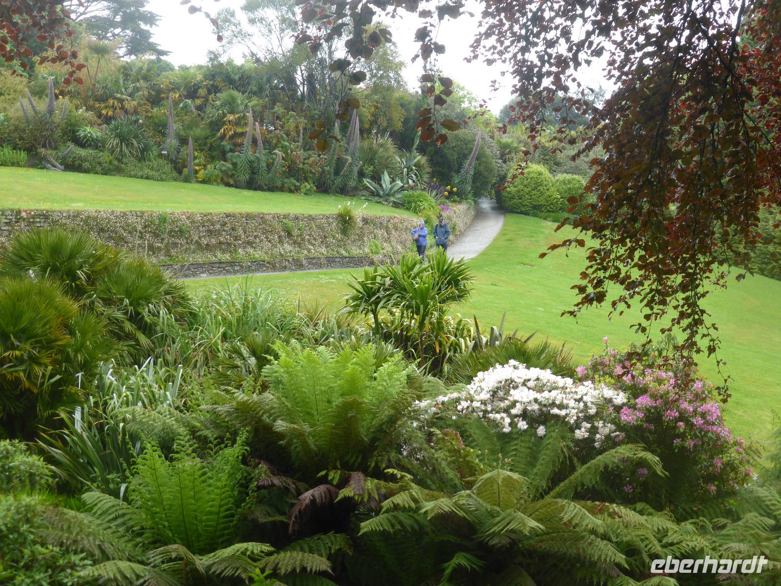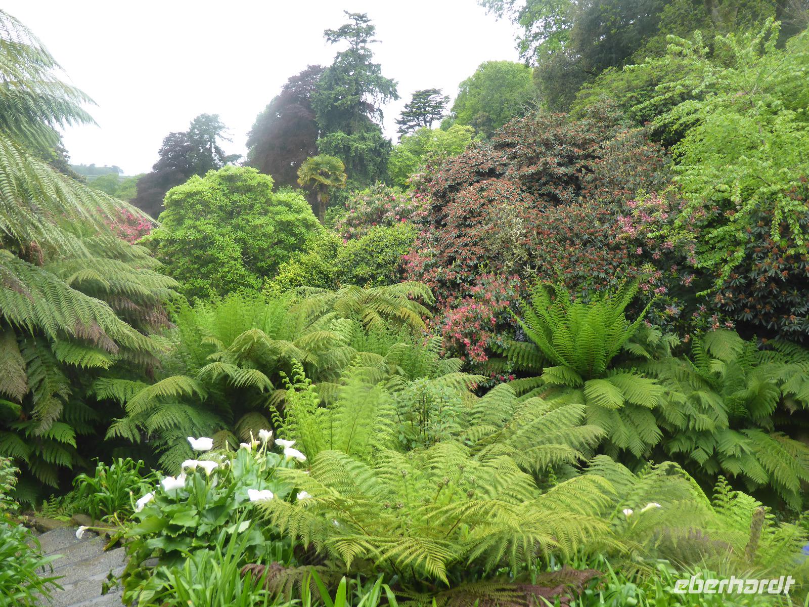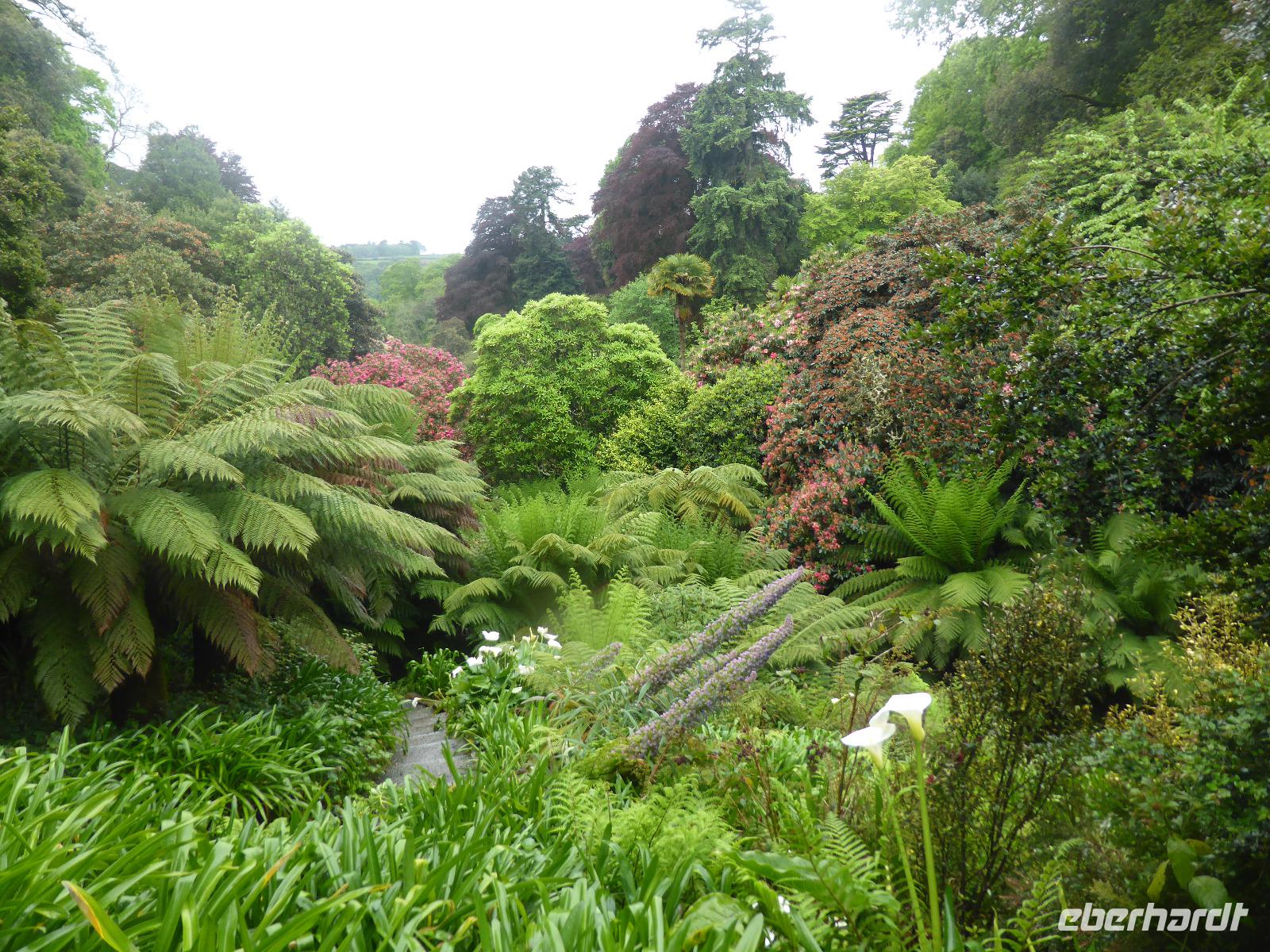 Am Nachmittag besuchten wir die Lost Gardens of Heligan bei St. Austell. Im 19. Jahrhundert gehörte dieser Garten der Familie Treymayne. Diese konnte sich den Luxus von mehr als 20 Gärtnern leisten. Nach dem Ersten Weltkrieg verstarb der letzte männliche Erbe und ein Großteil dieser Parkanlage verwilderte. 1990 nahm sich Tim Smit, ein Holländer aus Kent diesem „verlorenen Garten" an, nachdem er auf ein völlig überwuchertes Cottage aufmerksam wurde. Anhand alter Aufzeichnungen und Gartenhistorikern verhalf er Heiligan zu einer grandiosen Widergeburt. Bemerkenswert ist der neun Hektar große subtropische „Dschungel" mit den Palmen, Bambumwäldern und Gunneras (Mammutblättern). Zur Gestaltung des Gartens tragen auch Baum- und Landschaftsskulpturen bei, wie die schlafende Schönheit Mud Maid oder der Kopf des Riesen. Ein Spaziergang durch die Blumen- und Gemüsegärten mit mehr als 12 Kartoffelsorten und ca. 50 Apfelbaumsorten versäumten wir nicht. Eine Augenweide waren die riesigen Rhododendren.