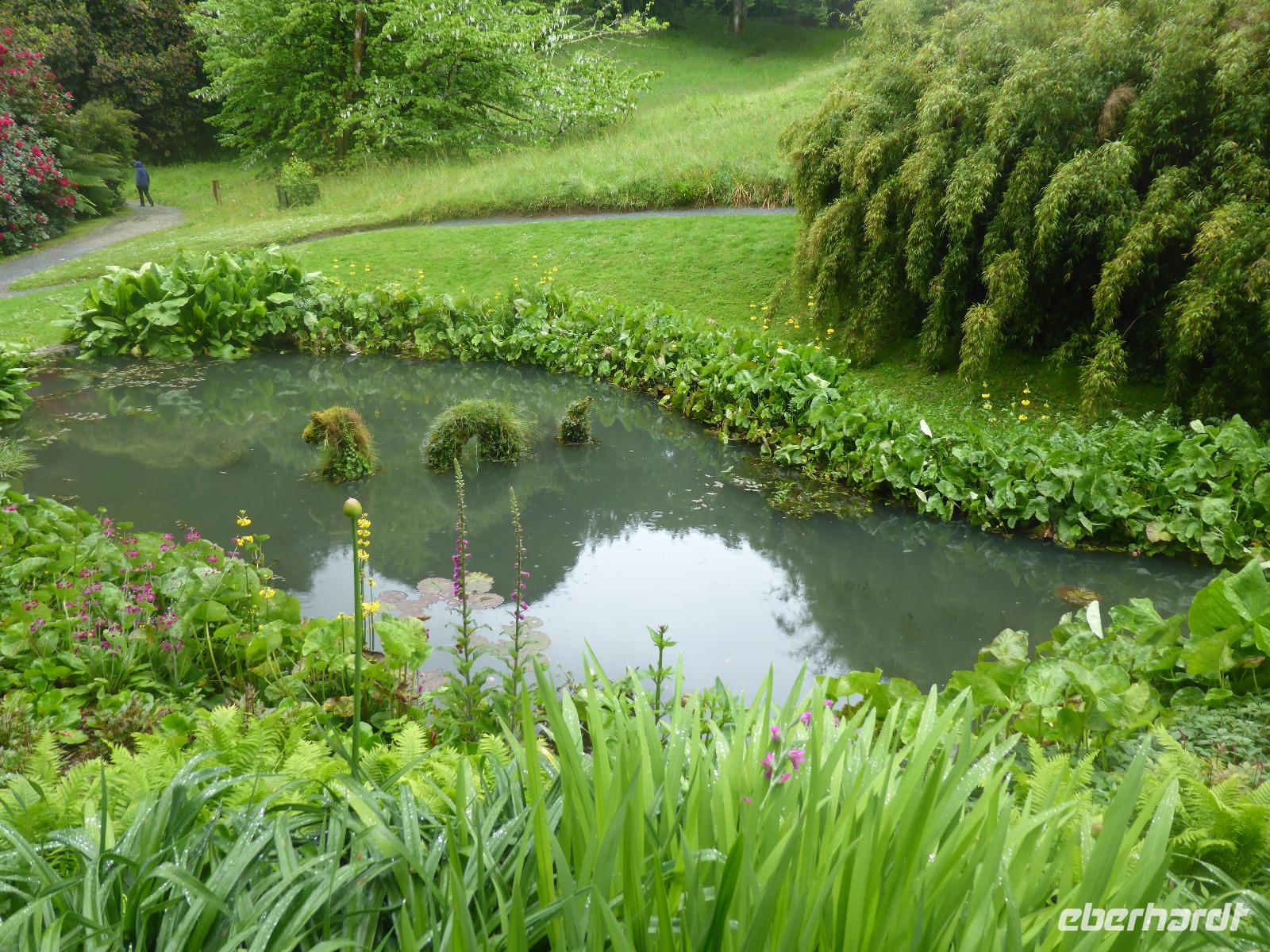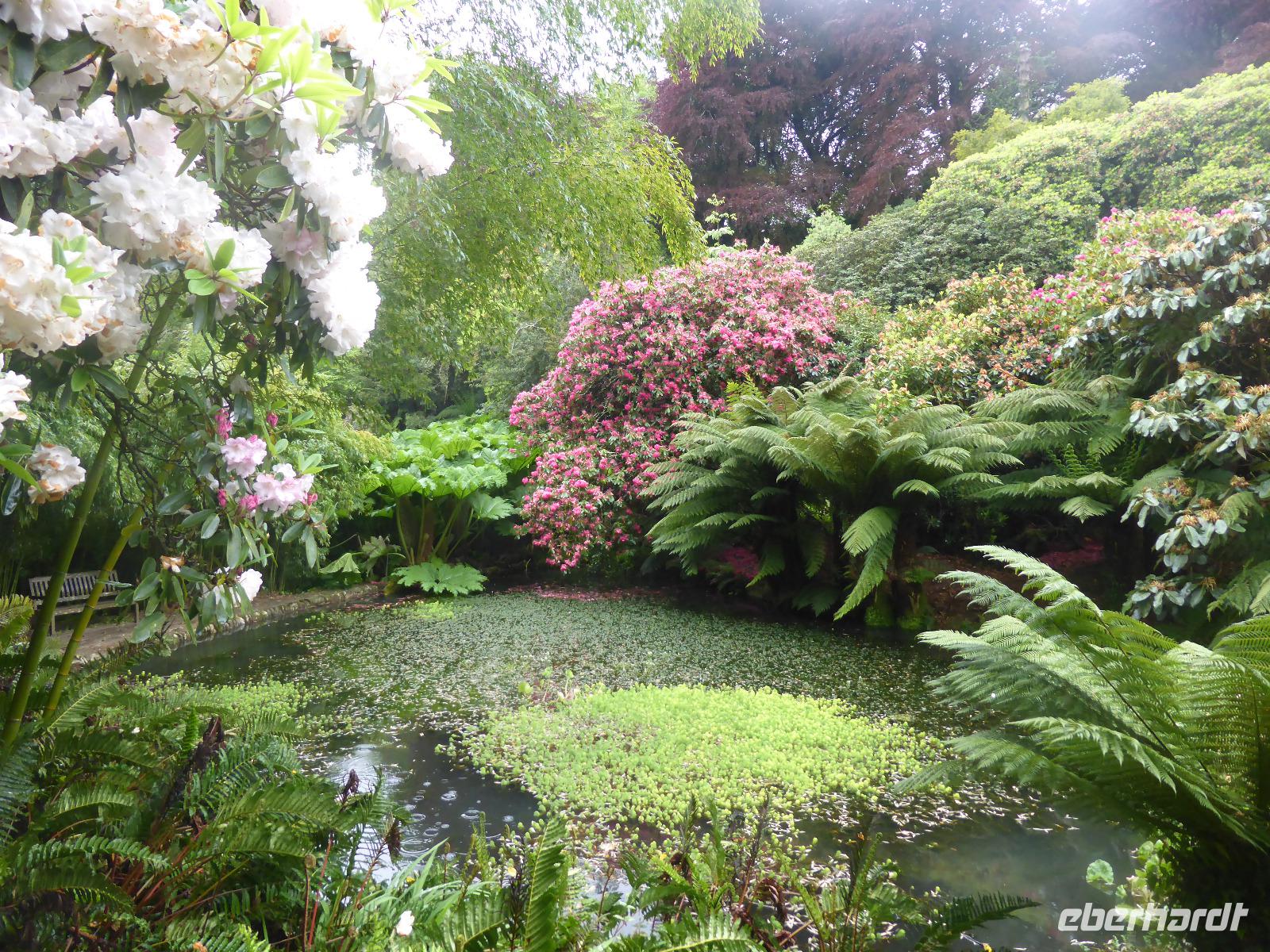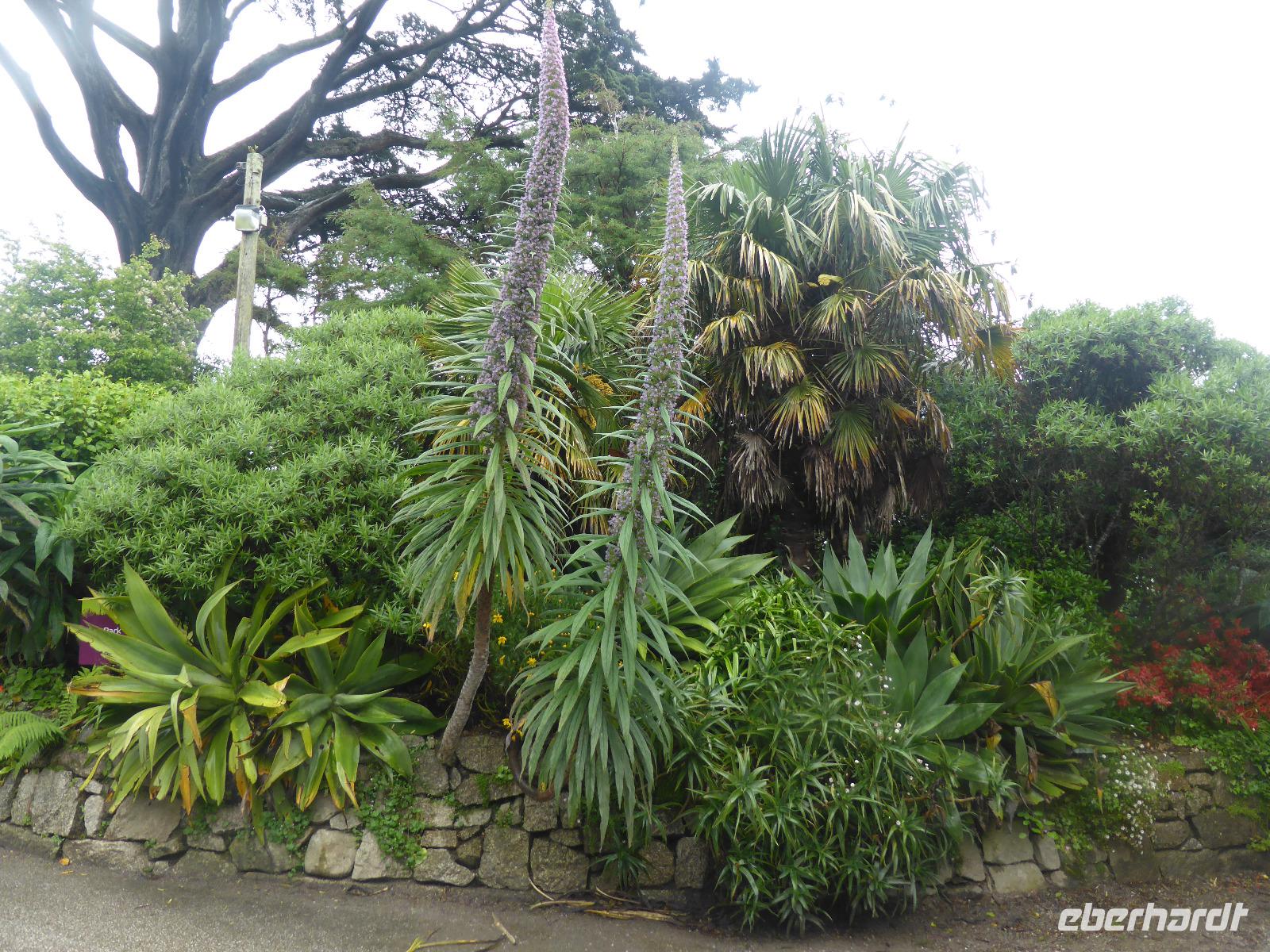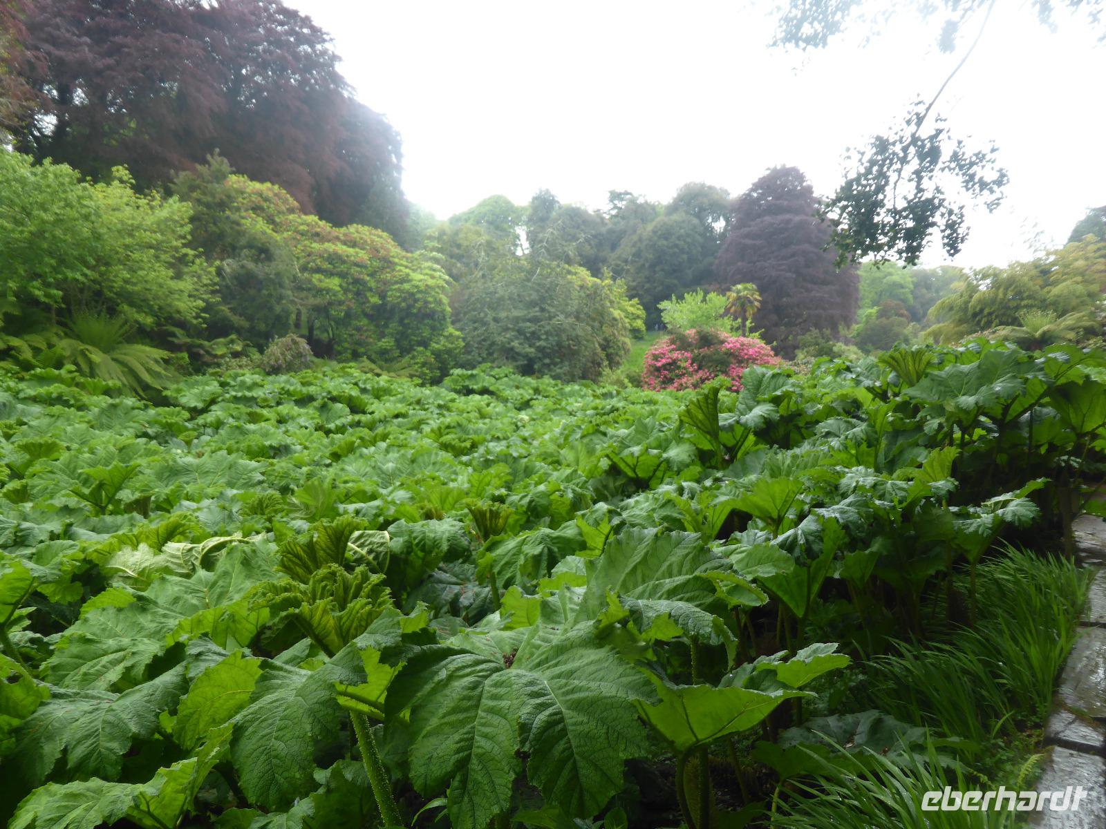 Am Nachmittag besuchten wir die Lost Gardens of Heligan bei St. Austell. Im 19. Jahrhundert gehörte dieser Garten der Familie Treymayne. Diese konnte sich den Luxus von mehr als 20 Gärtnern leisten. Nach dem Ersten Weltkrieg verstarb der letzte männliche Erbe und ein Großteil dieser Parkanlage verwilderte. 1990 nahm sich Tim Smit, ein Holländer aus Kent diesem „verlorenen Garten" an, nachdem er auf ein völlig überwuchertes Cottage aufmerksam wurde. Anhand alter Aufzeichnungen und Gartenhistorikern verhalf er Heiligan zu einer grandiosen Widergeburt. Bemerkenswert ist der neun Hektar große subtropische „Dschungel" mit den Palmen, Bambumwäldern und Gunneras (Mammutblättern). Zur Gestaltung des Gartens tragen auch Baum- und Landschaftsskulpturen bei, wie die schlafende Schönheit Mud Maid oder der Kopf des Riesen. Ein Spaziergang durch die Blumen- und Gemüsegärten mit mehr als 12 Kartoffelsorten und ca. 50 Apfelbaumsorten versäumten wir nicht. Eine Augenweide waren die riesigen Rhododendren.