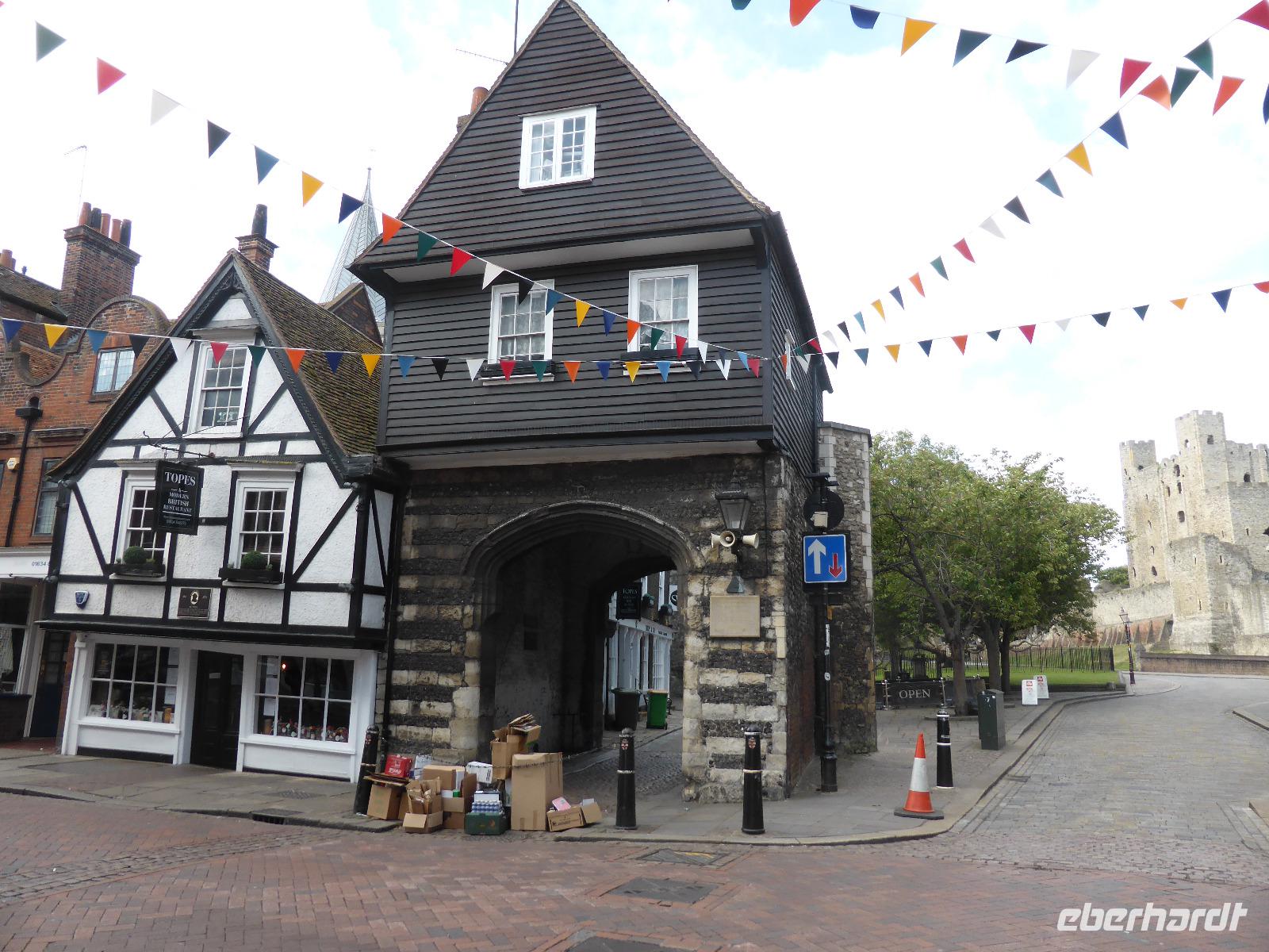 Am frühen Morgen erwartete uns das erste englische Frühstück an Bord der Fähre. Unsere Fähre lag bereits im Hafen, sodass wir pünktlich das Schiff verlassen konnten. Das erste Ziel auf britischen Boden sollte Rochester sein. Über die Dartfordbrücke gelangten wir auf die südliche Themseseite an die Mündung des Flusses Medway. In Rochester erwartete uns bereits unsere Stadtführerin Kerstin alias Mrs. Micawber aus dem Roman von Charles Dickens „David Copperfield" in historischer Tracht. Auf den „Spuren von Charles Dickens" führte sie uns sehr abwechslungsreich und mit zahlreichen Informationen durch die beschauliche Kleinstadt.