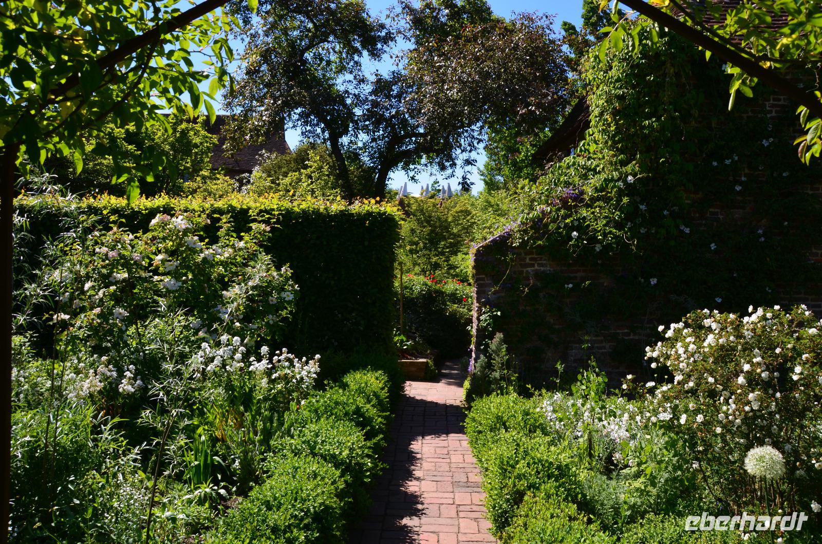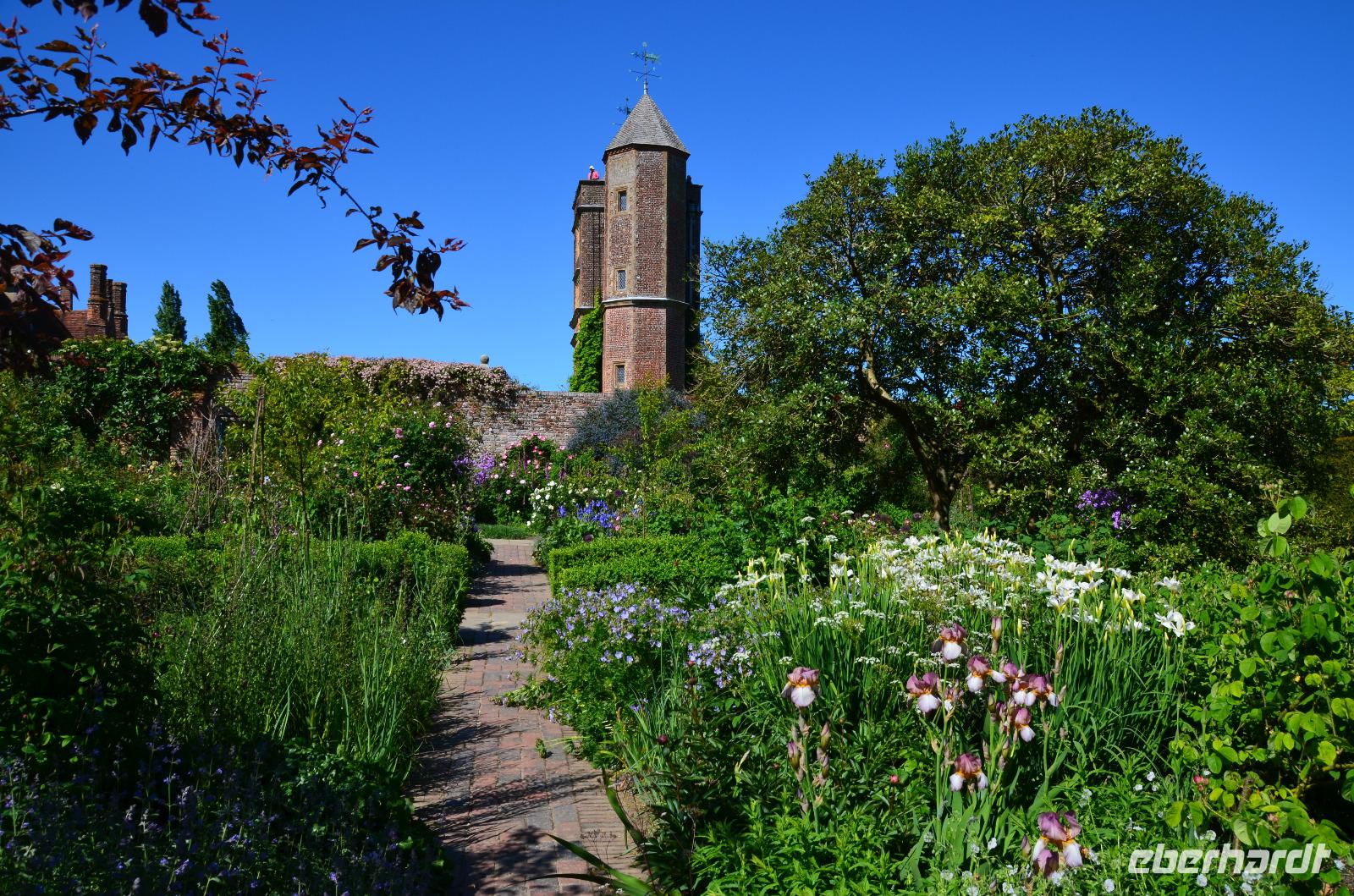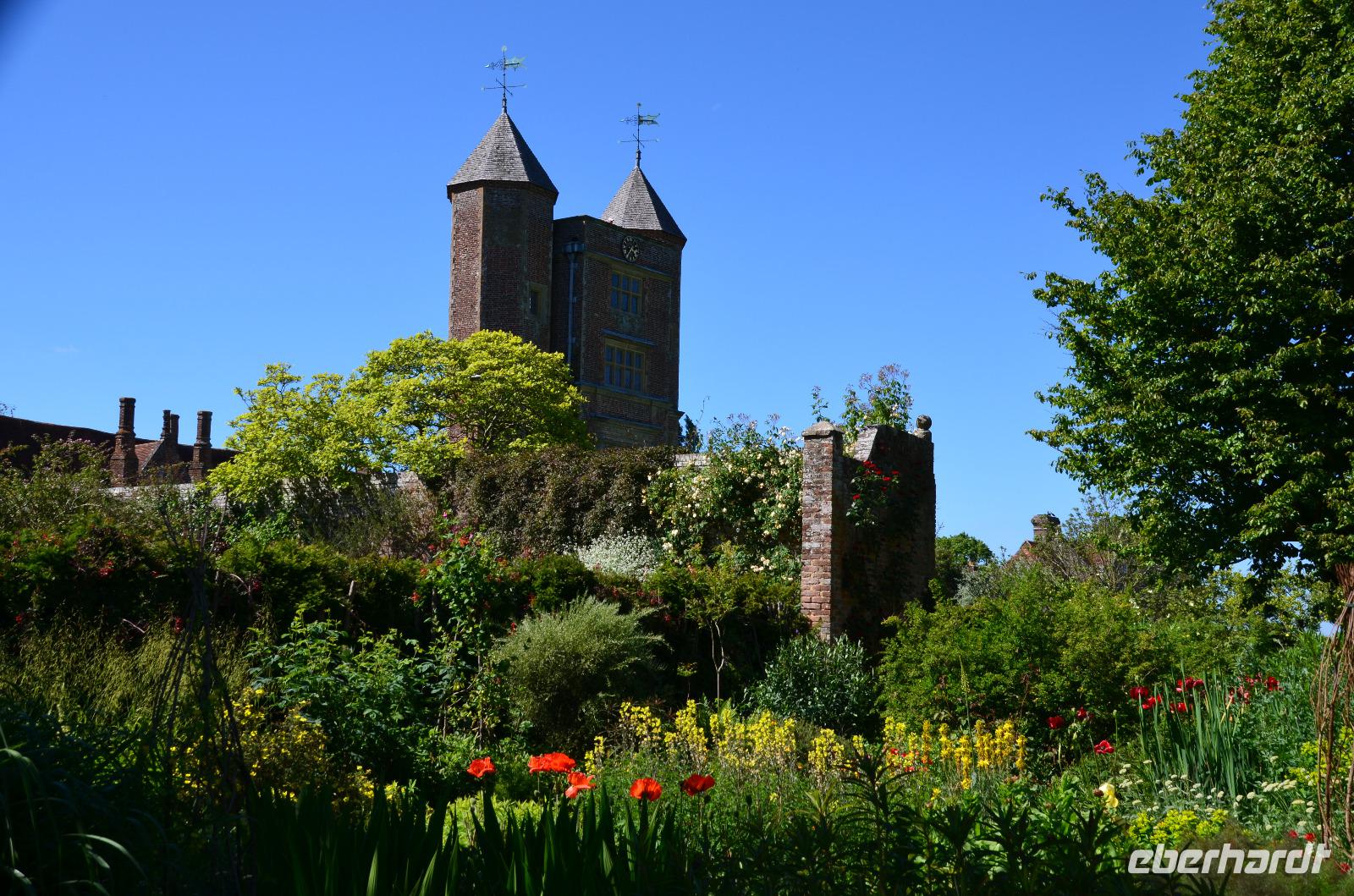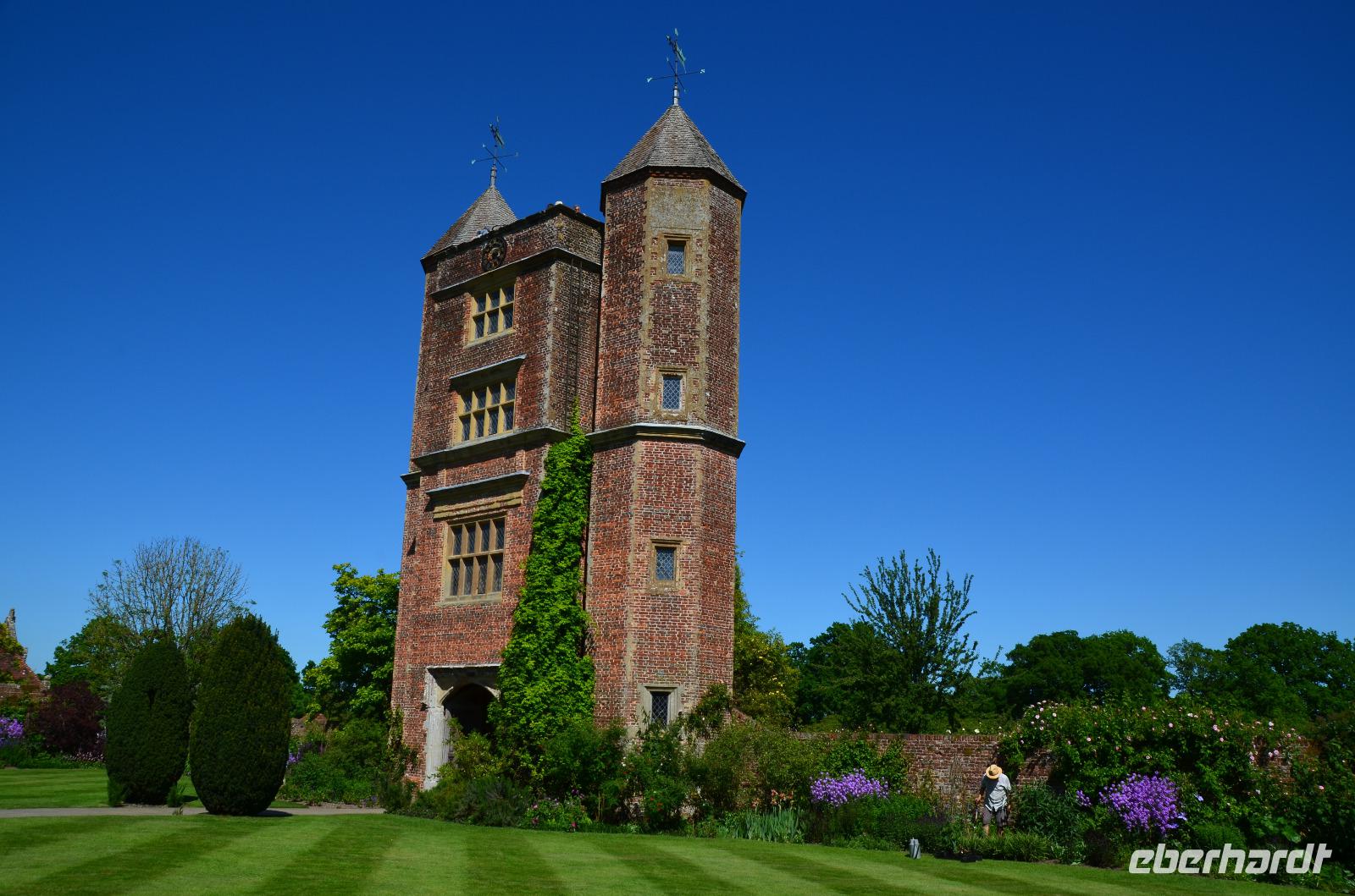 Am Platz der alten Schweinefarm in Sissinghurst erhebt sich ein Doppelturm in Ziegelbauweise über verschiedenen Themengärten, die vor vielen Jahrzehnten von der Autorin Vita Sackville-West und ihrem Ehemann angelegt worden waren. Wir genossen den sonnigen Nachmittag zwischen duftenden Rosen und bunt blühenden Beeten oder verschafften uns einen Überblick über die Anlage vom Aussichtspunkt des Doppelturms aus.