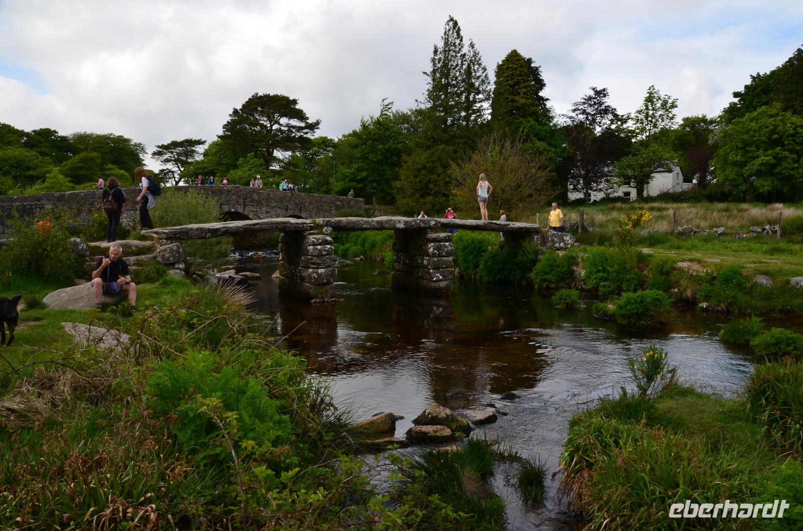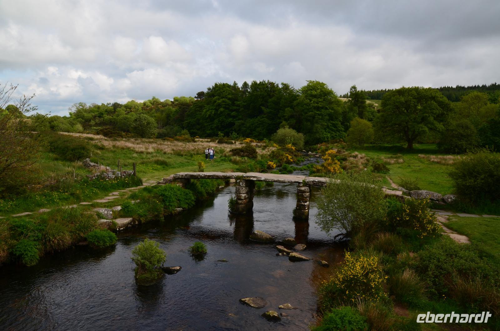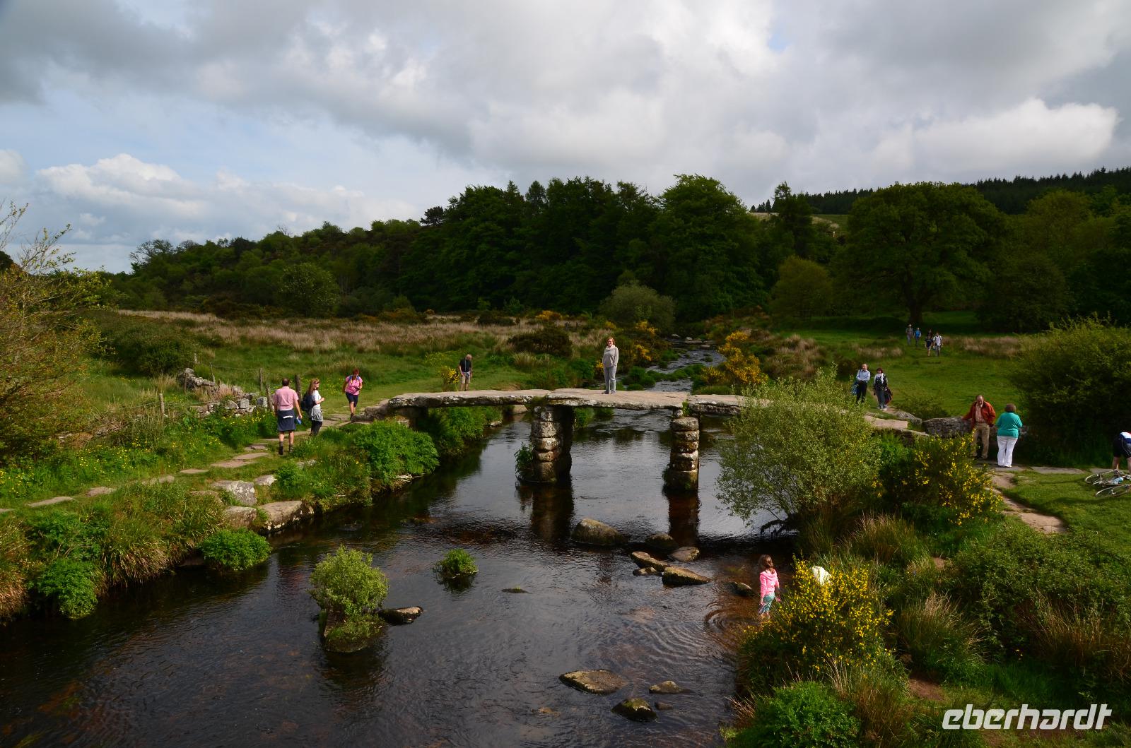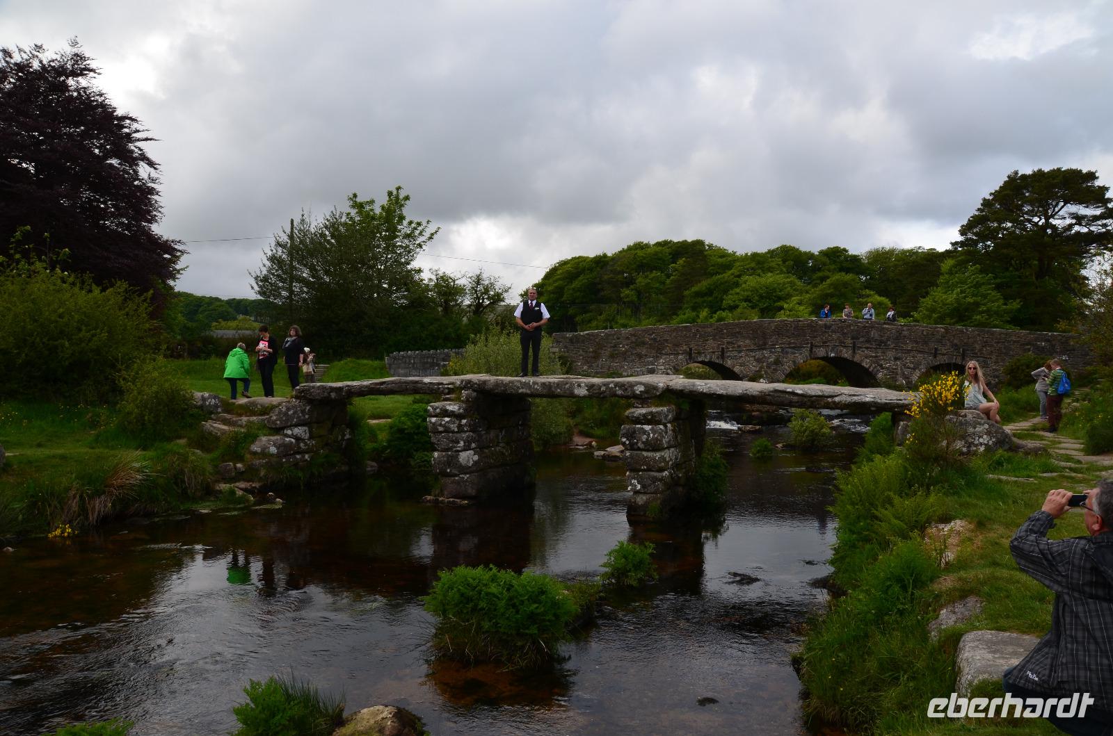 Dann aber wurde es richtig mystisch, das Dartmoor empfing uns mit saftig grünen Täler und karger Landschaft, schroffen Felsen auf den Höhen. Dazu die Geschichten um riesige Hunde mit glühenden Augen. Wir sahen keine der Bestien, dafür aber jede Menge Schafe und Dartmoor Ponys. Bei einer sogenannten „Clapper Bridge", die wir sogar zu Fuß benutzten, um den Fluss zu überqueren, machten wir Halt. Die Brücke stammt bereits aus dem 12. Jahrhundert und besteht aus lose aufeinander gelegten großen schweren Granitplatten. Der Begriff stammt aber aus dem Keltischen und bezieht sich auf die großen Steinplatten.