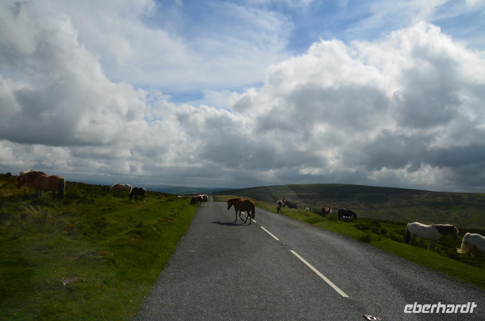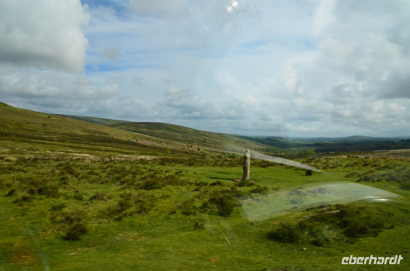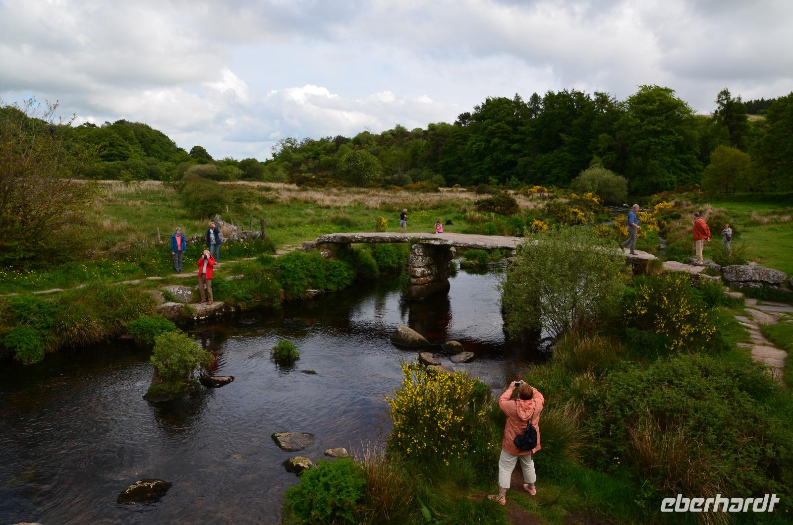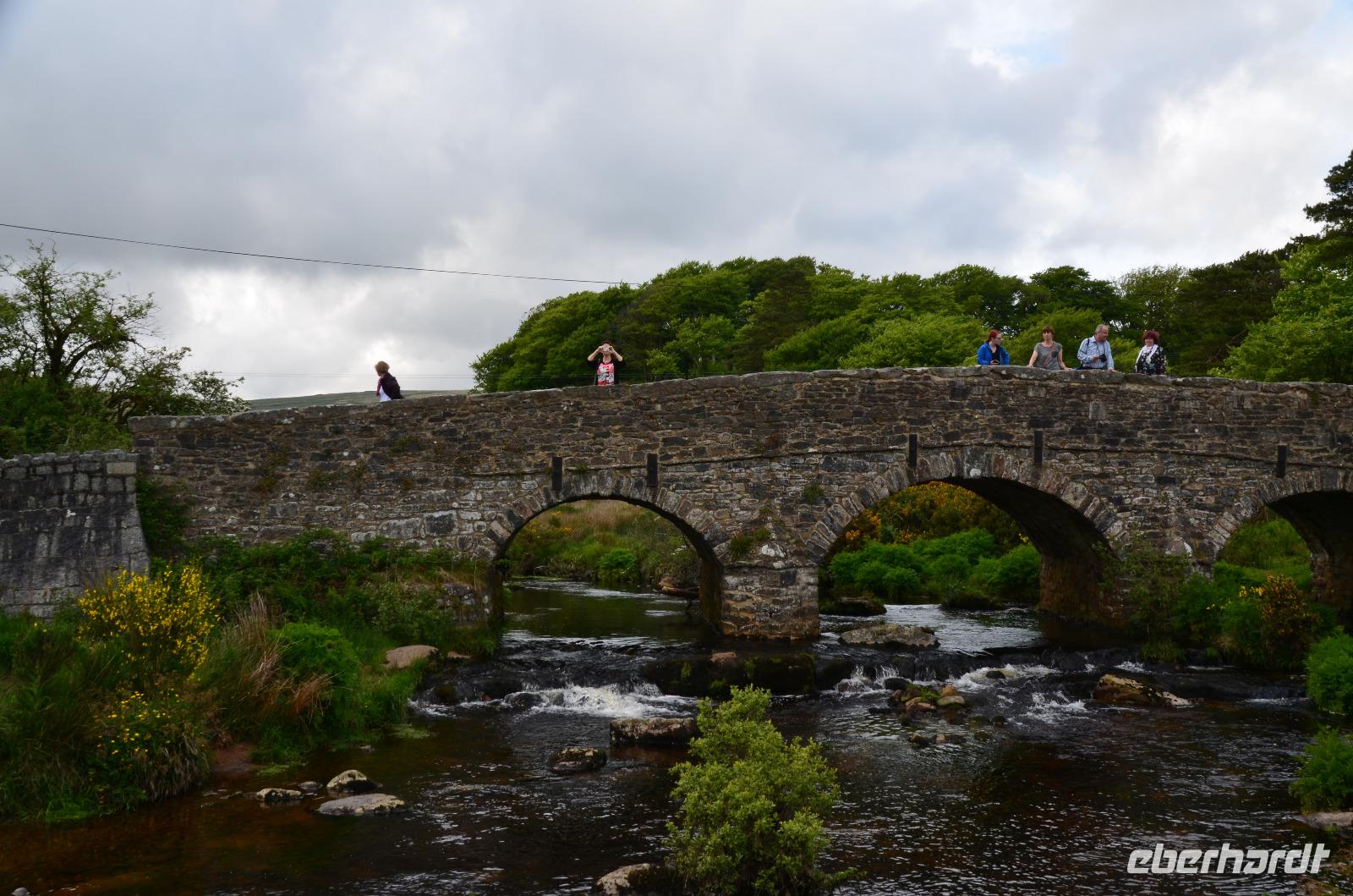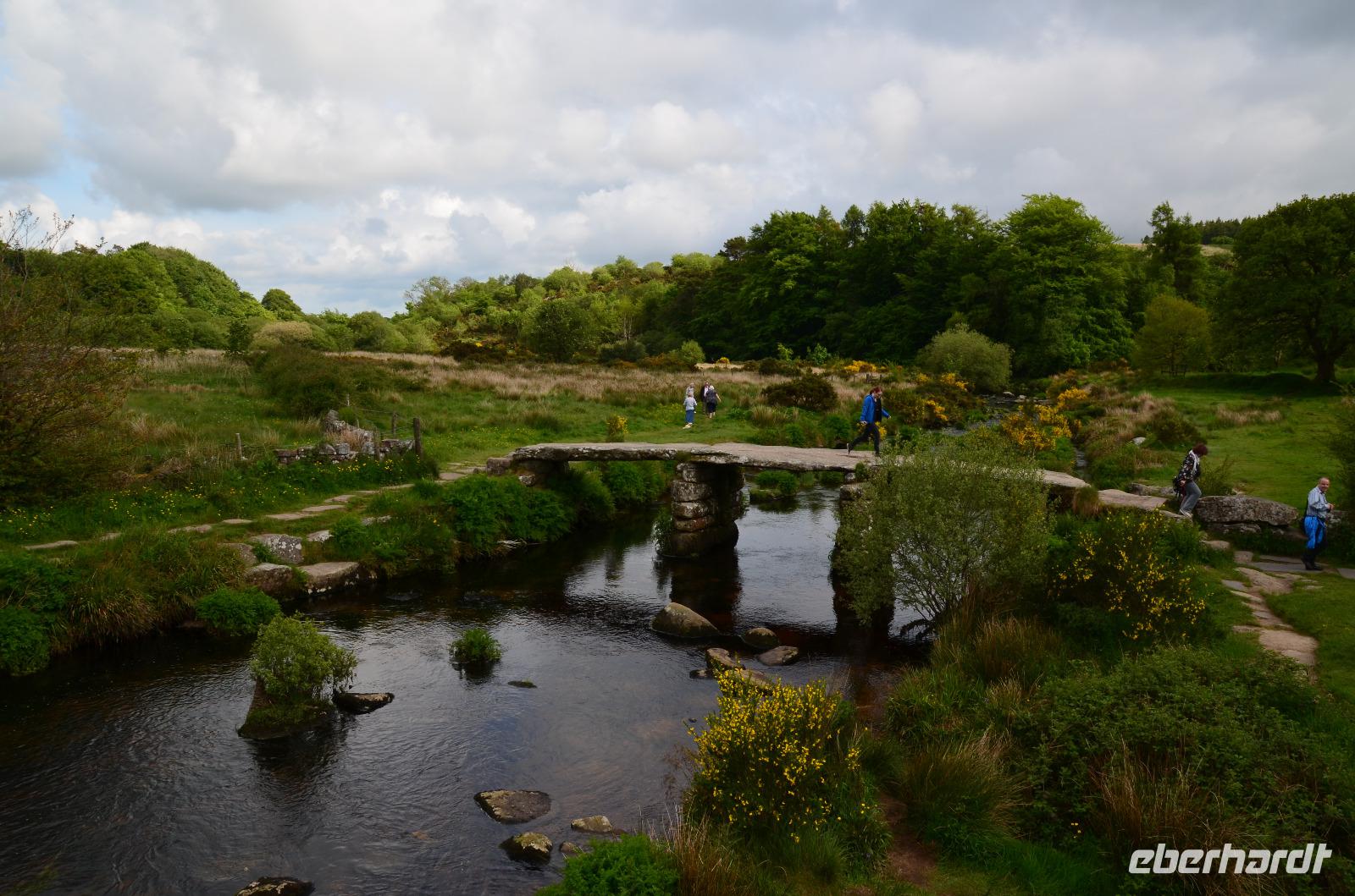 Dann aber wurde es richtig mystisch, das Dartmoor empfing uns mit saftig grünen Täler und karger Landschaft, schroffen Felsen auf den Höhen. Dazu die Geschichten um riesige Hunde mit glühenden Augen. Wir sahen keine der Bestien, dafür aber jede Menge Schafe und Dartmoor Ponys. Bei einer sogenannten „Clapper Bridge", die wir sogar zu Fuß benutzten, um den Fluss zu überqueren, machten wir Halt. Die Brücke stammt bereits aus dem 12. Jahrhundert und besteht aus lose aufeinander gelegten großen schweren Granitplatten. Der Begriff stammt aber aus dem Keltischen und bezieht sich auf die großen Steinplatten.