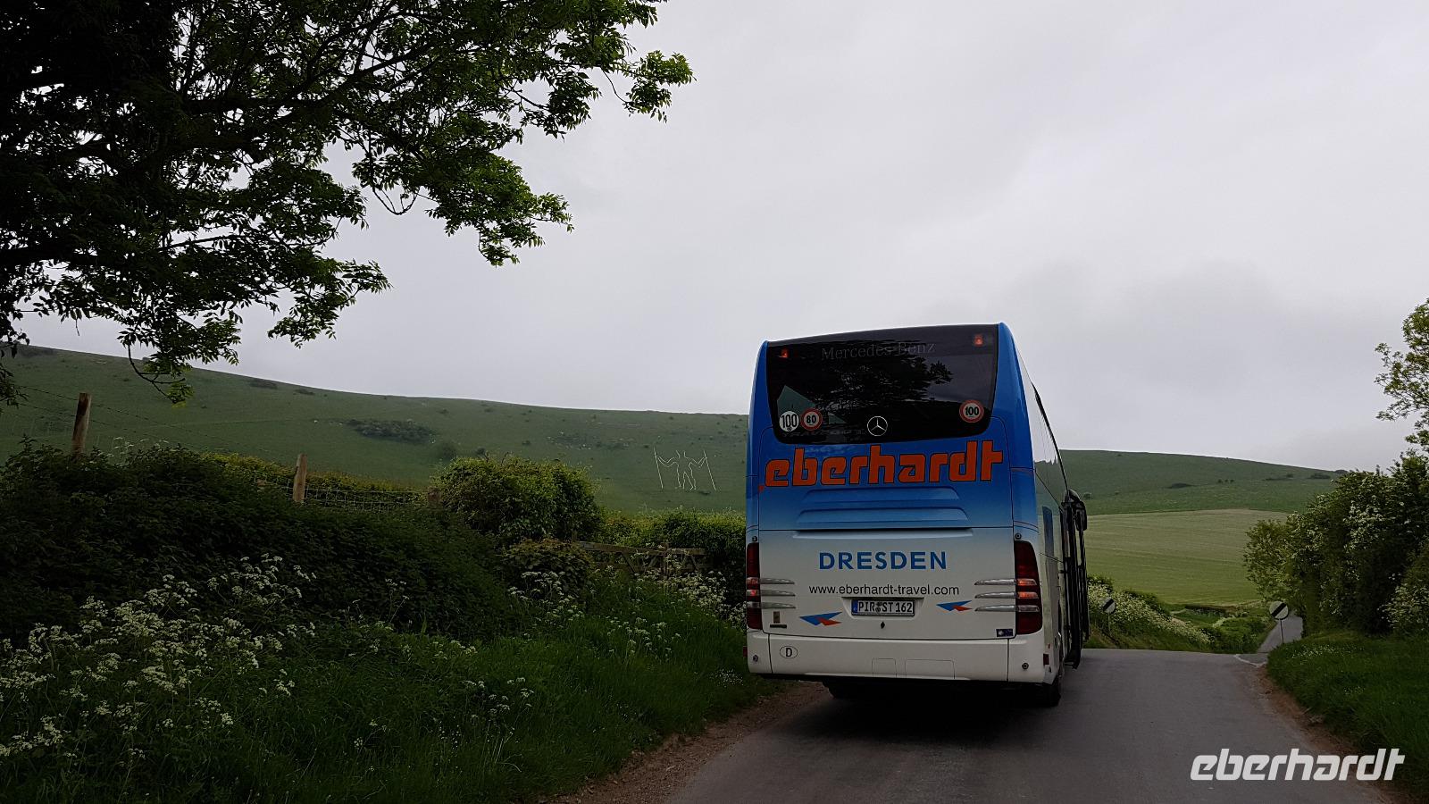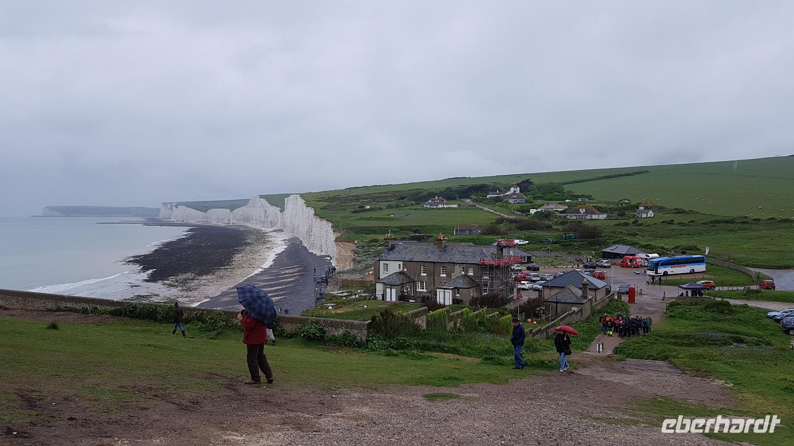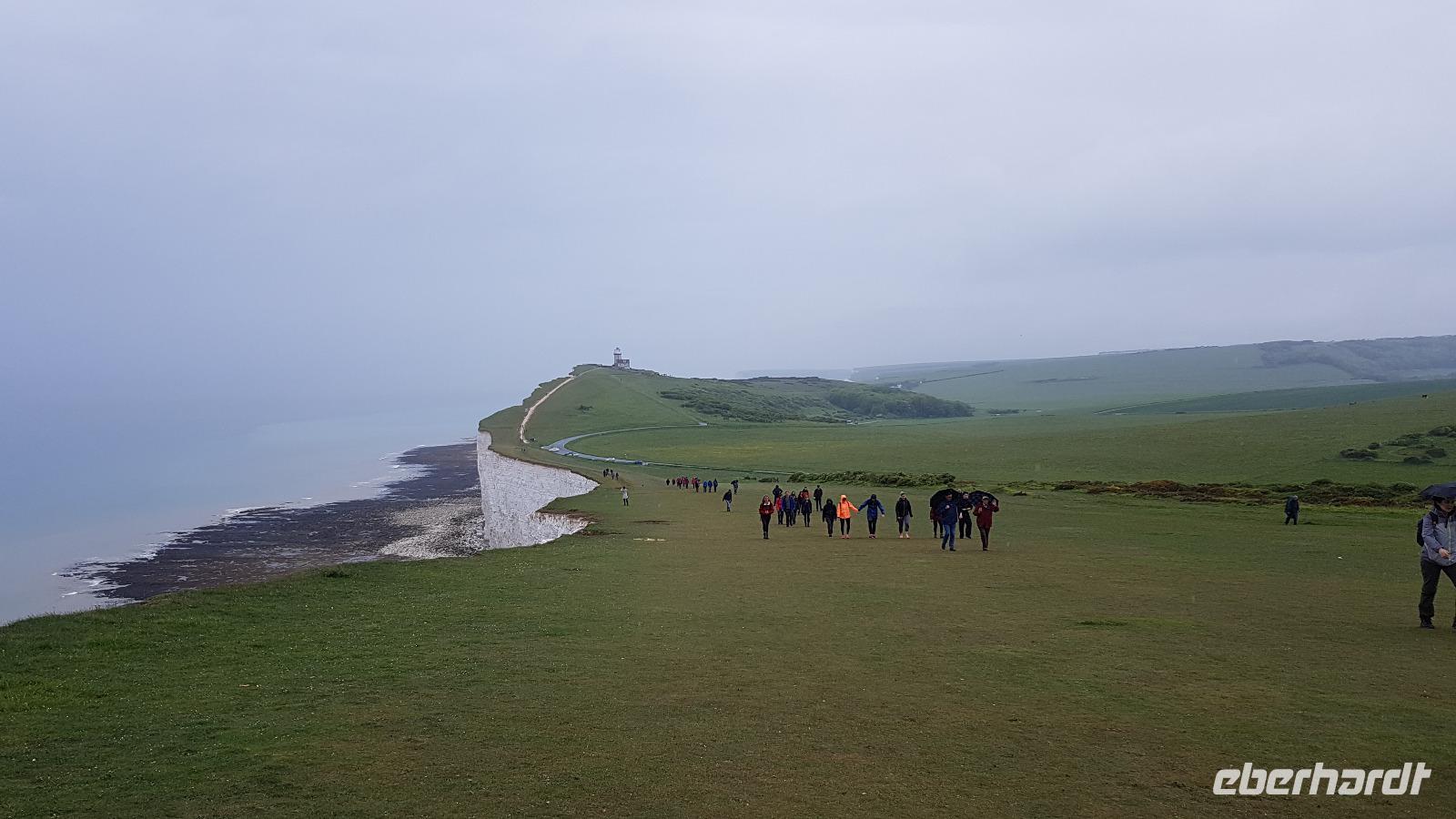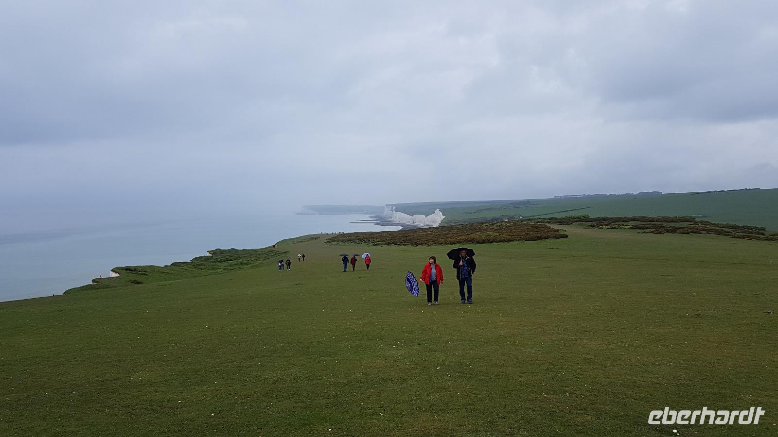 Heute läßt uns der Wettergott im Stich. Schon beim ersten Abstecher nach Wilmington fängt es an zu nieseln. Eigentlich wollten wir hier „nur" den „Long Man of Wilmington" anschauen, eine ca. 70 Meter hohe Figur, die in den Kreidehügel gearbeitet wurde. Gegenwärtig hat man die Umrisse ausgegossen, damit sie besser erhalten werden können. Wir entdecken aber auch die Kirche, in derem Garten sich eine 1000-jährige Eibe versteckt. Gut, dass einige Gäste schon einmal hier mit Eberhardt Travel wandern waren und diese Gegend gut kennen. Julie schließlich schloss uns auch die Kirche auf, so dass wir hineinschauen konnten. Aus der Zeit des 12. Jahrhunderts stammt sie und wurde aus dem gebaut, was lokal vorhanden war: dem Feuerstein. Schon ging es weiter und in der Ferne entdecken wir eine weitere Kreide-Figur: das White Horse, das weiße Pferd. Rasch erreichen wir Brighton, die „Badewanne der Londoner". Der Royal Pavillon ist unser Ziel. Wohl eines der exzentrischsten Bauwerke, dass es in England gibt. Der Prince of Wales, der spätere George IV. ließ es erbauen. 1822 wurde es fertiggestellt. Beeindruckend die Ausstattung, während sich die äußere „Hülle" an den Palästen der indischen Maharadschas orientiert dominiert im Inneren eindeutig ein chinesischer Stil. Goerge IV. wollte beeindrucken- das ist ihm auch bei uns gelungen- was für eine Pracht. Einige besuchen anschließend den Garten oder schlendern durch die Lanes, es ist noch Zeit, bis wir uns an der Landungsbrücke wiedertreffen. Wir fahren weiter zu den „Seven Sisters", den Sieben Schwestern. Diesen Namen tragen die Kreidefelsen, an Birling Gap steigen wir daher aus und die Treppe zum Kieselstrand hinunter. Leider hört es nicht auf zu Nieseln, das hält uns aber nicht davon ab, eine Wanderung zum Beachy Head zu unternehmen. Immer an der Abbruchkante entlang führt unser Pfad und die Blicke auf die Kreidefelsen sind umwerfend. Sie erreichen immerhin eine Höhe von 162 Metern und sind damit Großbritanniens höchste Kreidefelsen. Der Name Beachy Head hat übrigens nichts mit Beach= Strand zu tun, er kommt vielmehr vom französischen Beauchef (schönes Kap). Es hat auch aufgehört zu regnen und vorbei am Leuchtturm Belle Tout Lighthouse erreichen wir schließlich unser Ziel, wo Jan schon mit dem Bus auf uns wartet. Aber erst einmal gibt es für die Wanderer ein Eis. Am späten Nachmittag sind wir wieder im Hotel und jeder nutzt die freie Zeit wie es ihm beliebt bevor uns ein leckeres Abendessen erwartet.