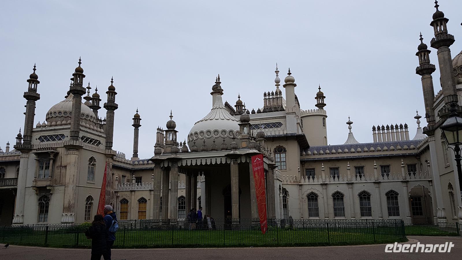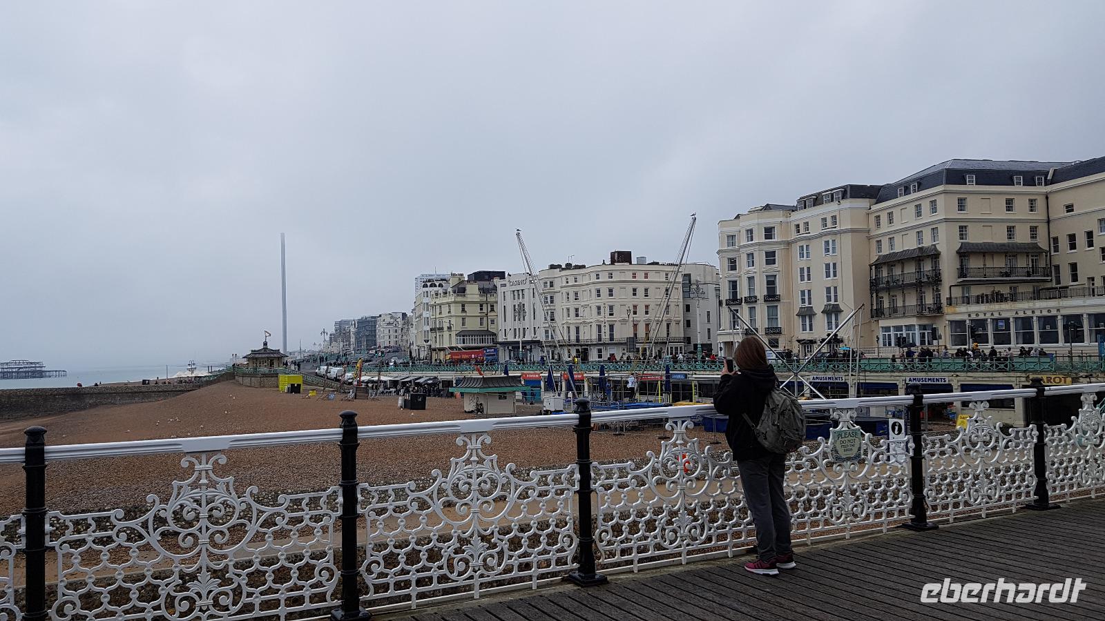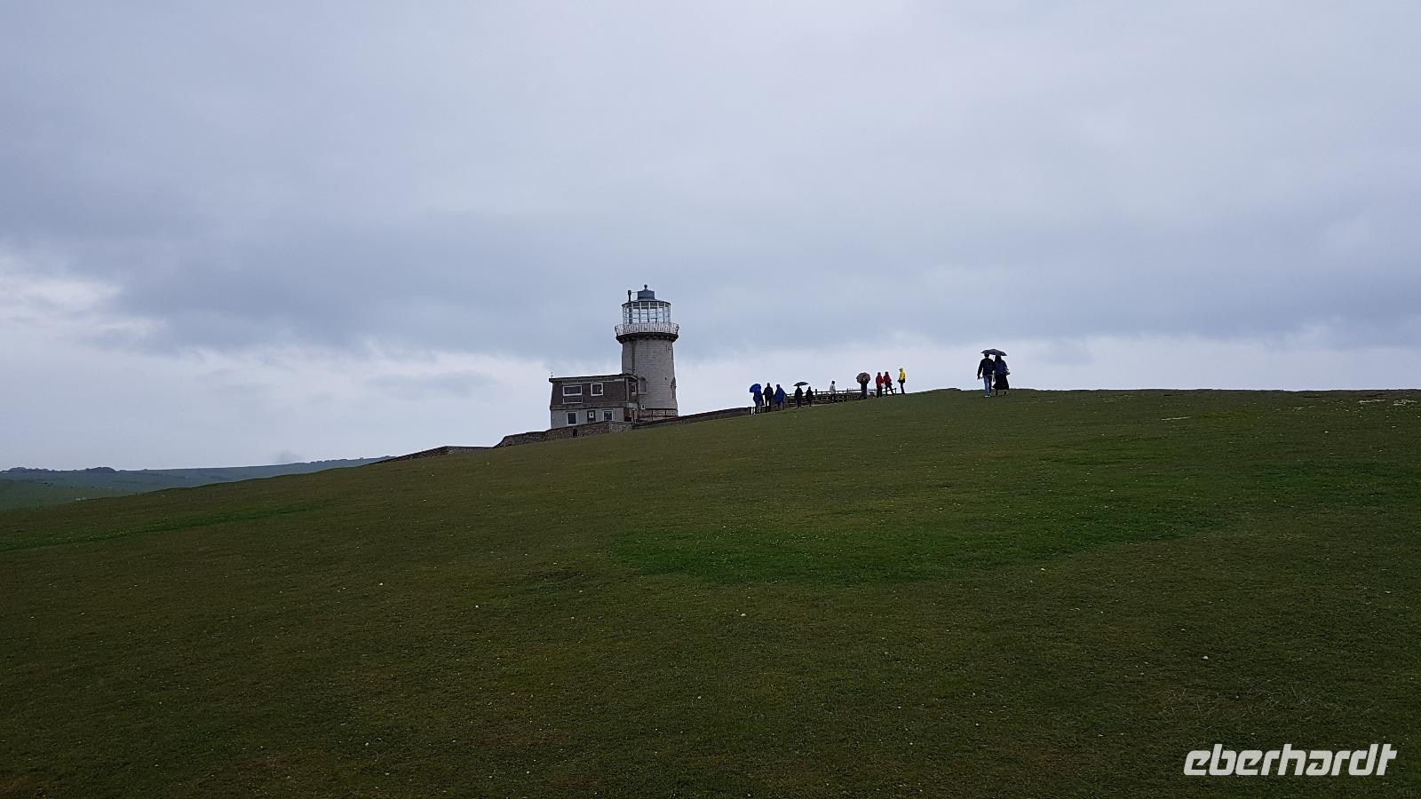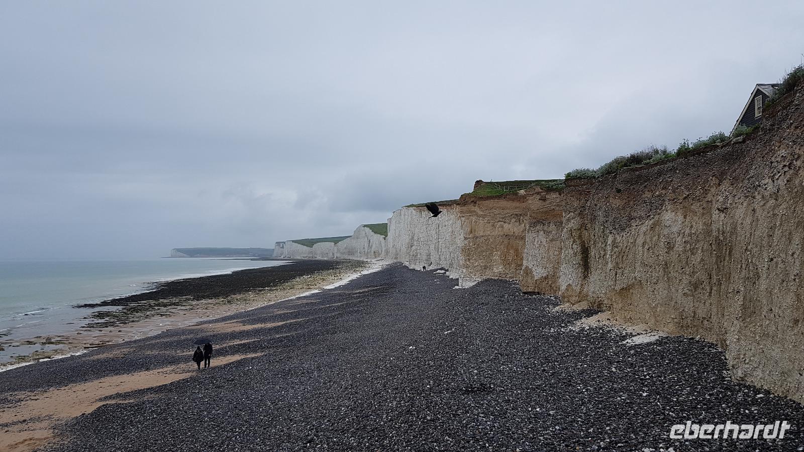 Heute läßt uns der Wettergott im Stich. Schon beim ersten Abstecher nach Wilmington fängt es an zu nieseln. Eigentlich wollten wir hier „nur" den „Long Man of Wilmington" anschauen, eine ca. 70 Meter hohe Figur, die in den Kreidehügel gearbeitet wurde. Gegenwärtig hat man die Umrisse ausgegossen, damit sie besser erhalten werden können. Wir entdecken aber auch die Kirche, in derem Garten sich eine 1000-jährige Eibe versteckt. Gut, dass einige Gäste schon einmal hier mit Eberhardt Travel wandern waren und diese Gegend gut kennen. Julie schließlich schloss uns auch die Kirche auf, so dass wir hineinschauen konnten. Aus der Zeit des 12. Jahrhunderts stammt sie und wurde aus dem gebaut, was lokal vorhanden war: dem Feuerstein. Schon ging es weiter und in der Ferne entdecken wir eine weitere Kreide-Figur: das White Horse, das weiße Pferd. Rasch erreichen wir Brighton, die „Badewanne der Londoner". Der Royal Pavillon ist unser Ziel. Wohl eines der exzentrischsten Bauwerke, dass es in England gibt. Der Prince of Wales, der spätere George IV. ließ es erbauen. 1822 wurde es fertiggestellt. Beeindruckend die Ausstattung, während sich die äußere „Hülle" an den Palästen der indischen Maharadschas orientiert dominiert im Inneren eindeutig ein chinesischer Stil. Goerge IV. wollte beeindrucken- das ist ihm auch bei uns gelungen- was für eine Pracht. Einige besuchen anschließend den Garten oder schlendern durch die Lanes, es ist noch Zeit, bis wir uns an der Landungsbrücke wiedertreffen. Wir fahren weiter zu den „Seven Sisters", den Sieben Schwestern. Diesen Namen tragen die Kreidefelsen, an Birling Gap steigen wir daher aus und die Treppe zum Kieselstrand hinunter. Leider hört es nicht auf zu Nieseln, das hält uns aber nicht davon ab, eine Wanderung zum Beachy Head zu unternehmen. Immer an der Abbruchkante entlang führt unser Pfad und die Blicke auf die Kreidefelsen sind umwerfend. Sie erreichen immerhin eine Höhe von 162 Metern und sind damit Großbritanniens höchste Kreidefelsen. Der Name Beachy Head hat übrigens nichts mit Beach= Strand zu tun, er kommt vielmehr vom französischen Beauchef (schönes Kap). Es hat auch aufgehört zu regnen und vorbei am Leuchtturm Belle Tout Lighthouse erreichen wir schließlich unser Ziel, wo Jan schon mit dem Bus auf uns wartet. Aber erst einmal gibt es für die Wanderer ein Eis. Am späten Nachmittag sind wir wieder im Hotel und jeder nutzt die freie Zeit wie es ihm beliebt bevor uns ein leckeres Abendessen erwartet.