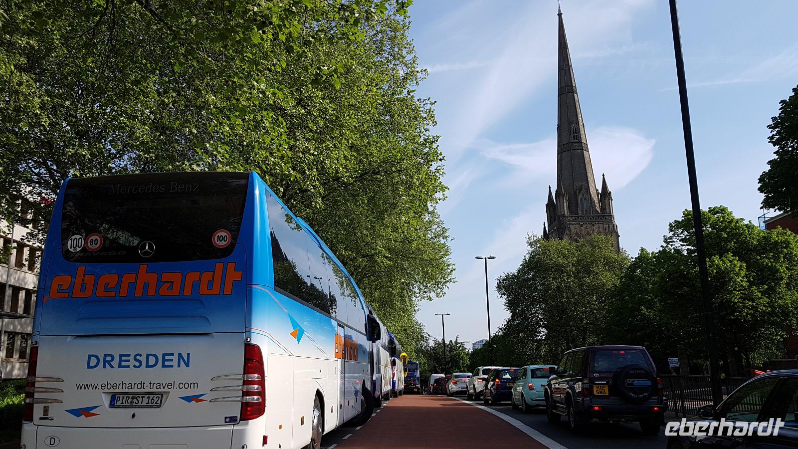 Schon wieder heißt es zeitig aufstehen, ab 05:30 Uhr gibt es Frühstück und 06:20 Uhr treffen wir uns, um die Fähre zu verlassen. Wir fahren mit dem Bus von der Fähre, passieren die Passkontrolle und dann heißt es: Herzlich willkommen in England! Ganz offensichtlich wirft die bevorstehende Hochzeit des Prinzen am Wochenende seine Schatten voraus- wo kommen sonst die vielen Autos auf der Autobahn her ? Es geht kaum vorwärts und so erreichen wir Rochester leicht verspätet. Auch hier nur Stau sodass wir kurzerhand bereits an der Grenze zum historischen Rochester aussteigen und uns erst einmal die Kathedrale hier ansehen. Inzwischen treffen wir auf Kerstin- unsere Stadtführerin für unseren "Walk auf den Spuren von Charles Dickens". Im originalgetreuen Kostüm spaziert sie mit uns durch ihr Rochester, seit mehr als 20 Jahren lebt sie, die ursprünglich aus Leipzig kommt, hier. Sie zeigt uns das "Abdankungs-Haus", hier übernachtete heimlich James II., bevor er bei Nacht und Nebel England verließ, wir sehen das Gerichtsgebäude, das Charles Dickens in seinem Romanen so detaillgetreu beschrieb, etliche andere Gebäude, die er so oder unter anderem Namen ebenfalls in seinen Romanen verwendete und die große Uhr, die (endlich restauriert) nun wieder die richtige Zeit zeigt und den kleinen Charles damals ängstigte weil er meinte, sie könnte ihm auf den Kopf fallen...Beeindruckend dann das Castle und seine Geschichte, wie Wilhelm der Eroberer es als Schutzburg errichten ließ, wie es listenreich niedergebrannt und eingenommen wurde. Auch den Garten sehen wir, in dem Heinrich VIII. seine spätere Frau Anna von Kleve zum ersten Mal sah- er (und auch sie) sollen so enttäuscht voneinander gewesen sein- die Ehe hielt gerade einmal 6 Monate. Er soll ihr nach der Scheidung Hever Castle überschrieben haben- das besuchen wir morgen. Nach einem Spaziergang über die High Street verabschieden wir uns von ihr und fahren zu unserem nächsten Ziel: London. Hier sind unsere Flug-Gäste bereits angekommen, konnten im Hotel einchecken und wurden zum Tower of London gebracht. Den konnten sie sich in aller Ruhe ansehen denn unsere Fahrt endete wieder und wieder im Stau auf der Autobahn. Am frühen Nachmittag endlich trafen wir uns und auch Rosi, unsere Stadtführerin für London war hier. Los ging es Richtung City und am Buckingham Palace stoppten wir für eine kleine individuelle Erkundung. Mit vielen Fotos bei strahlendem Sonnenschein im Gepäck ging es weiter, wir erfuhren von Wellington, passierten das legendäre Hard Rock Cafe und den Green Park, vom St. James Palast ging es zum Picadilly Circus, ins West-End-Viertel. Wir sahen den Trafalgar Square, White Hall und fuhren über die Westminster Bridge, vorbei am Waterloo Hauptbahnhof zurück über die Walterloo Bridge. Mehrfach passieren wir die Grenze zwichen der City of London und der City of Westminster, Rosi zeigt uns jeweils die Drachen, die sie zu bewachen scheinen. An der St.Pauls-Kathedrale schließlich können wir wieder aussteigen und wer möchte fährt im gegenüberliegenden Einkaufszentrum mit dem Fahrstuhl auf das Dach- was für ein Ausblick auf die neue Skyline und St. Pauls. Weiter geht unsere Fahrt an der Guild Hall vorbei, dem Leadenhall Market immer Richtung Osten- hier liegt unser Hotel in Stratford und wir verabschieden uns von Rosi. Bis zum Abendessen ist noch Zeit und wir können in Ruhe einchecken. Leider ist die Ruhe für unseren Jan gleich vorbei- kein Busparkplatz weit und breit in Sicht...Und so fährt er Runde um Runde bis er schließlich doch fündig wird und etwas verspätet auch sein Abendessen genießen kann.
