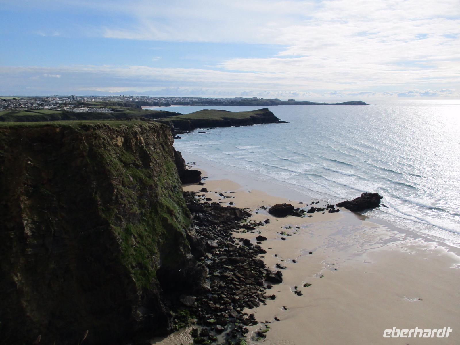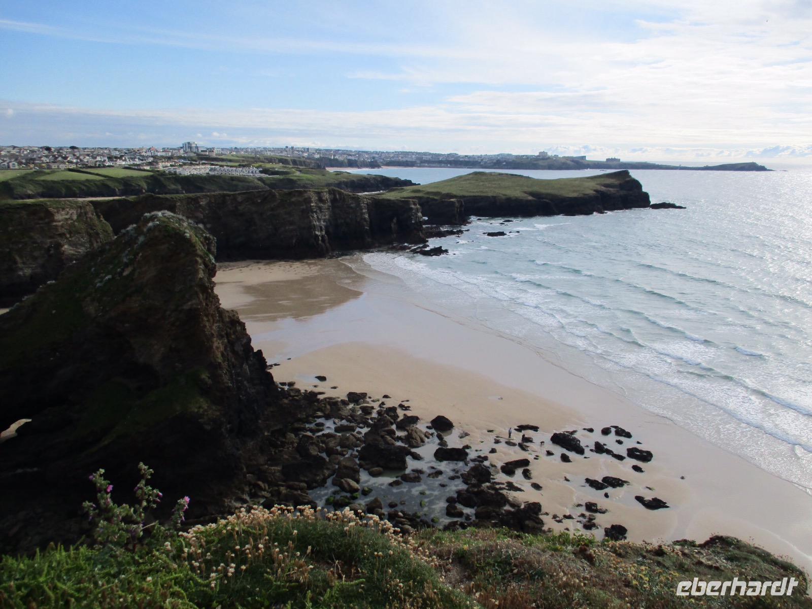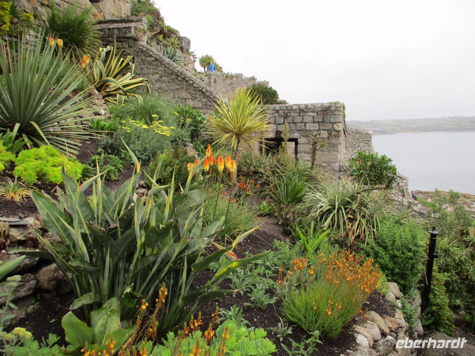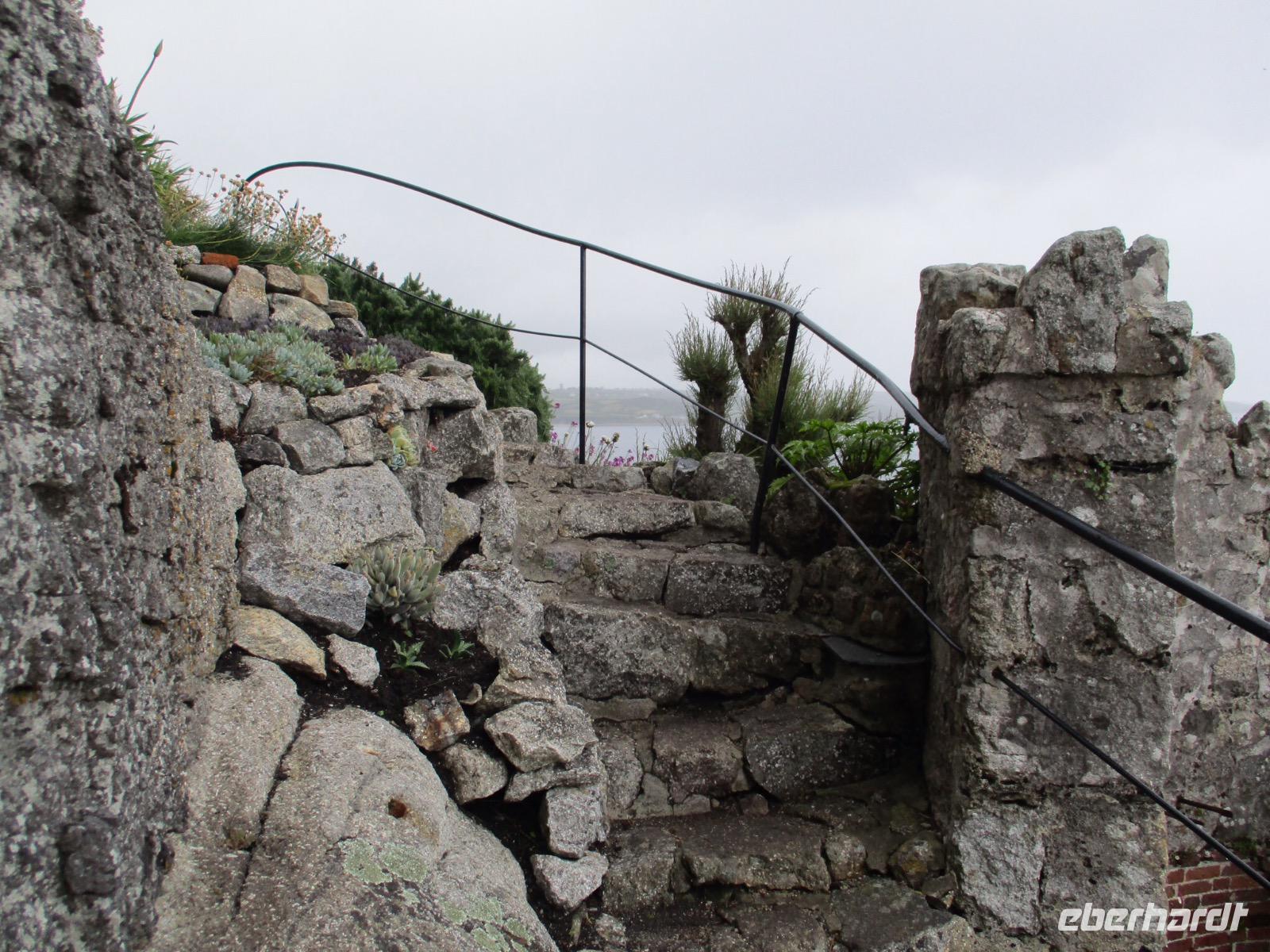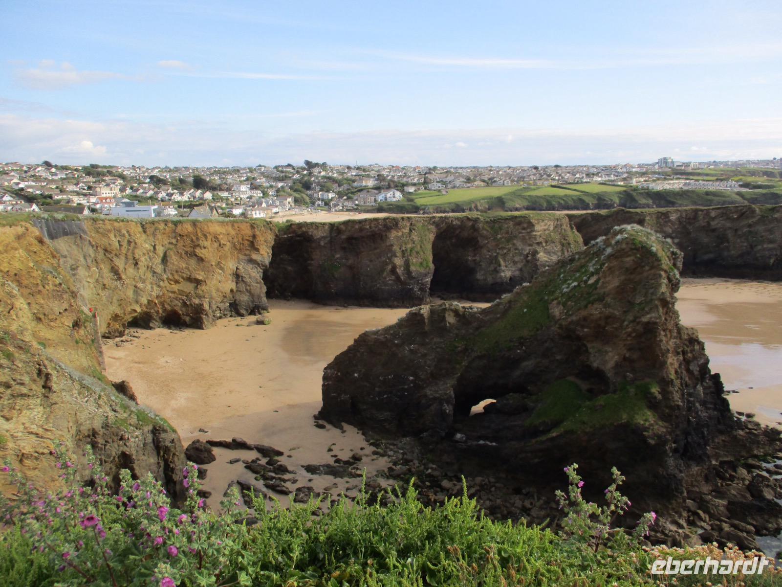 Gleich am Morgen machten wir uns auf und fuhren in Richtung Südwesten. Zunächst erreichten wir das Ende der Welt Cornwalls und Englands. Wir spazierten einen Weg hinunter zum letzten Aussichtspunkt vor den Klippen, machten zahlreiche Fotos und sahen auch den Wegweiser, auf dem die Entfernung bis New York, 3147 Meilen, angezeigt wird. Einige erstanden Postkarten und ließen sich den begehrten Lands-End-Poststempel darauf drucken. In Marazion, unserem nächsten Halt, kann man hinüber blicken zum St. Michael's Mount, einer Gezeiteninsel. Weil Flut war, konnten wir nicht auf dem Causeway zu Fuß spazieren, um das Castle auf dem Hügel oder die herrlichen Felsengärten zu besichtigen, sondern fuhren mit einem der Boote hinüber und auch später wieder zurück zum Festland. Danach begaben wir uns in die Nähe von Falmouth und besuchten Trebah Garden, einen Schluchtengarten mit unzähligen verschiedenfarbigen Blüten, mit Gunneras (Mammutblatt), Baumfarnen, farbenfrohen Etagenprimeln und einem idyllischen Bächlein. Wir genossen diesen aussergewöhnlichen Garten, zu dem sogar ein Stück Strand gehört. Den Abend verbrachten wir wieder in unserem Sands Hotel in Newquay über dem Meer.