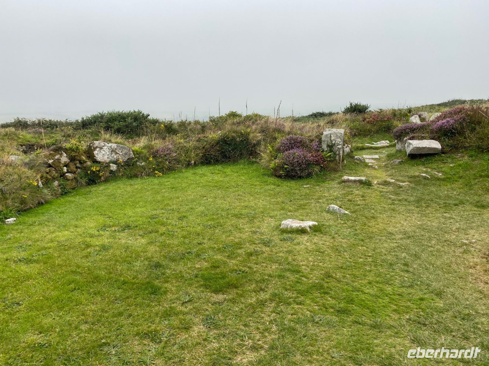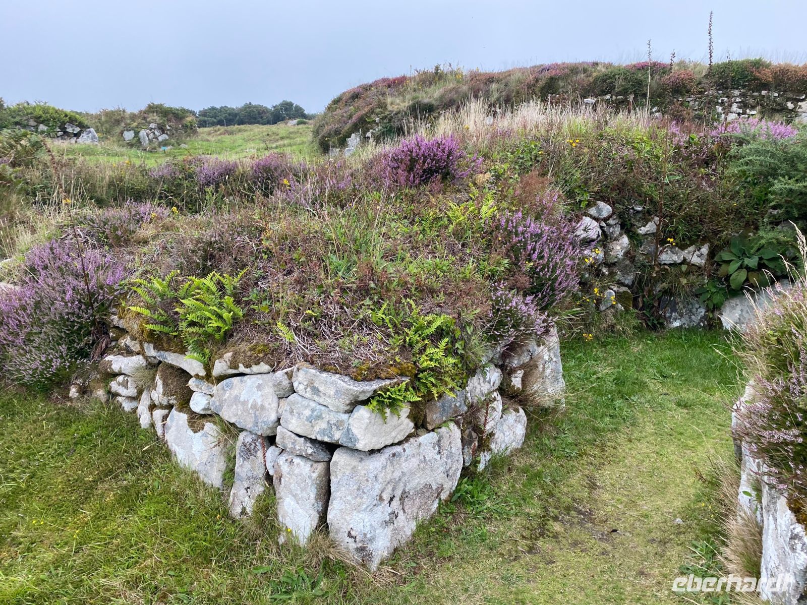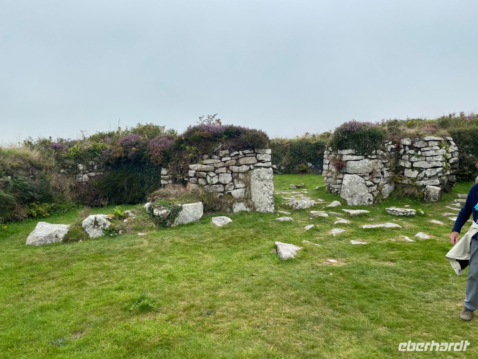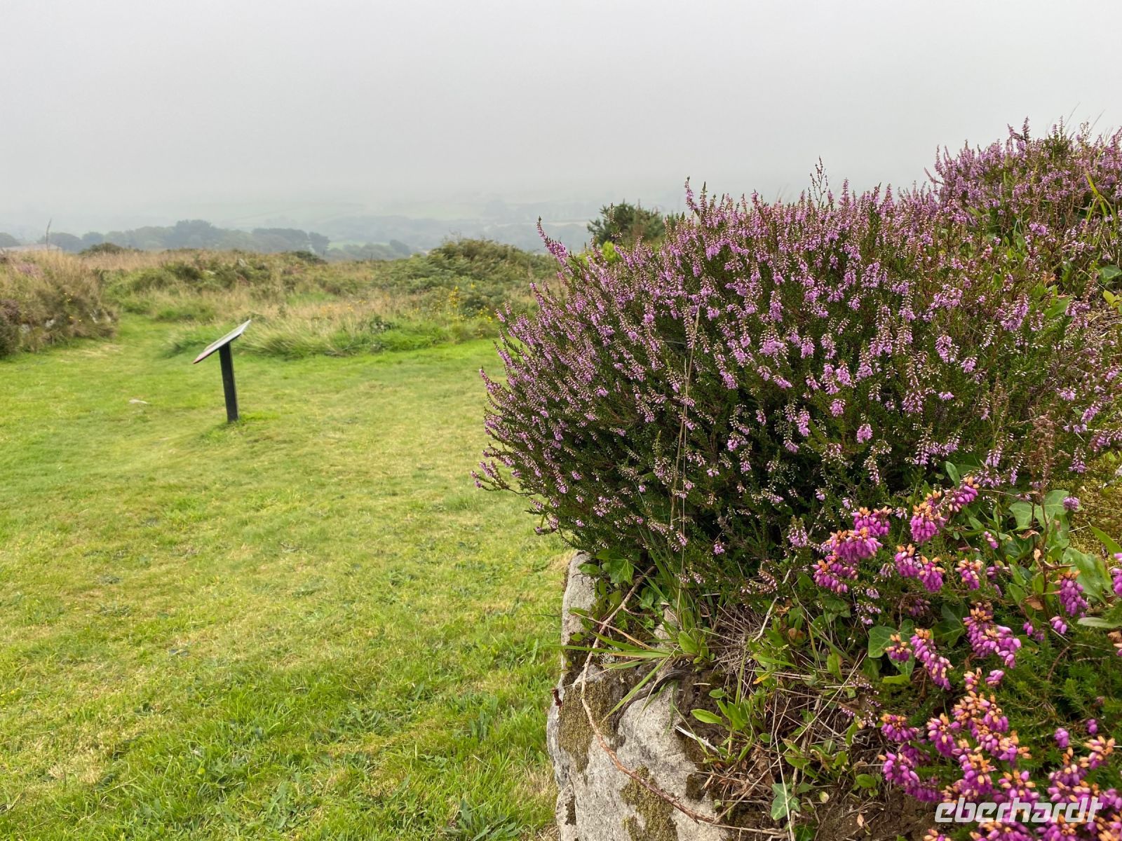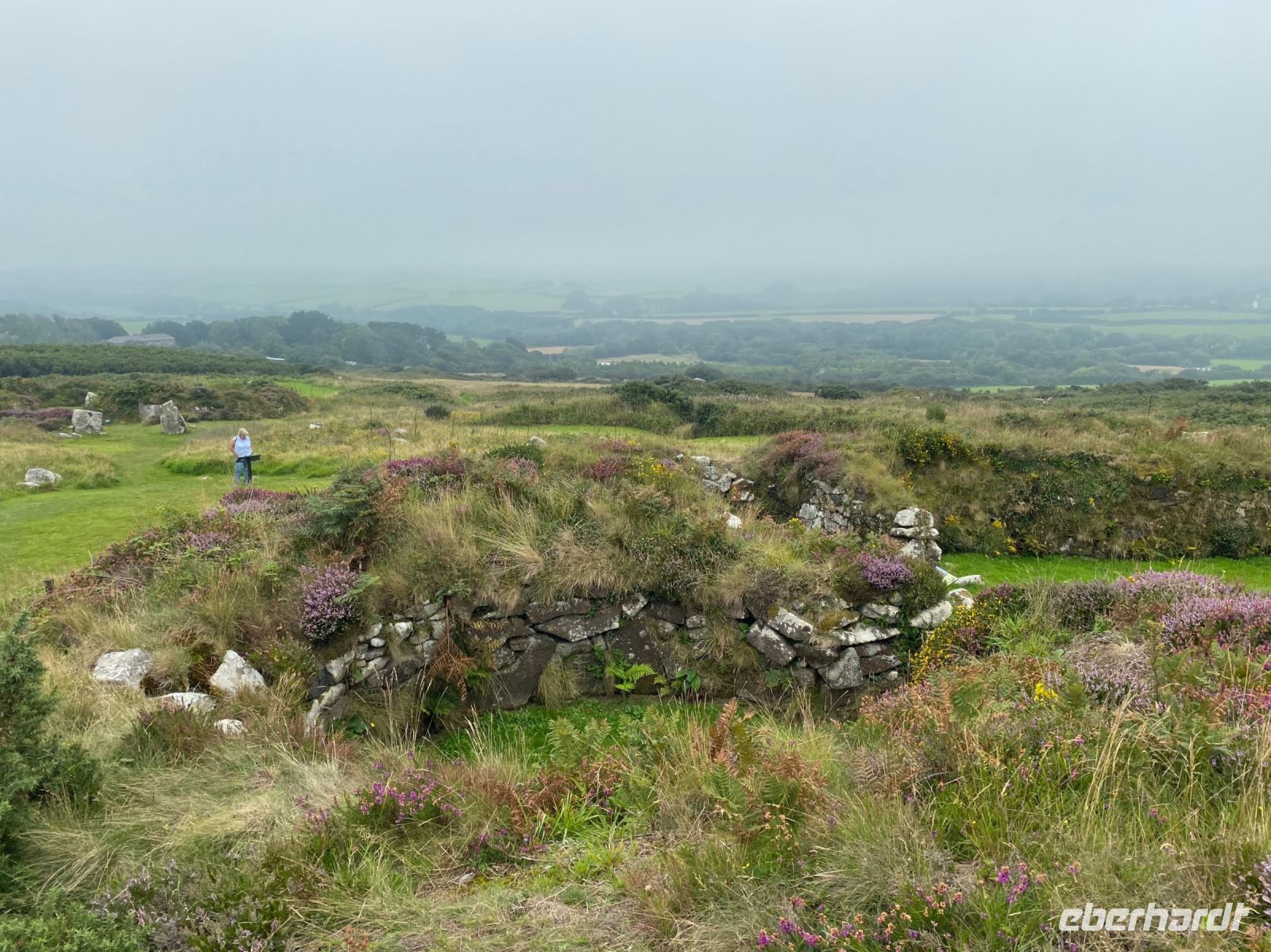 Zum Abschluss eines weiteren wunderschönen Tages geht es nun wieder zurück nach Osten in Richtung Penzance. Etwas oberhalb dieses Ortes liegen die Überreste einer über zwei Jahrtausende alten Siedlung. Auch hier wandern wir die die letzten Meter, der Bus wartet auf uns an einer kleinen Ausweiche zwischen Brombeersträuchern, einige Beeren sind schon reif. Ein Blütenmeer auf den alten Mauern der Siedlung belohnt uns für die kurze Strecke auf den Hügel an dem einst das alte Dorf von Chysauster stand.