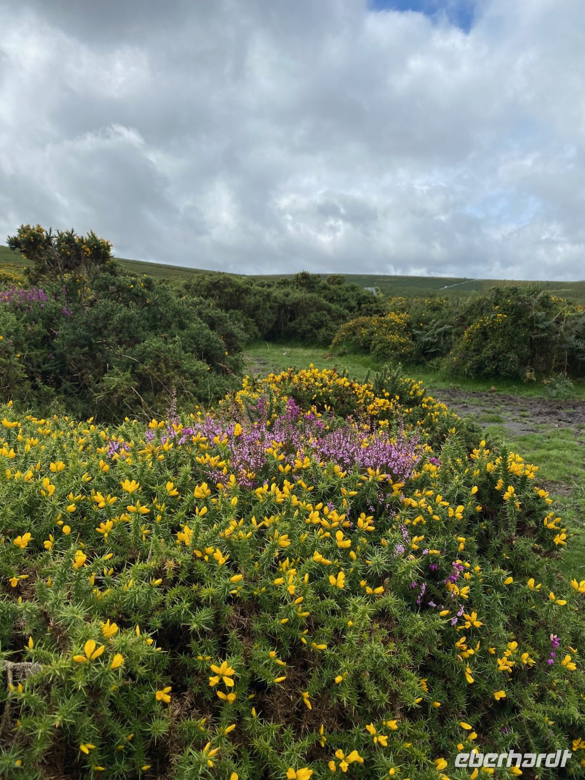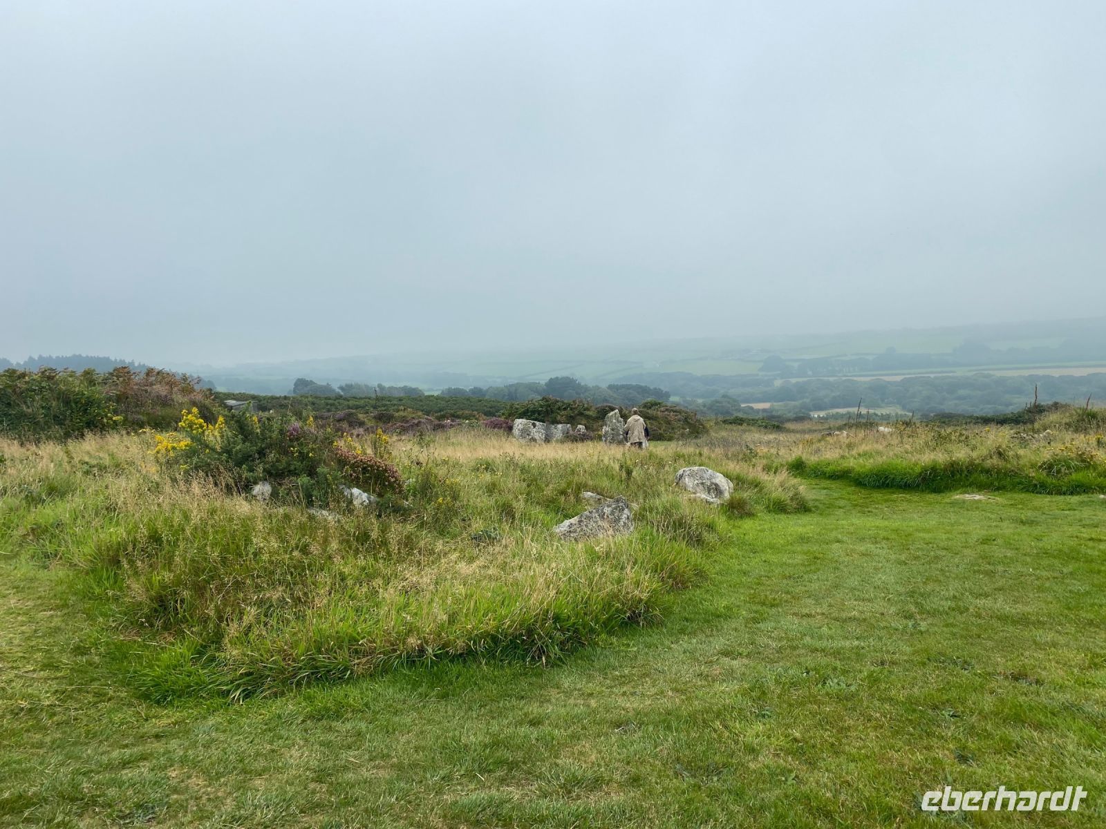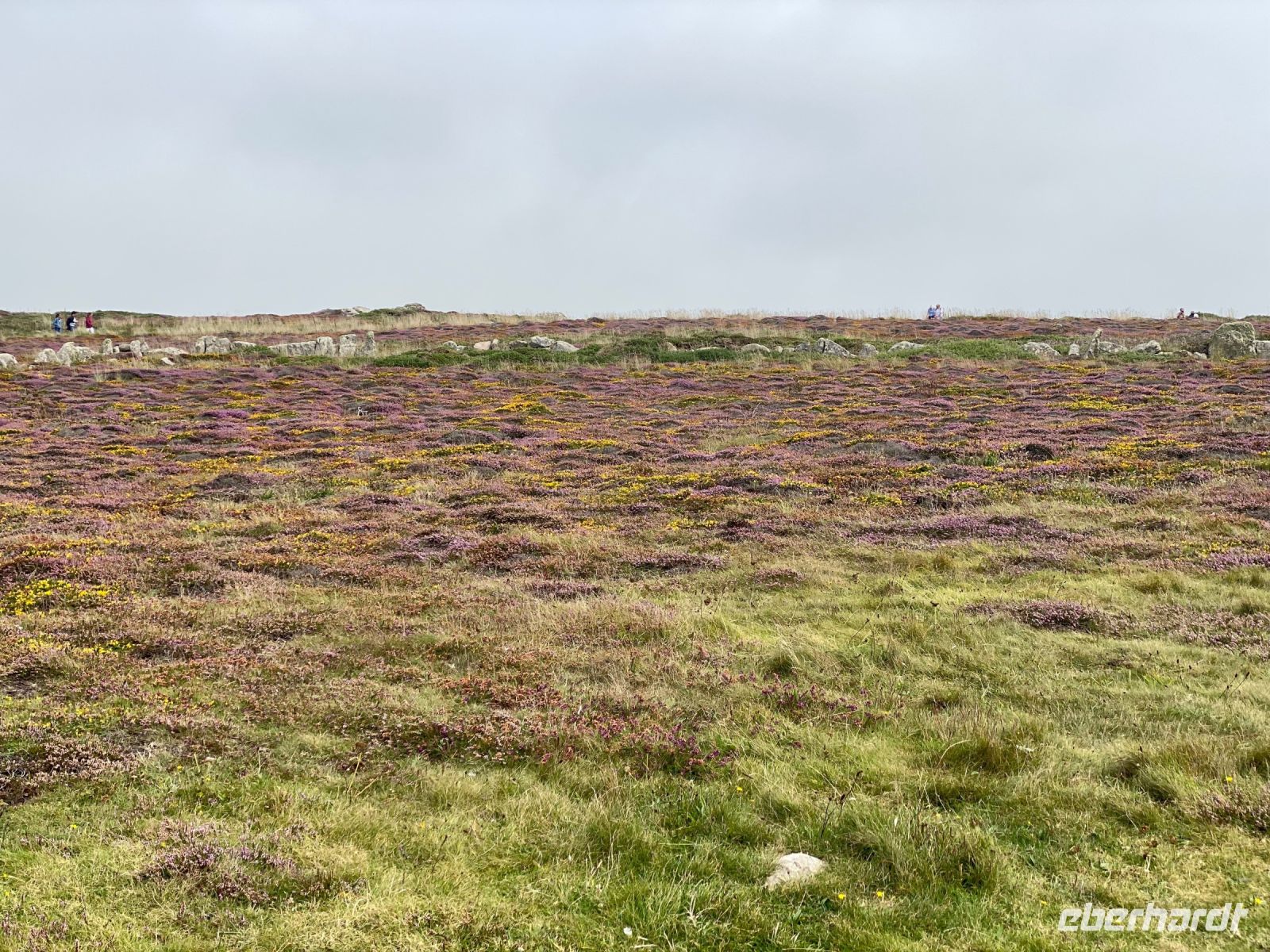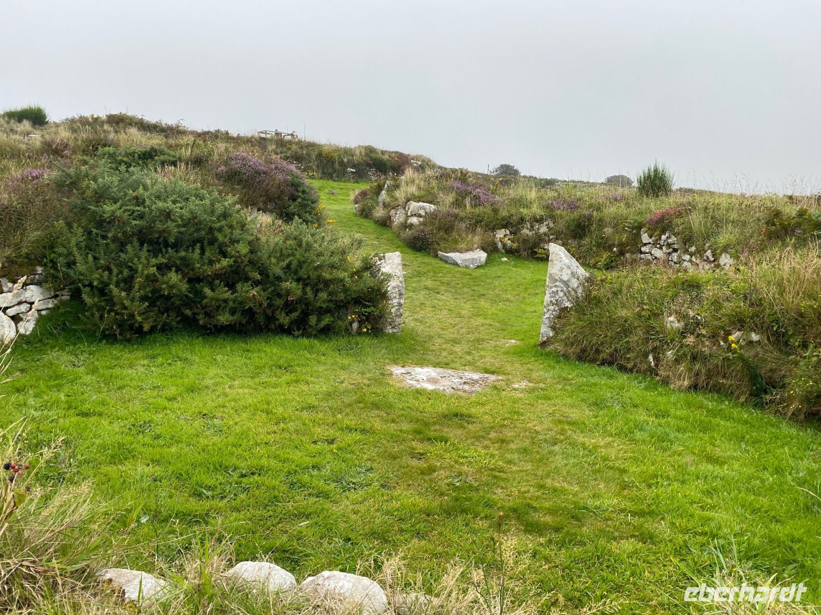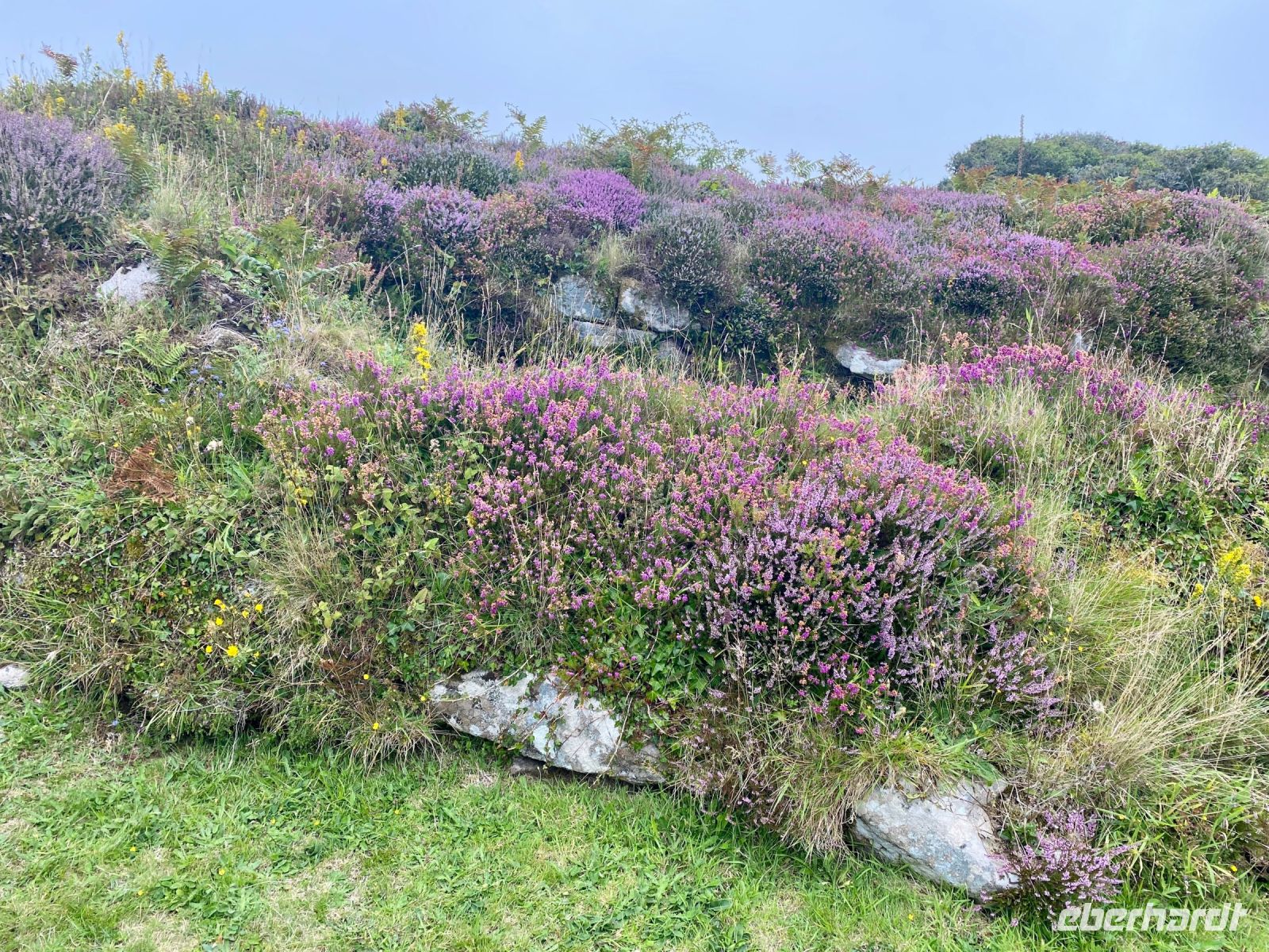 Zum Abschluss eines weiteren wunderschönen Tages geht es nun wieder zurück nach Osten in Richtung Penzance. Etwas oberhalb dieses Ortes liegen die Überreste einer über zwei Jahrtausende alten Siedlung. Auch hier wandern wir die die letzten Meter, der Bus wartet auf uns an einer kleinen Ausweiche zwischen Brombeersträuchern, einige Beeren sind schon reif. Ein Blütenmeer auf den alten Mauern der Siedlung belohnt uns für die kurze Strecke auf den Hügel an dem einst das alte Dorf von Chysauster stand.