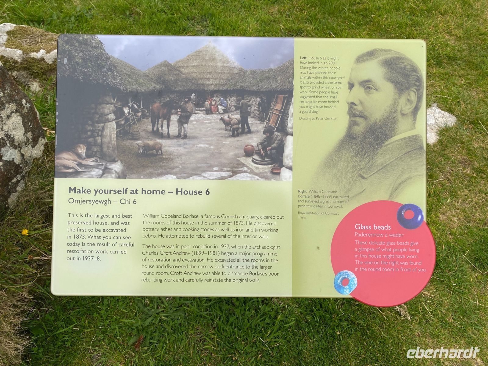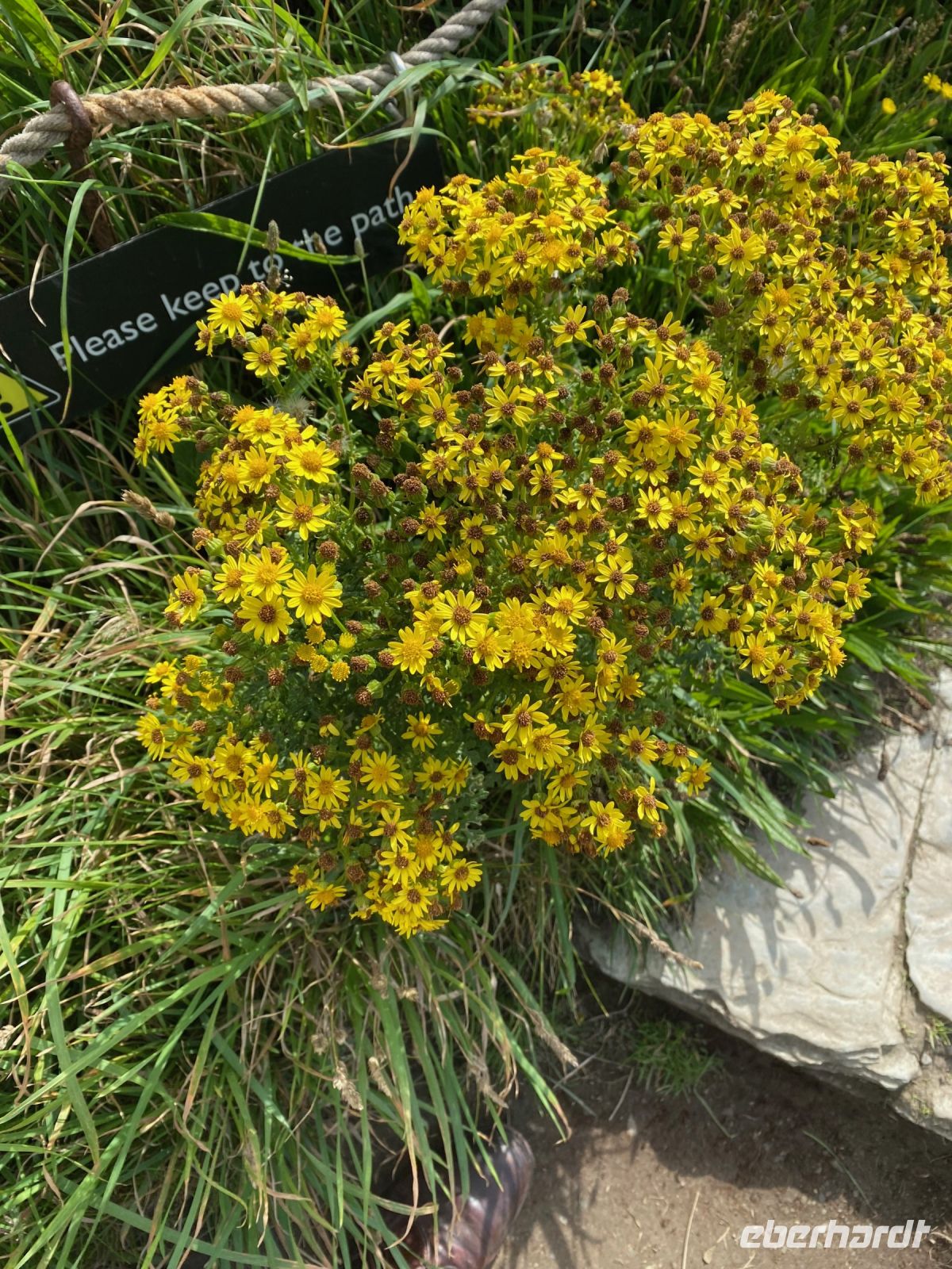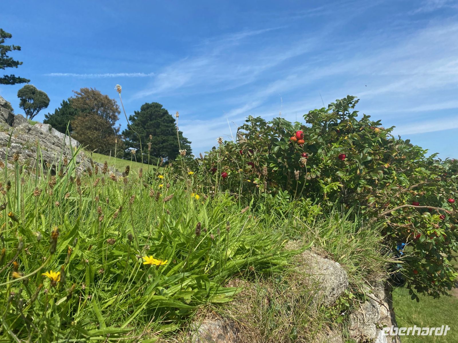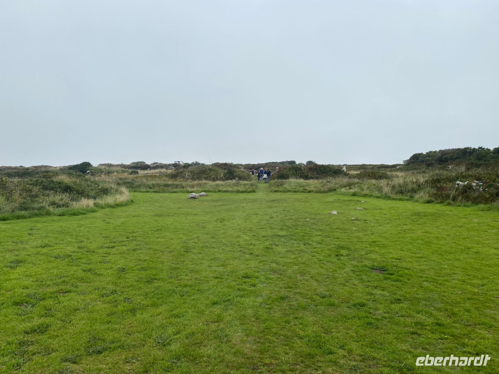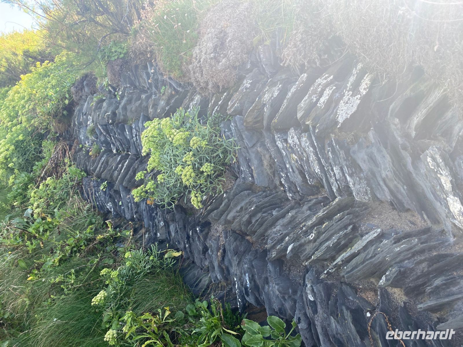 Zum Abschluss eines weiteren wunderschönen Tages geht es nun wieder zurück nach Osten in Richtung Penzance. Etwas oberhalb dieses Ortes liegen die Überreste einer über zwei Jahrtausende alten Siedlung. Auch hier wandern wir die die letzten Meter, der Bus wartet auf uns an einer kleinen Ausweiche zwischen Brombeersträuchern, einige Beeren sind schon reif. Ein Blütenmeer auf den alten Mauern der Siedlung belohnt uns für die kurze Strecke auf den Hügel an dem einst das alte Dorf von Chysauster stand.