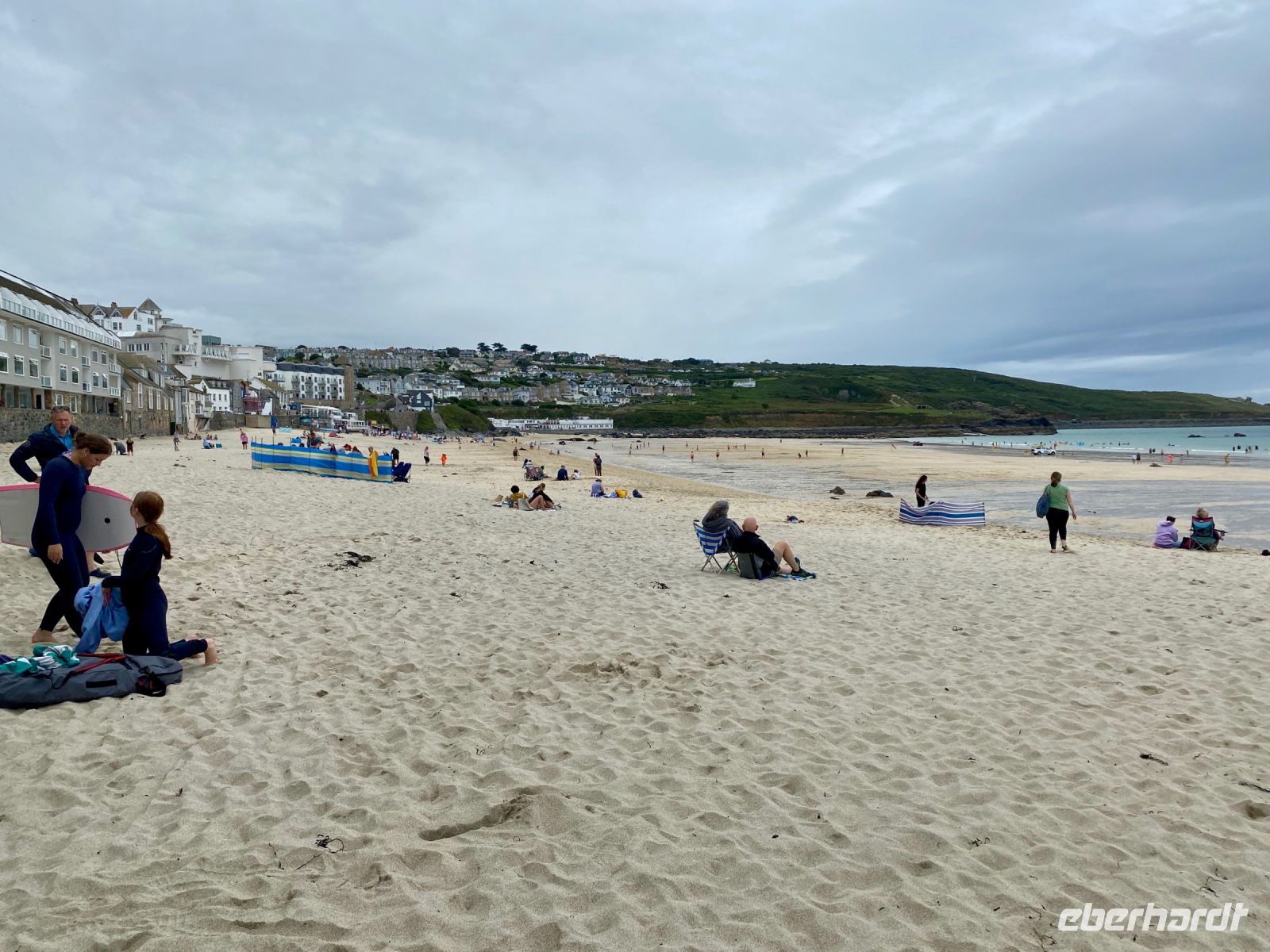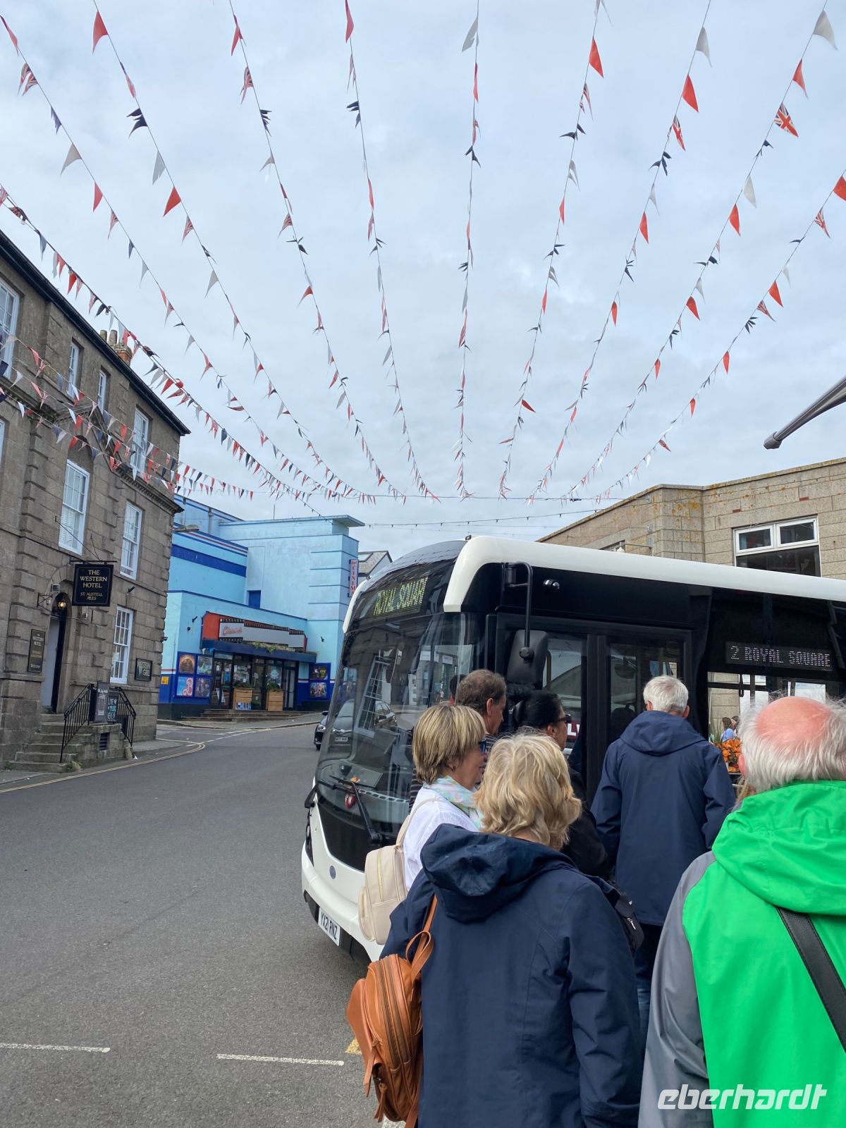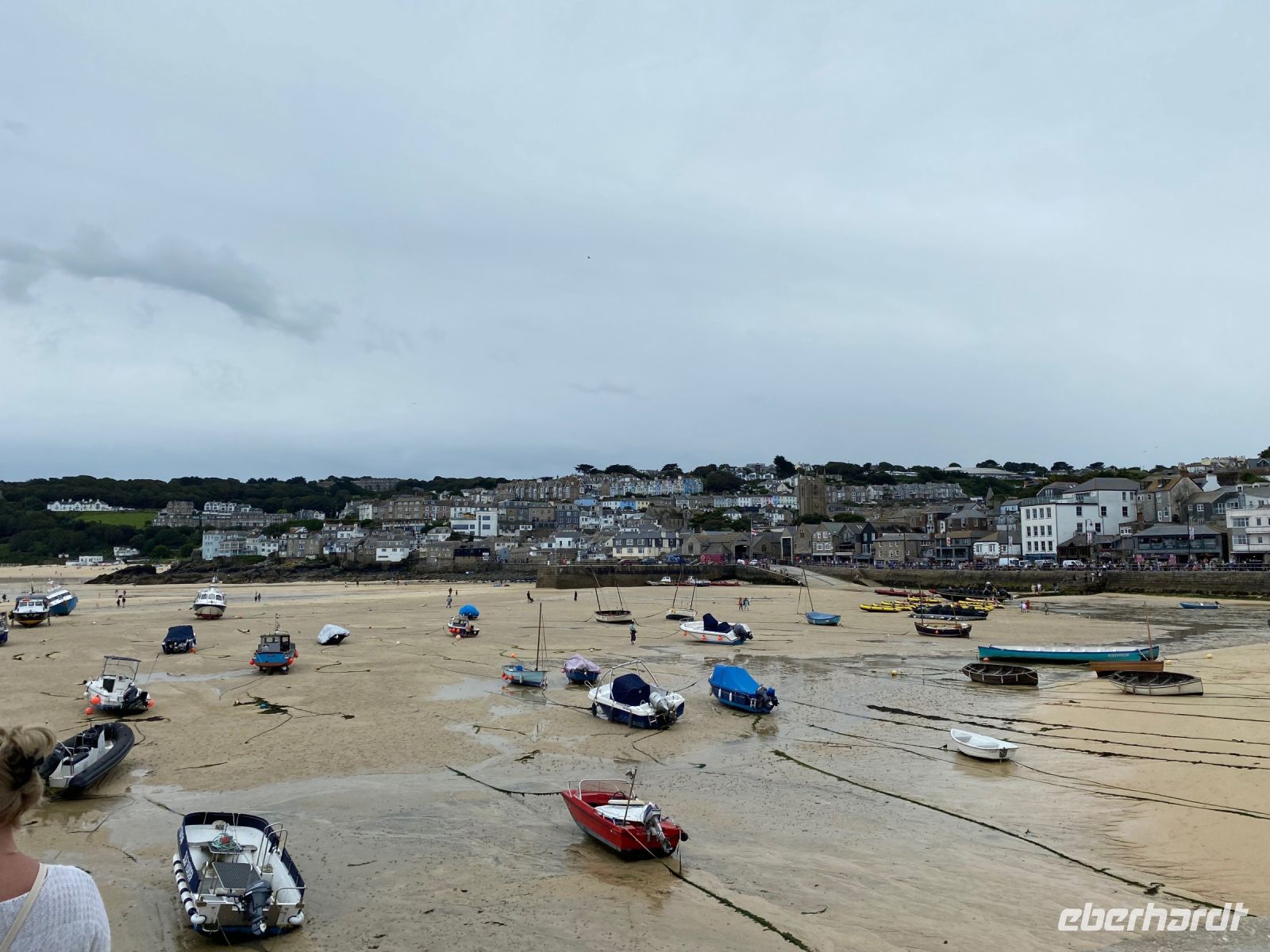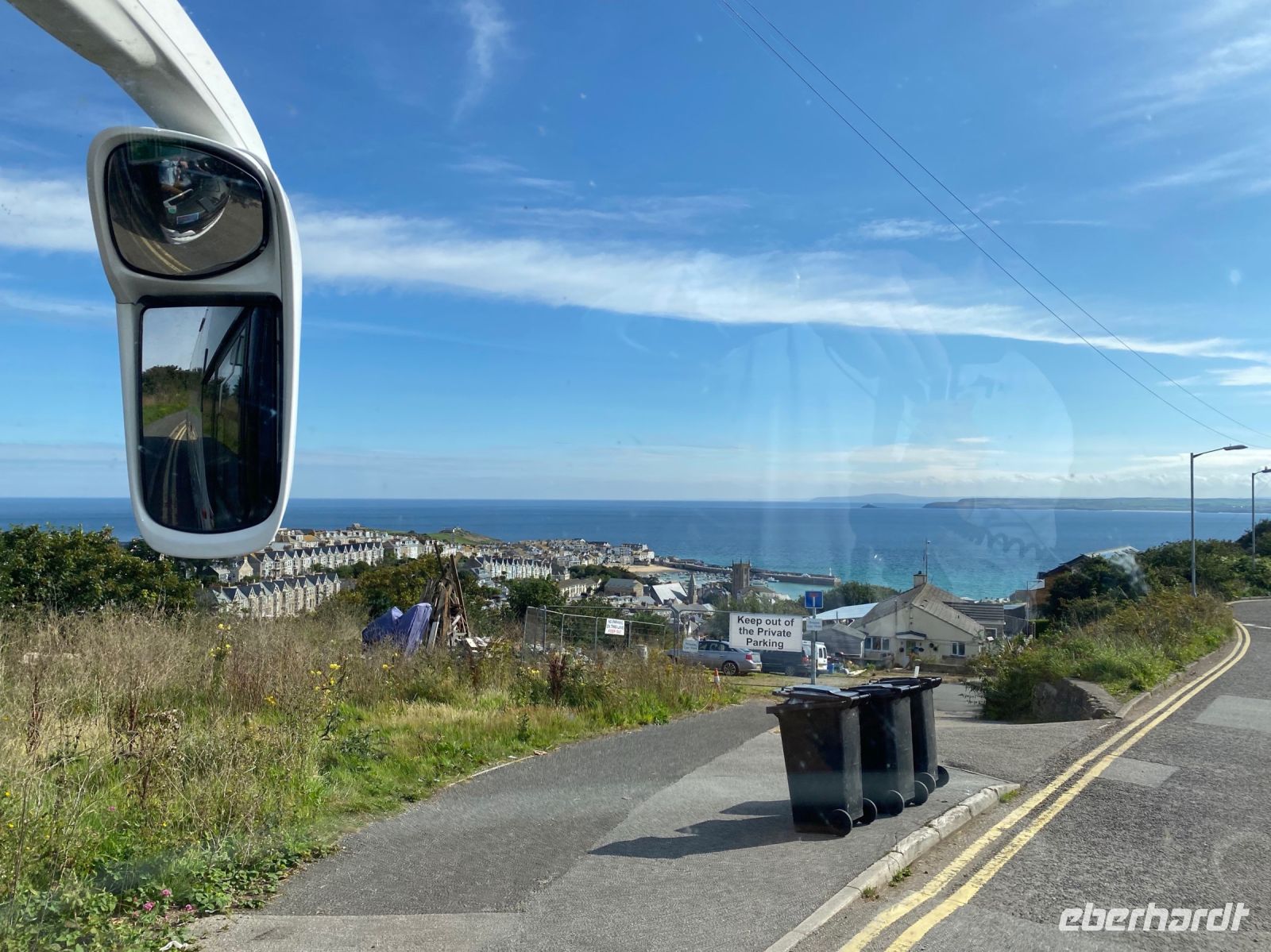 Während auf dem Atlantik längst ein Unwetter tobt, nutzen wir den bei uns noch sonnigen Vormittag zu einem Besuch von St. Ives. Hier ließen sich zahlreiche Künstler nieder, es gibt kleine und große Galerien, Strände und einen Fischerhafen – mit Ebbe! Mark bringt uns bis auf die Hügel über dem Ort, dann geht es mit einem kleinen Shuttlebus ins Zentrum. Pünktlich mit den ersten Regentropfen fahren wir zurück zu unserem Bus. Das schlechte Wetter hat nun auch uns erreicht.