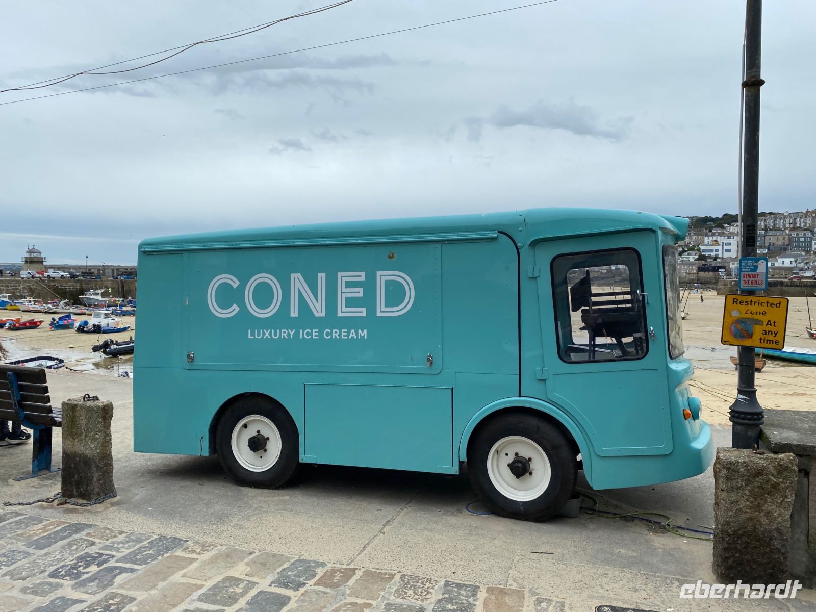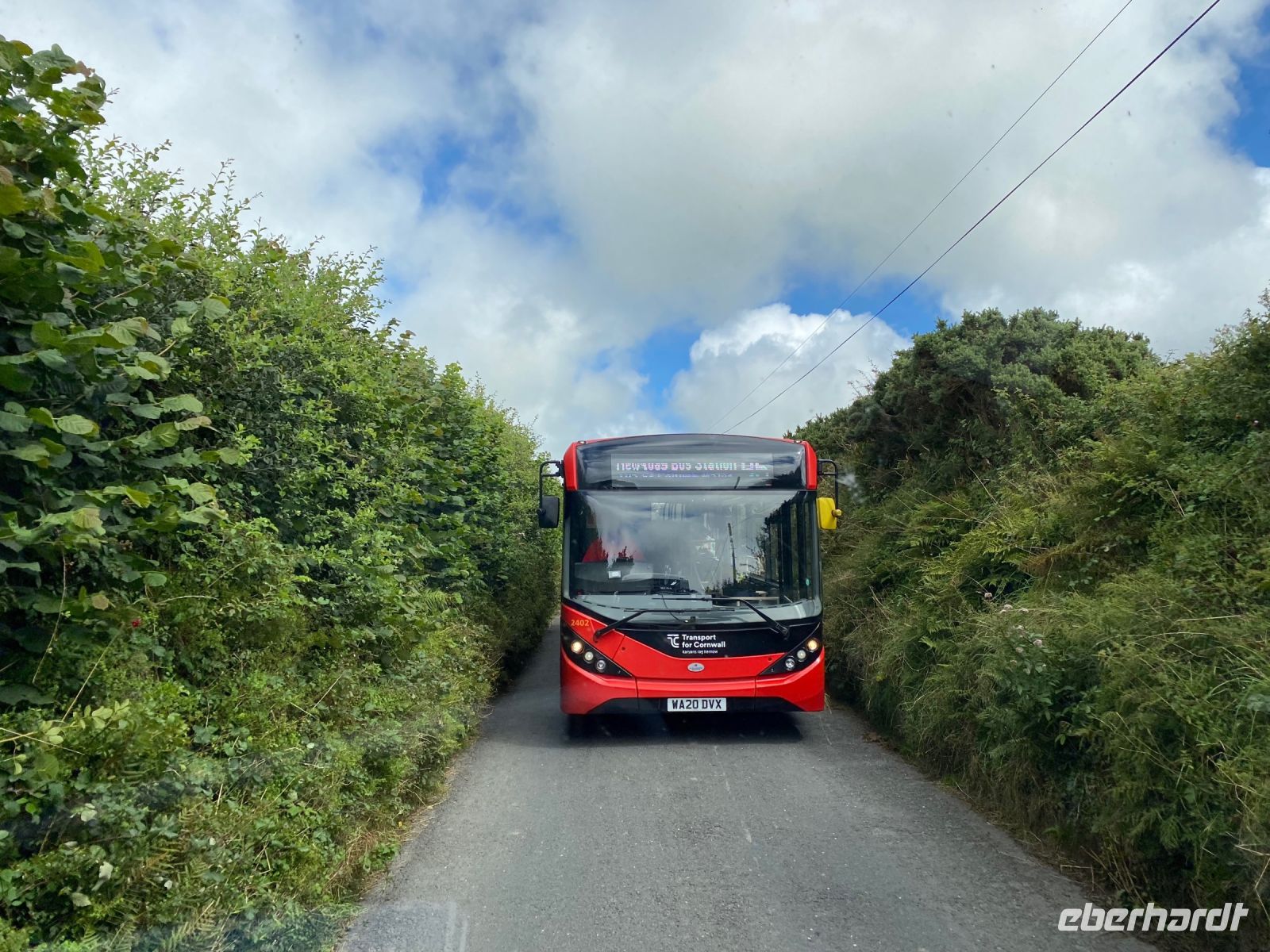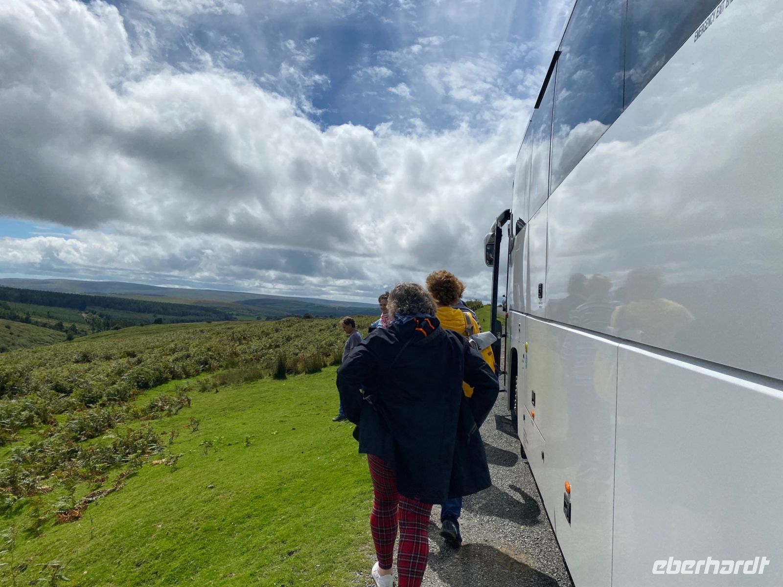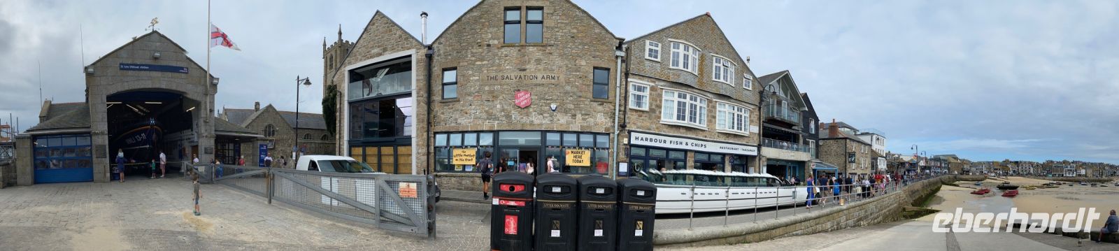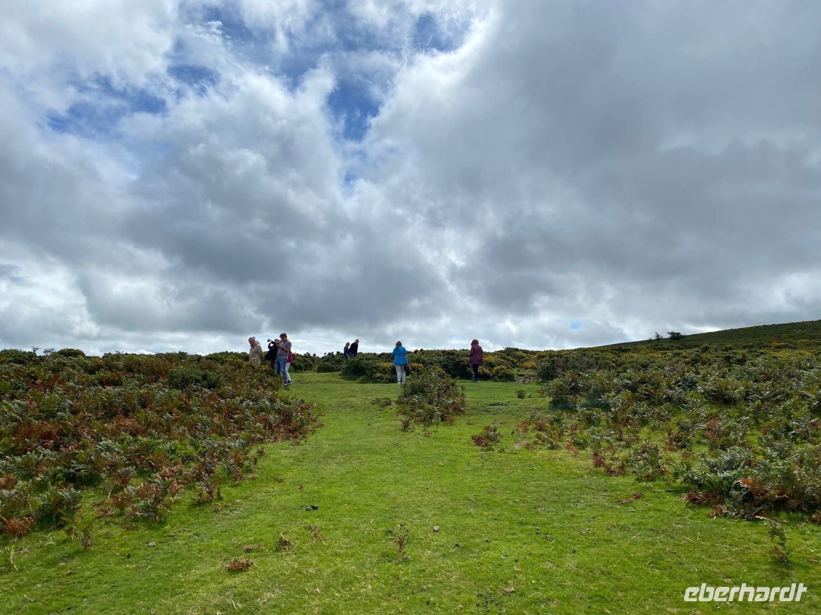Während auf dem Atlantik längst ein Unwetter tobt, nutzen wir den bei uns noch sonnigen Vormittag zu einem Besuch von St. Ives. Hier ließen sich zahlreiche Künstler nieder, es gibt kleine und große Galerien, Strände und einen Fischerhafen – mit Ebbe! Mark bringt uns bis auf die Hügel über dem Ort, dann geht es mit einem kleinen Shuttlebus ins Zentrum. Pünktlich mit den ersten Regentropfen fahren wir zurück zu unserem Bus. Das schlechte Wetter hat nun auch uns erreicht.