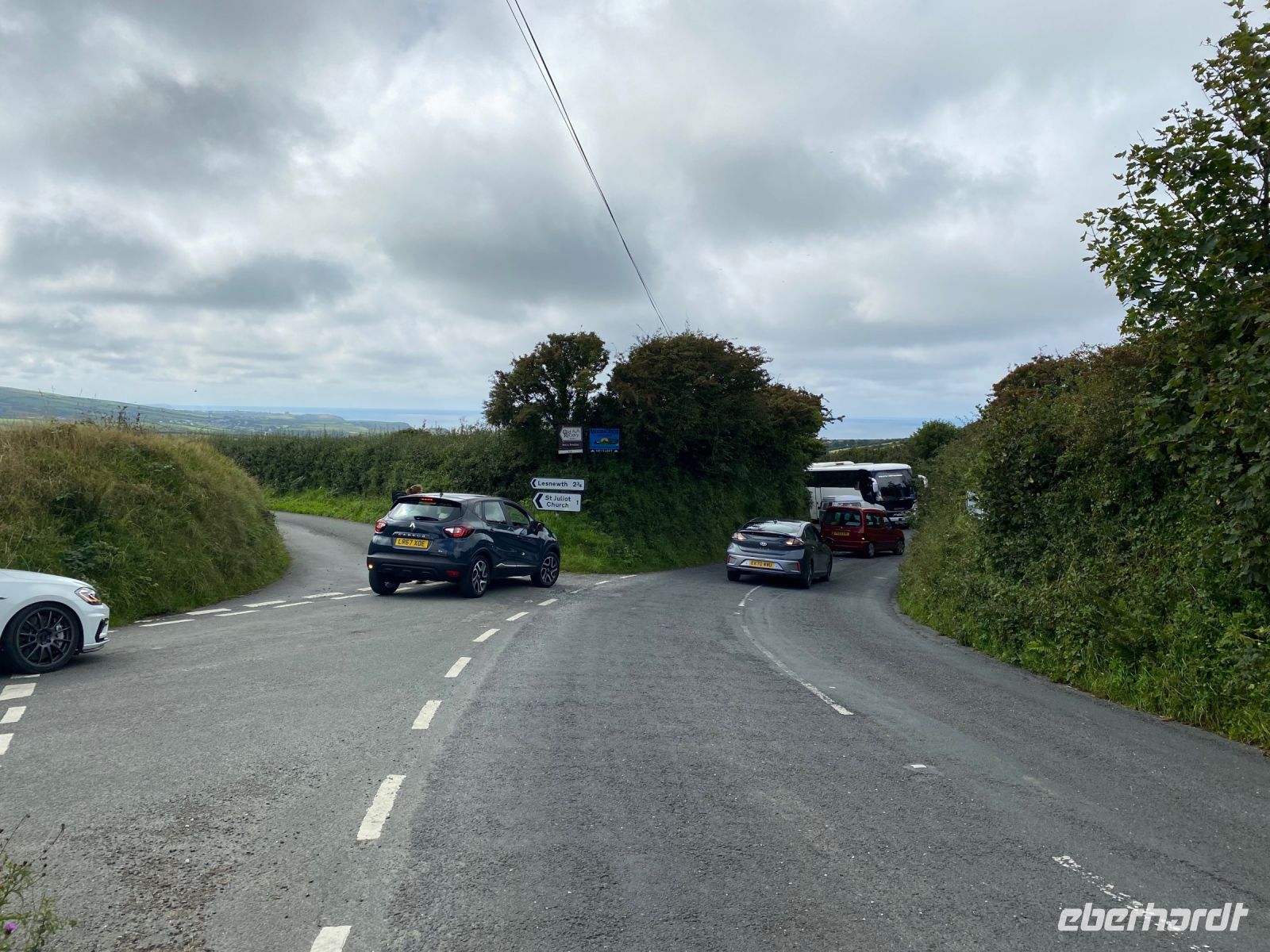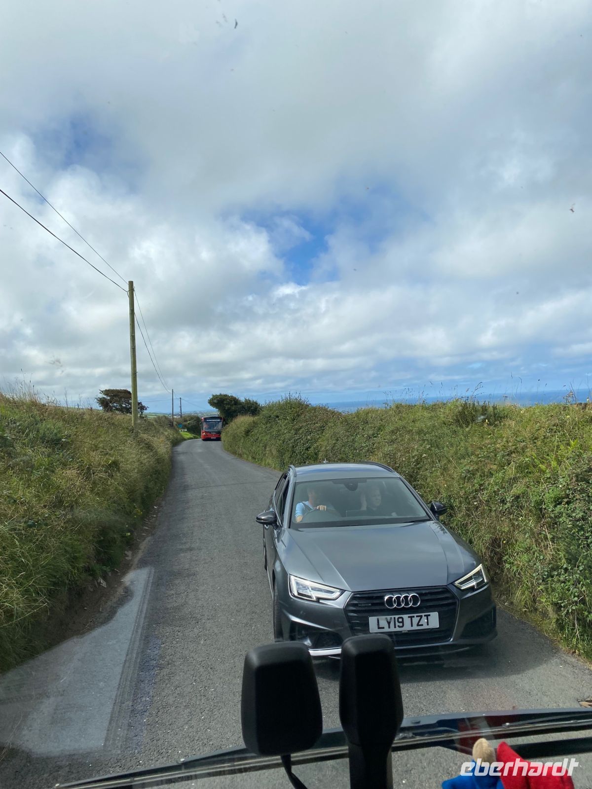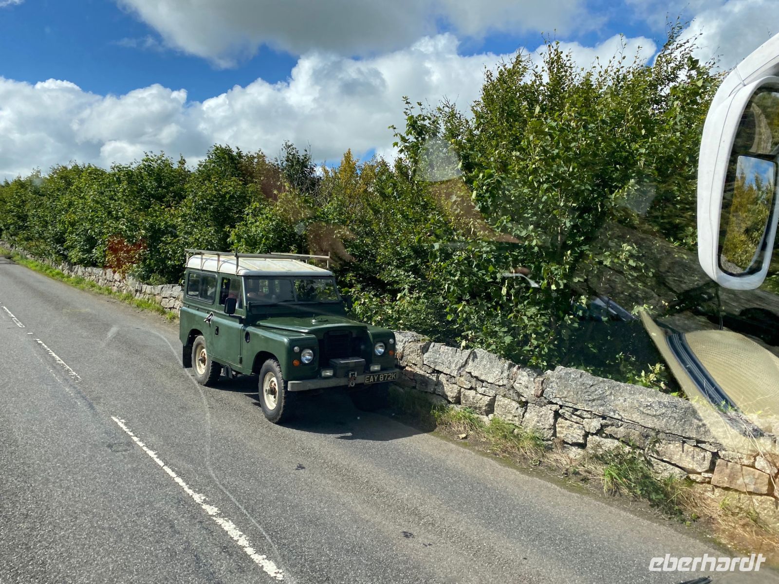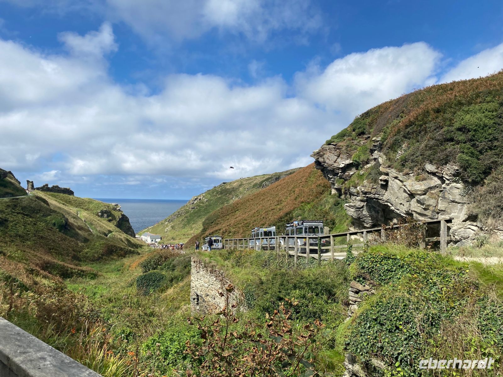 Schließlich ist es doch geschafft. Ohne den kleinsten Kratzer am Bus setzt unser Mark die Fahrt fort! Nun wissen wir jedenfalls, woher der Name Eng-Land stammen könnte. Es geht weiter nach Tintagel: Hier gibt es einen gut erreichbaren großen Parkplatz. Nach kurzem Fußweg kann unsere Gruppe direkt in stilvolle Land Rover Defender umsteigen, die uns an einer Karawane von Touristen vorbei nahe an den Eingang der Burgruine fahren.