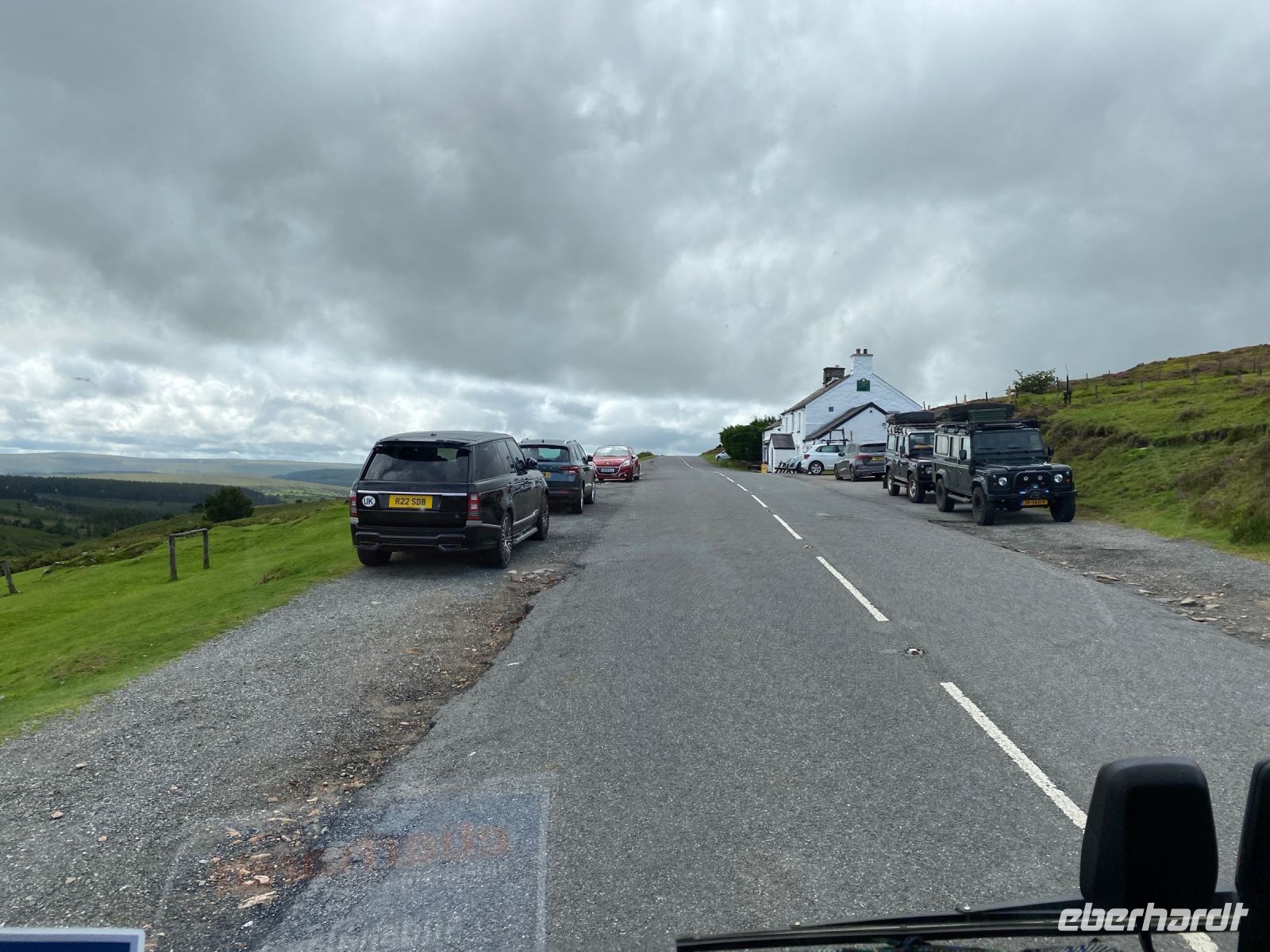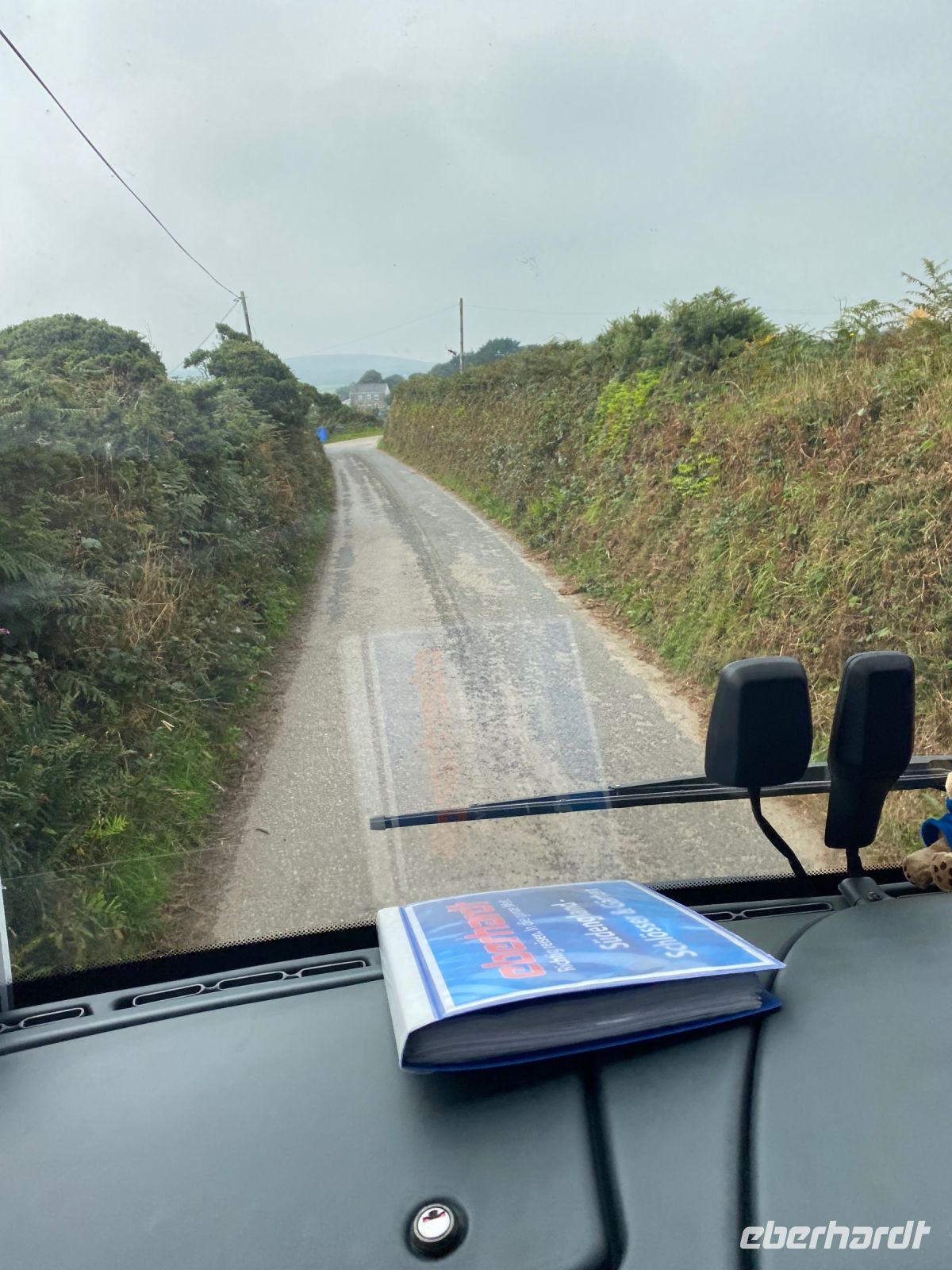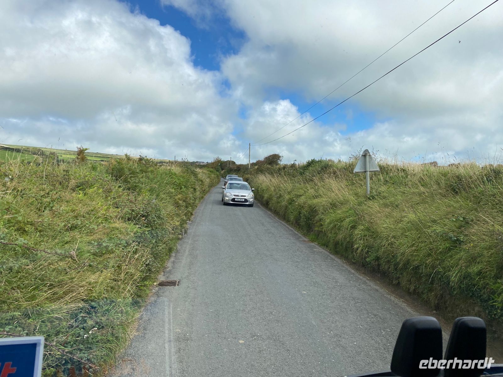 Schließlich ist es doch geschafft. Ohne den kleinsten Kratzer am Bus setzt unser Mark die Fahrt fort! Nun wissen wir jedenfalls, woher der Name Eng-Land stammen könnte. Es geht weiter nach Tintagel: Hier gibt es einen gut erreichbaren großen Parkplatz. Nach kurzem Fußweg kann unsere Gruppe direkt in stilvolle Land Rover Defender umsteigen, die uns an einer Karawane von Touristen vorbei nahe an den Eingang der Burgruine fahren.